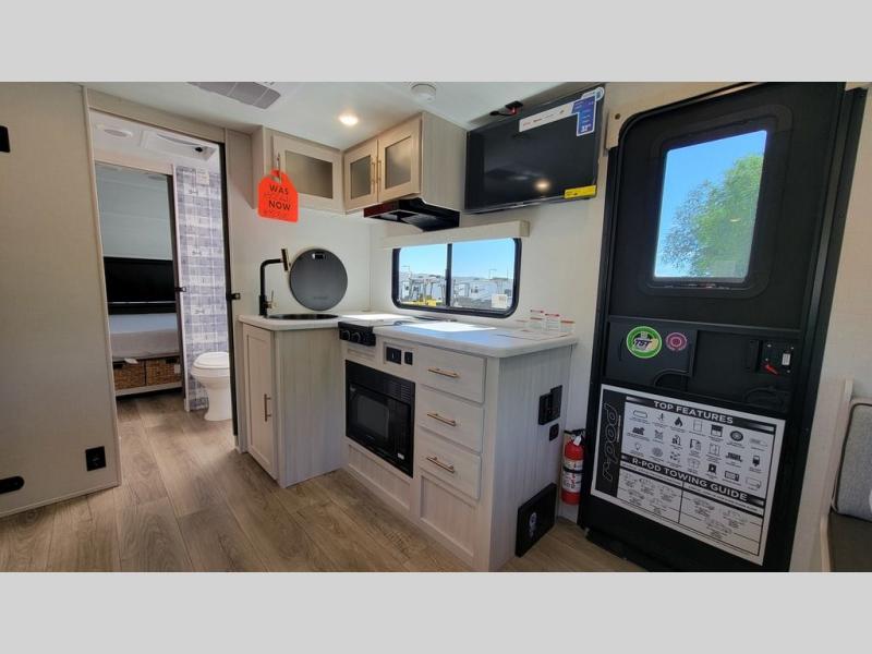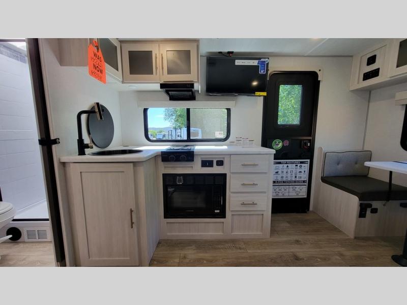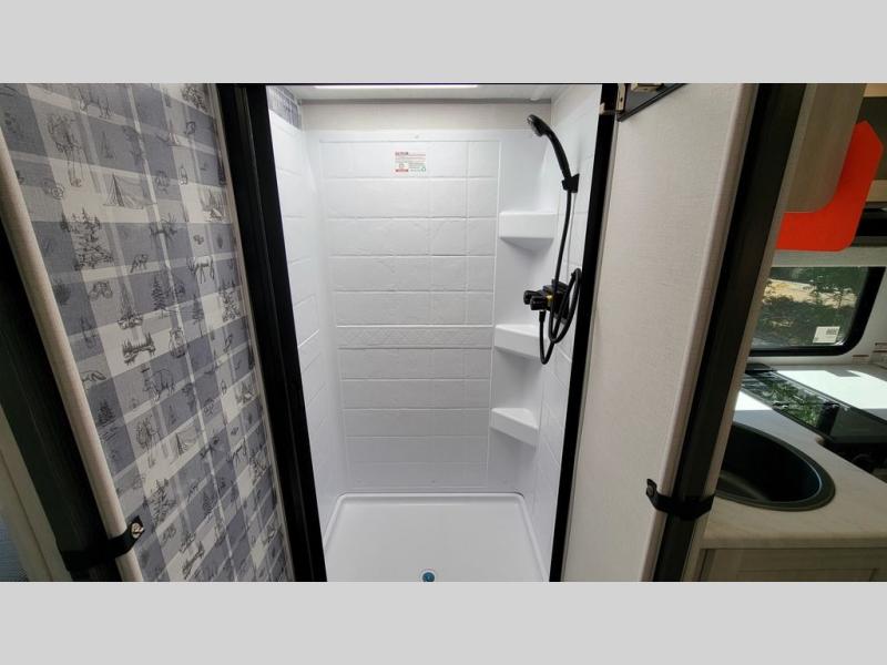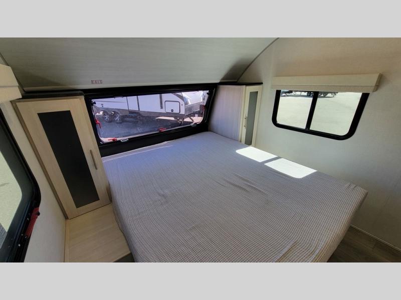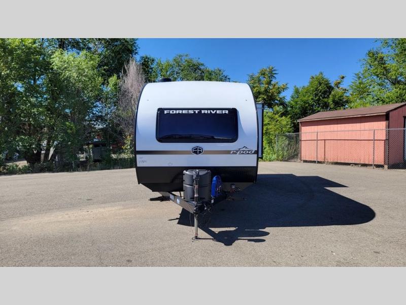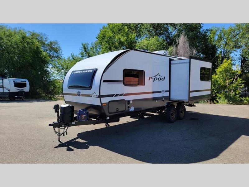 With any R-Pod travel trailer by Forest River, you will enjoy affordable luxury at the lowest tow weight in its class! There is a sealed underbelly with forced heat, a curved dual-pane acrylic front window with a bug screen and night shade, plus a large roof mounted solar panel for off-grid capabilities. The 15K A/C unit will keep you comfortable during the summer camping months, and the tankless water heater will provide endless hot showers after hiking, biking, swimming and more! Each model also includes a black glass friction hinge entrance door, roof ladder prep, exterior motion lighting, plus a hot and cold exterior spray port to wash off sand from the beach. Inside, you'll enjoy seamless Surf-X kitchen countertops, blackout roller shades, and a central vacuum system for hassle-free cleaning!