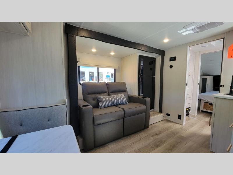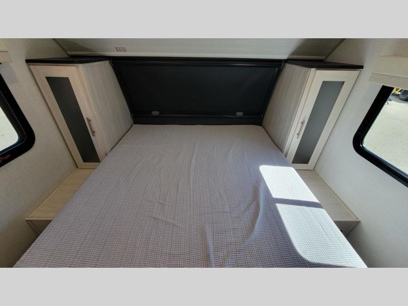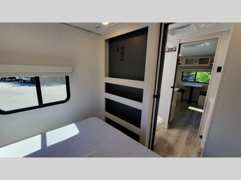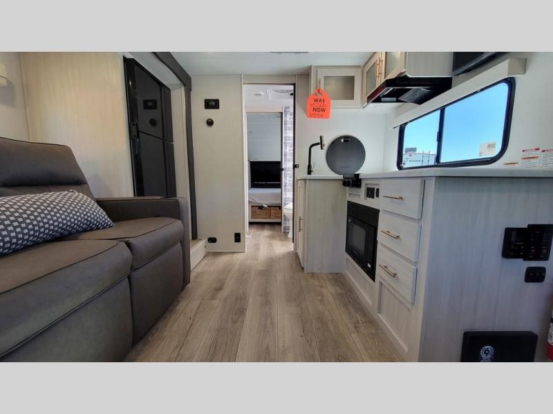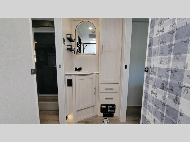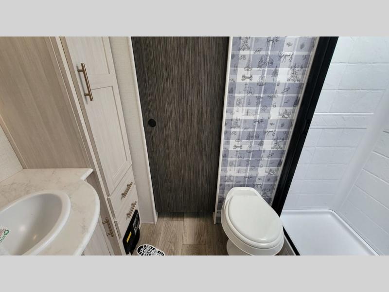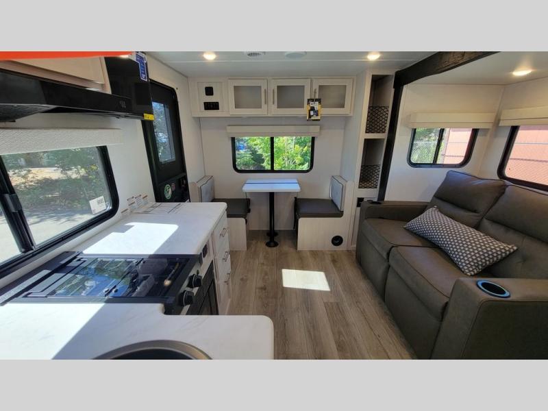 Whether you spend your days at the lake or in the woods, you'll be met with comfort in this spacious travel trailer. There is a rear dinette where you can enjoy your meals together, a 56" theater seat across from a 12V TV, and a slide out for added space. The walk-thru bath includes a night light for easy nighttime use, and the front master bedroom includes a queen bed just like at home. There are also dual wardrobes and end tables plus an entertainment center if you want to add a TV. Outside, you'll find a rear accessory hitch, a 14' awning, and a slam latch cargo doors to keep your gear secure. This model also includes the Hood River Edition that comes with Mud Legend all terrain tires with TPMS, a MaxxAir vent cover, and 12V tank heaters!