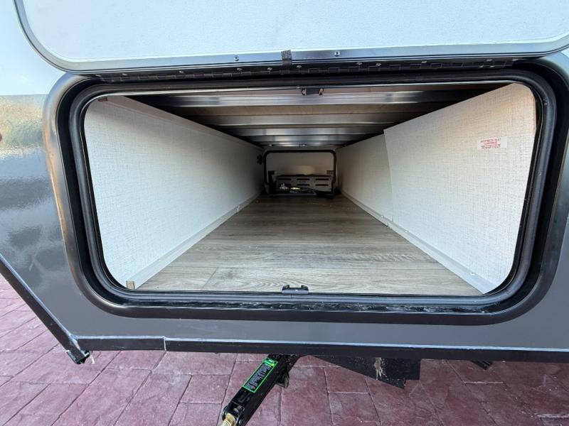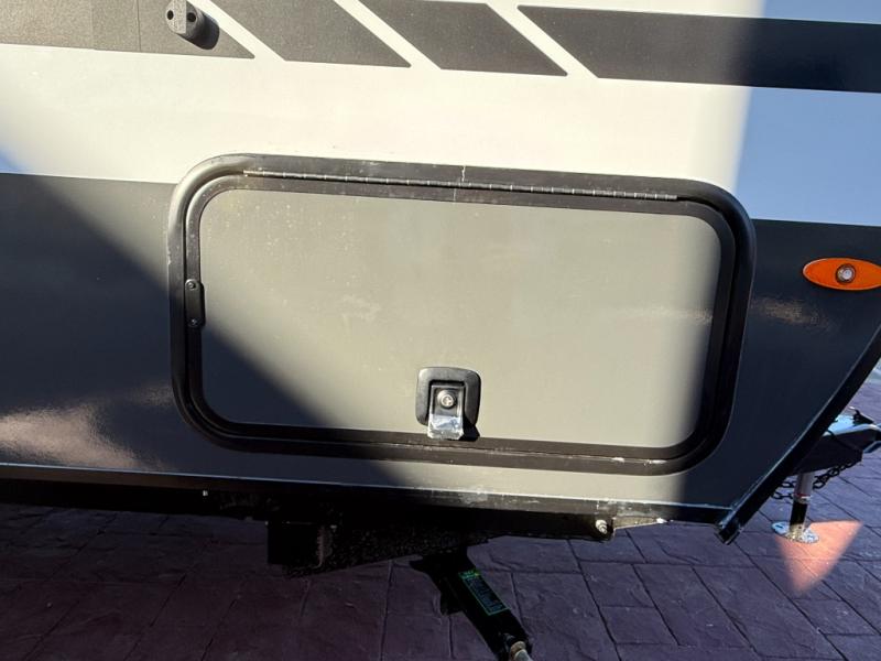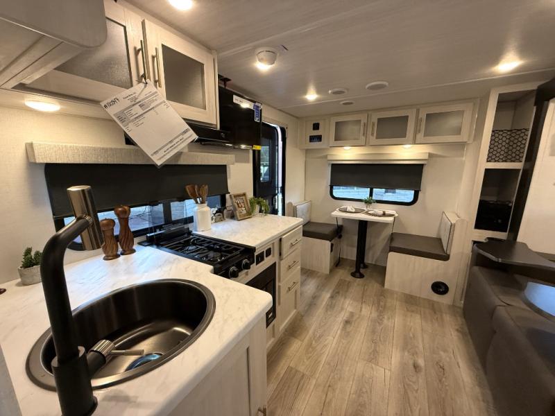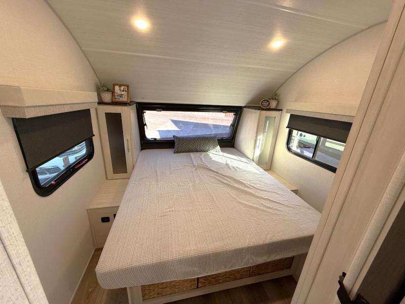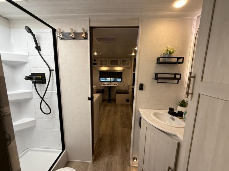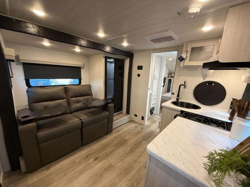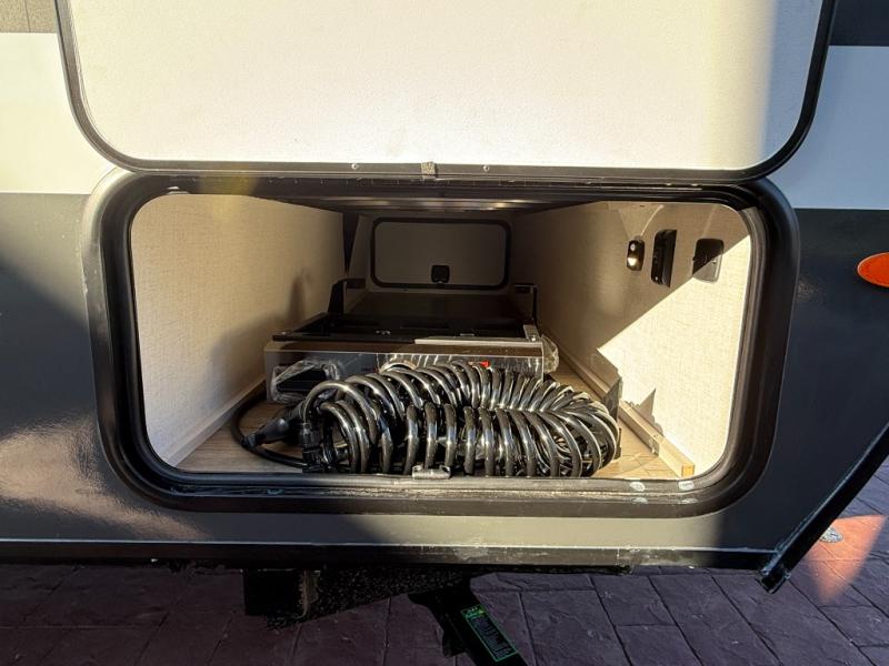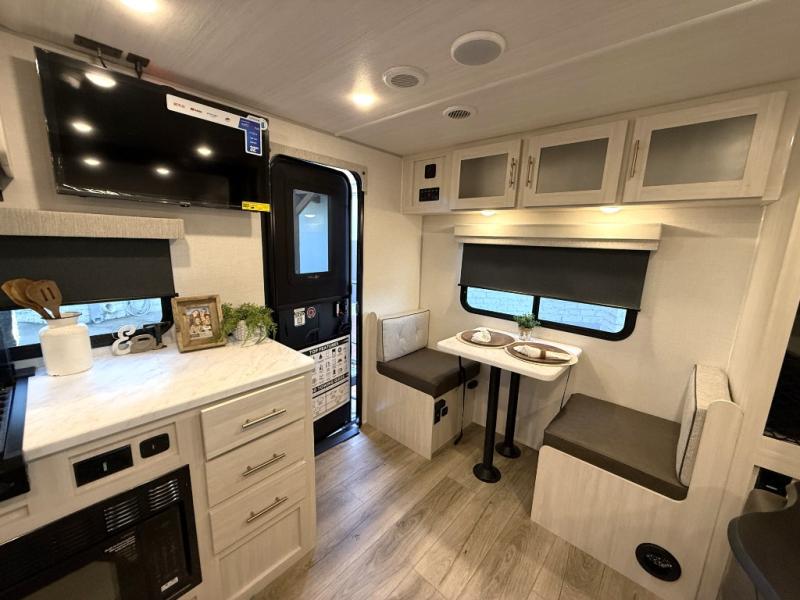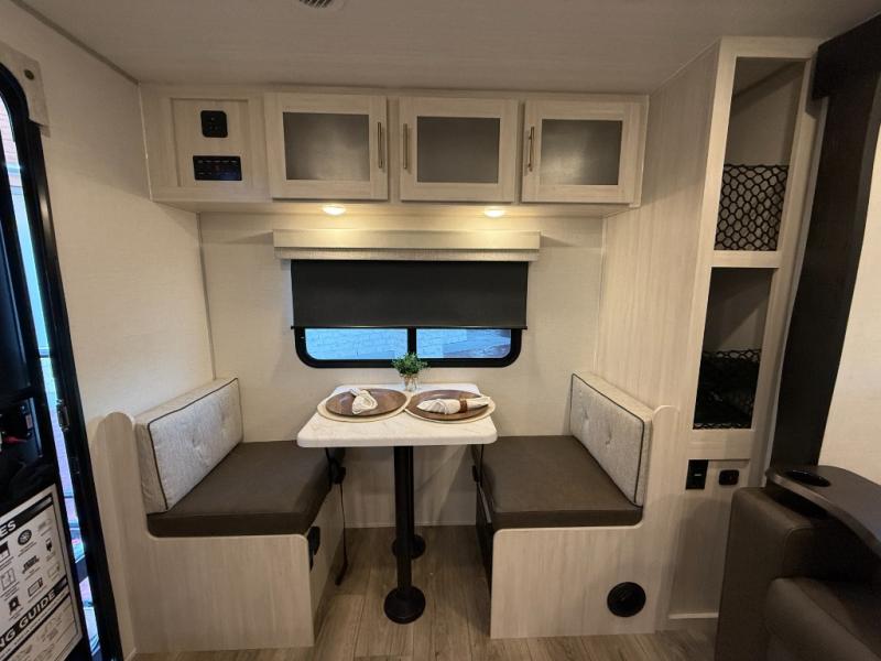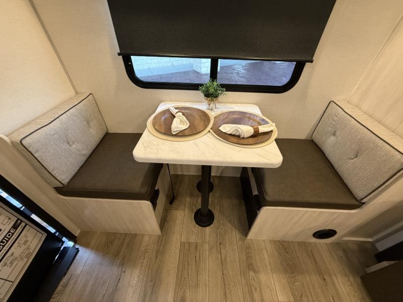 Whether you spend your days at the lake or in the woods, you'll be met with comfort in this spacious travel trailer. There is a rear dinette where you can enjoy your meals together, a 56" theater seat across from a 12V TV, and a slide out for added space. The walk-through bath includes a night light for easy nighttime use, and the front master bedroom includes a queen bed just like at home. There are also dual wardrobes and end tables plus an entertainment center if you want to add a TV. Outside, you'll find a rear accessory hitch, upgraded tires with TPMS, a 14' awning, and a slam latch cargo doors to keep your gear secure.