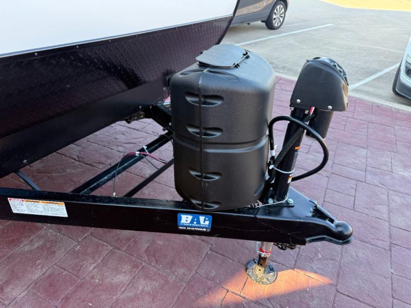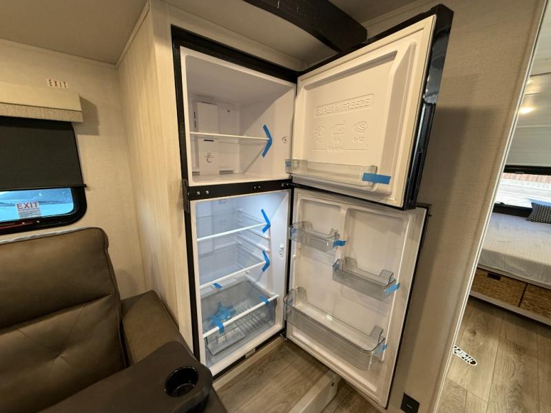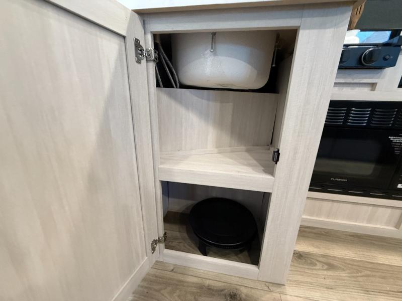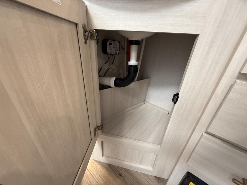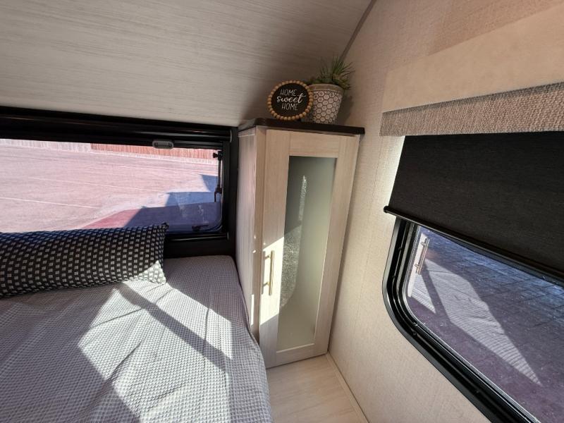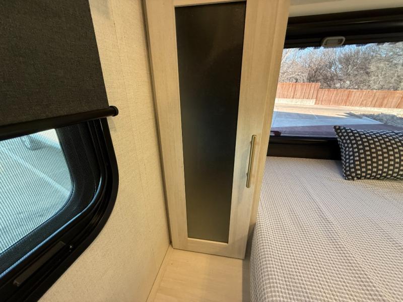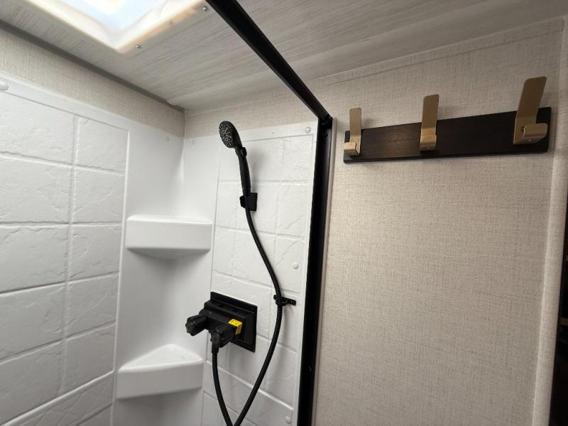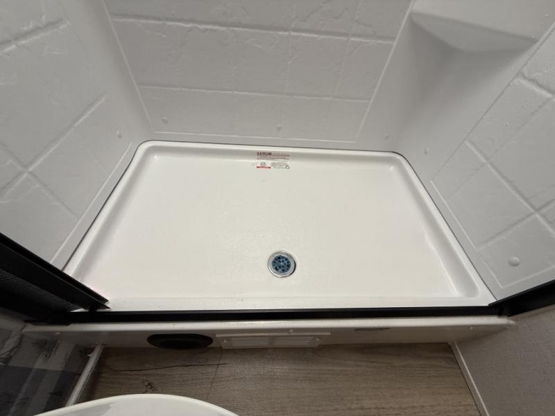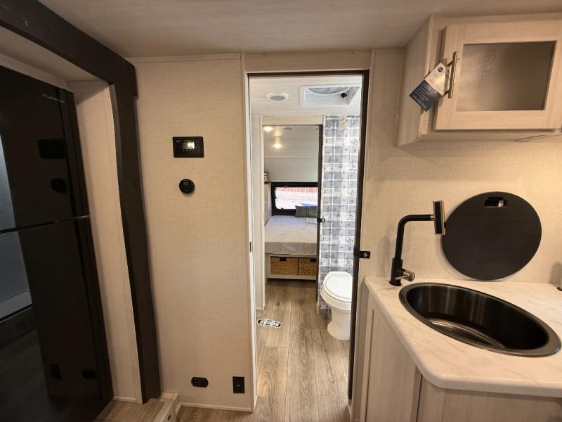 Whether you spend your days at the lake or in the woods, you'll be met with comfort in this spacious travel trailer. There is a rear dinette where you can enjoy your meals together, a 56" theater seat across from a 12V TV, and a slide out for added space. The walk-through bath includes a night light for easy nighttime use, and the front master bedroom includes a queen bed just like at home. There are also dual wardrobes and end tables plus an entertainment center if you want to add a TV. Outside, you'll find a rear accessory hitch, upgraded tires with TPMS, a 14' awning, and a slam latch cargo doors to keep your gear secure.
