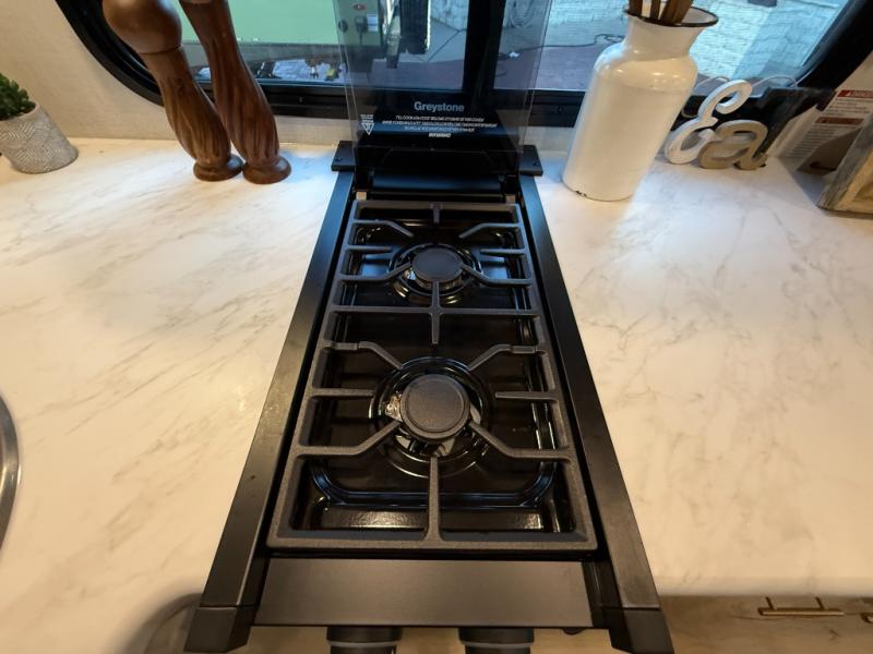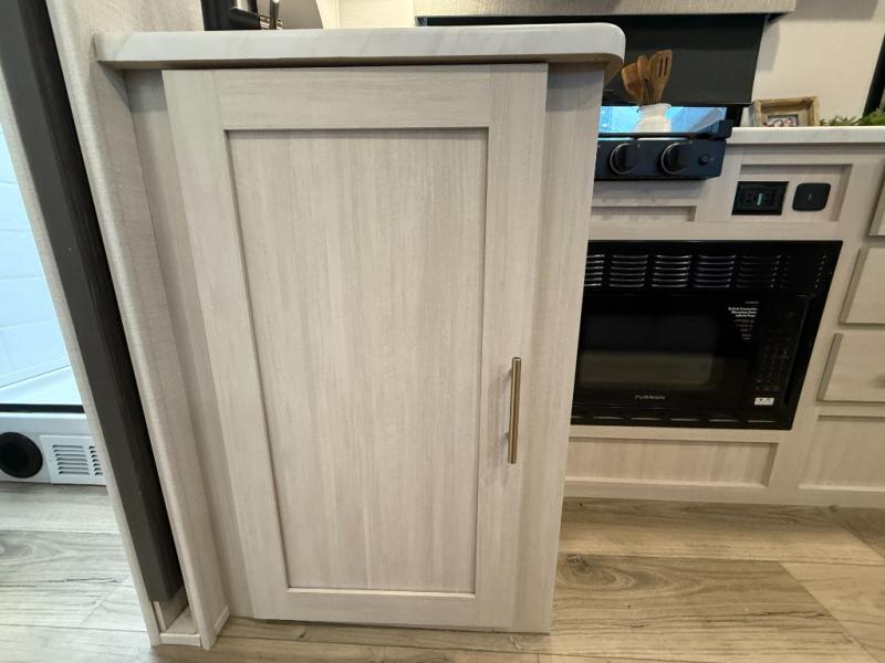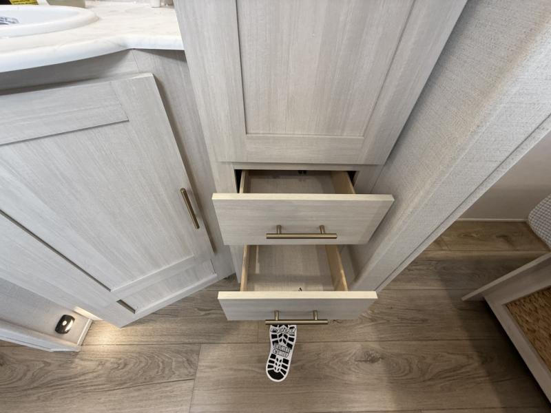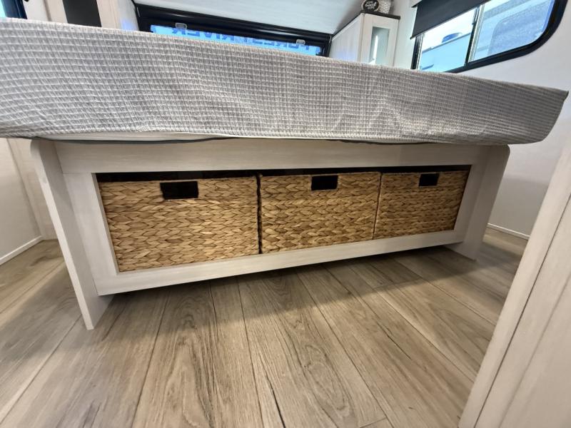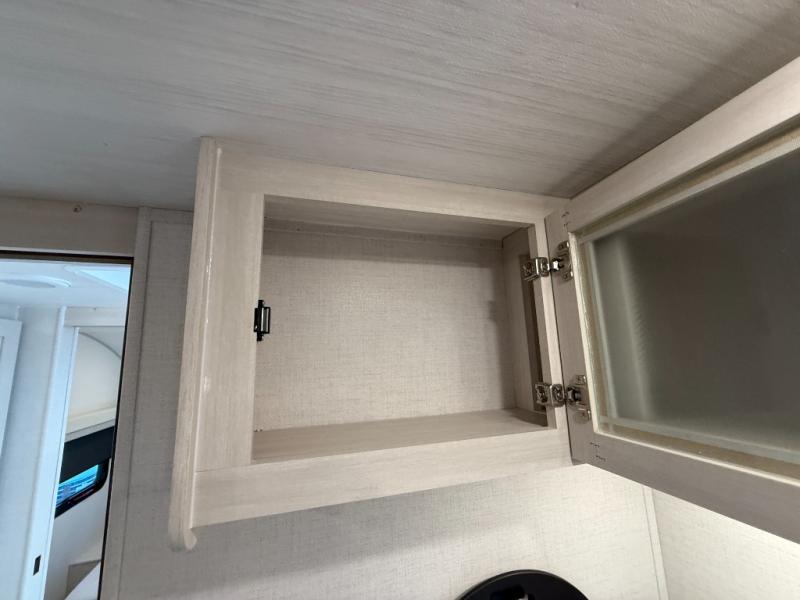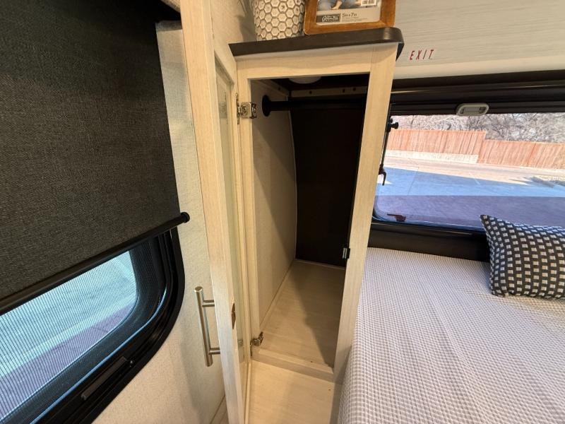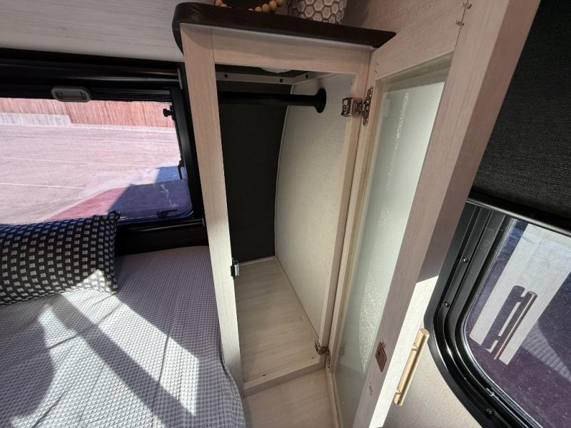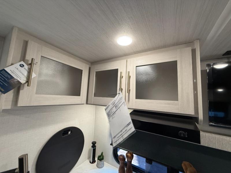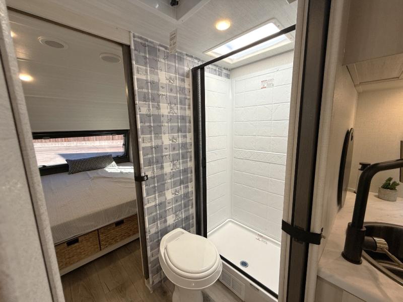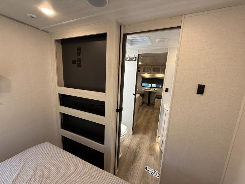 Whether you spend your days at the lake or in the woods, you'll be met with comfort in this spacious travel trailer. There is a rear dinette where you can enjoy your meals together, a 56" theater seat across from a 12V TV, and a slide out for added space. The walk-through bath includes a night light for easy nighttime use, and the front master bedroom includes a queen bed just like at home. There are also dual wardrobes and end tables plus an entertainment center if you want to add a TV. Outside, you'll find a rear accessory hitch, upgraded tires with TPMS, a 14' awning, and a slam latch cargo doors to keep your gear secure.