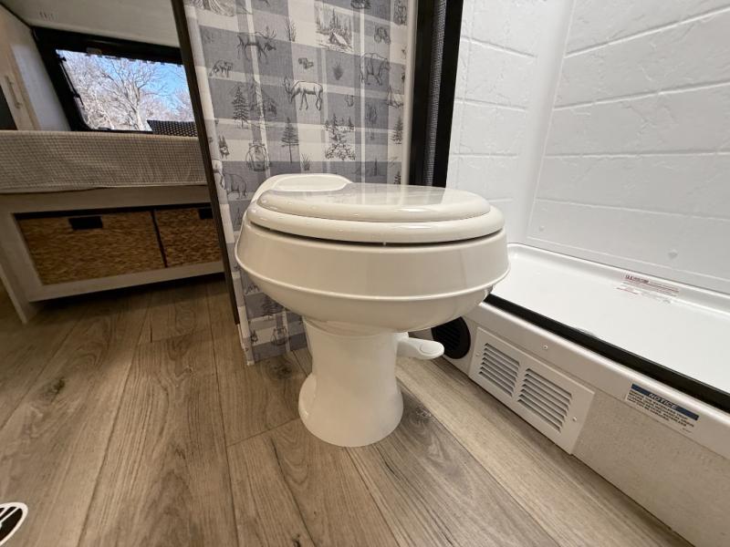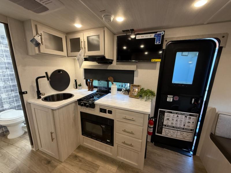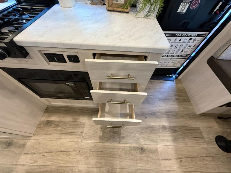 With any R-Pod travel trailer by Forest River, you will enjoy affordable luxury at the lowest tow weight in its class! There is a sealed underbelly with forced heat, a curved dual-pane acrylic front window with a bug screen and night shade, plus a large roof mounted solar panel for off-grid capabilities. The 15K A/C unit will keep you comfortable during the summer camping months, and the tankless water heater will provide endless hot showers after hiking, biking, swimming and more! Each model also includes a black glass friction hinge entrance door, roof ladder prep, exterior motion lighting, plus a hot and cold exterior spray port to wash off sand from the beach. Inside, you'll enjoy seamless Surf-X kitchen countertops, blackout roller shades, and a central vacuum system for hassle-free cleaning!