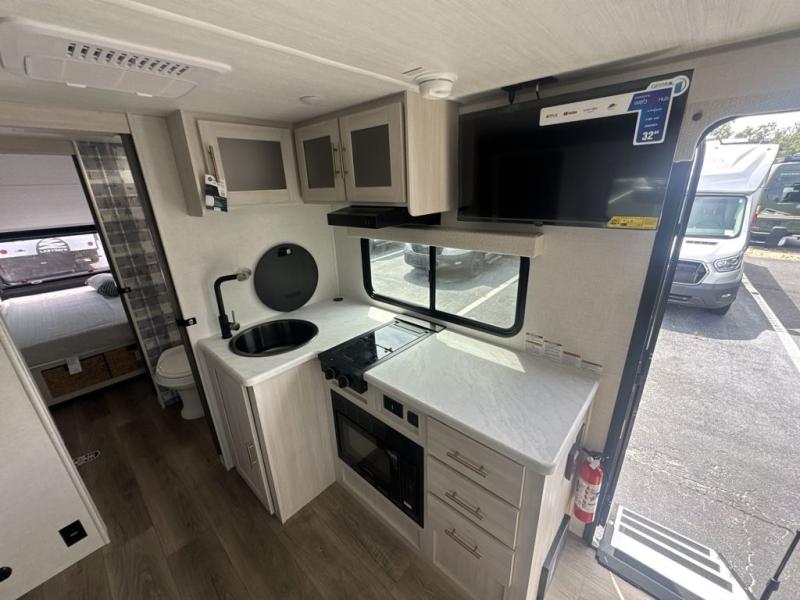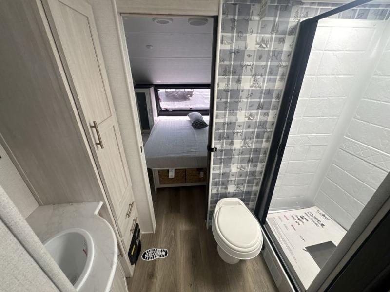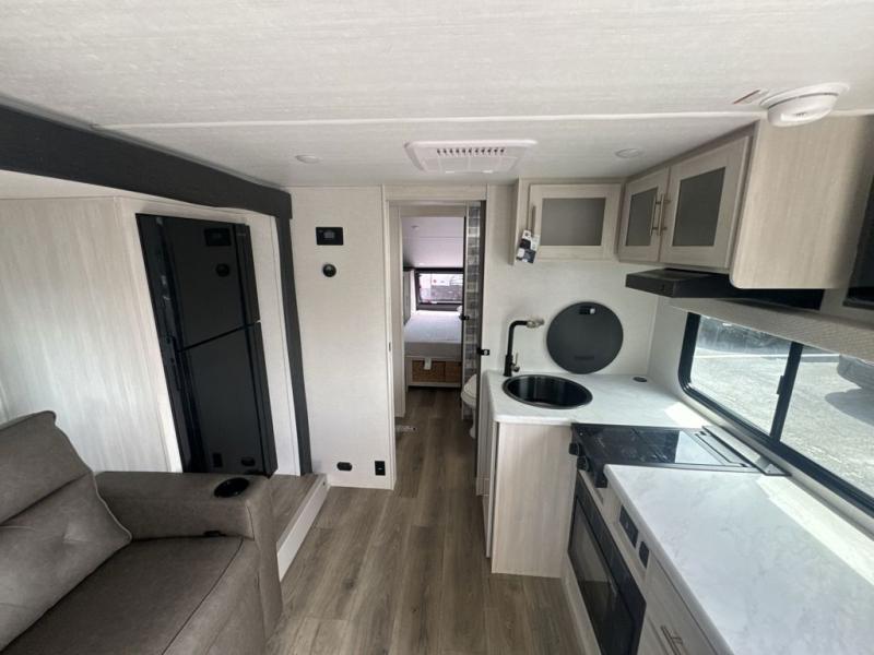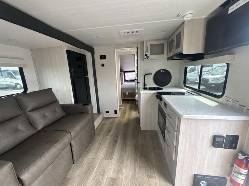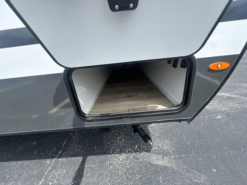 Whether you spend your days at the lake or in the woods, you'll be met with comfort in this spacious travel trailer. There is a rear dinette where you can enjoy your meals together, a 56" theater seat across from a 12V TV, and a slide out for added space. The walk-through bath includes a night light for easy nighttime use, and the front master bedroom includes a queen bed just like at home. There are also dual wardrobes and end tables plus an entertainment center if you want to add a TV. Outside, you'll find a rear accessory hitch, upgraded tires with TPMS, a 14' awning, and a slam latch cargo doors to keep your gear secure.