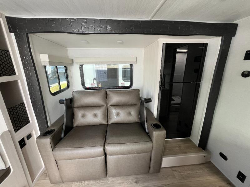Whether you spend your days at the lake or in the woods, you'll be met with comfort in this spacious travel trailer. There is a rear dinette where you can enjoy your meals together, a 56" theater seat across from a 12V TV, and a slide out for added space. The walk-through bath includes a night light for easy nighttime use, and the front master bedroom includes a queen bed just like at home. There are also dual wardrobes and end tables plus an entertainment center if you want to add a TV. Outside, you'll find a rear accessory hitch, upgraded tires with TPMS, a 14' awning, and a slam latch cargo doors to keep your gear secure.