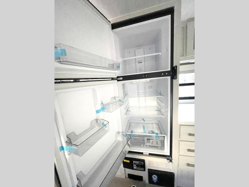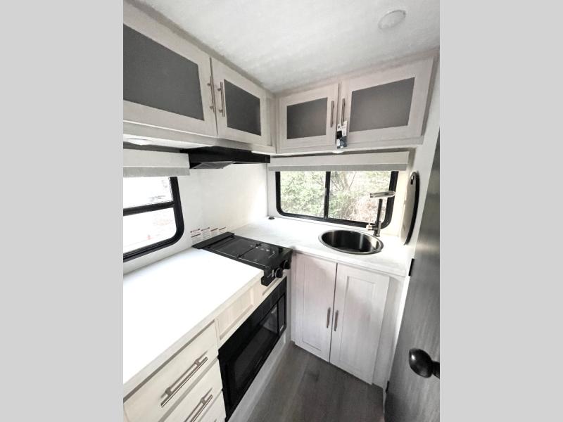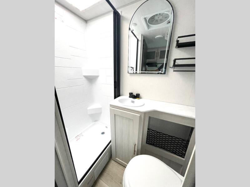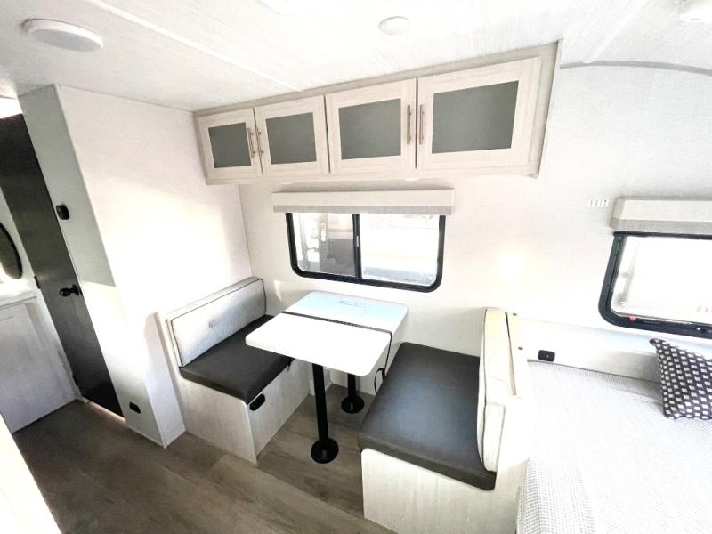 Whether you spend your days at the lake or in the woods, you'll be met with comfort in this spacious travel trailer. There is a rear dinette where you can enjoy your meals together, a 56" theater seat across from a 12V TV, and a slide out for added space. The walk-through bath includes a night light for easy nighttime use, and the front master bedroom includes a queen bed just like at home. There are also dual wardrobes and end tables plus an entertainment center if you want to add a TV. Outside, you'll find a rear accessory hitch, upgraded tires with TPMS, a 14' awning, and a slam latch cargo doors to keep your gear secure.