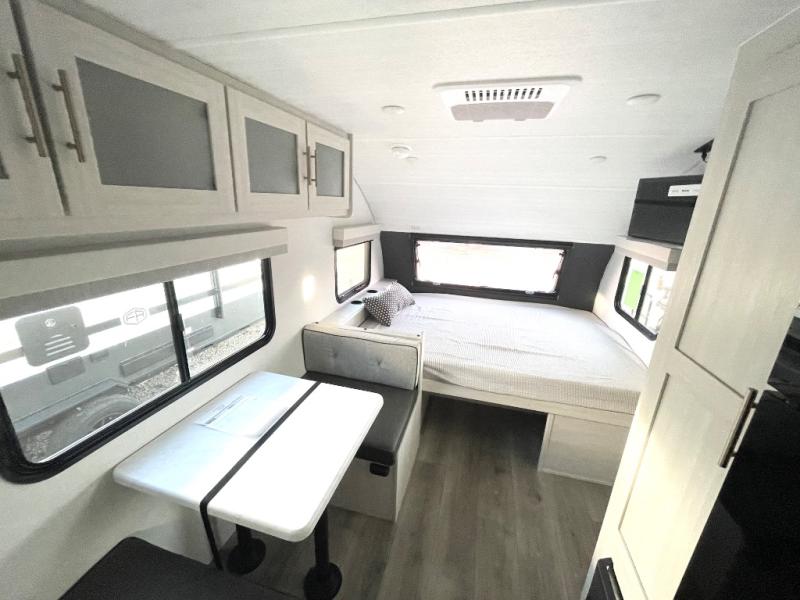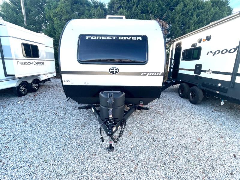 With any R-Pod travel trailer by Forest River, you will enjoy affordable luxury at the lowest tow weight in its class! There is a sealed underbelly with forced heat, a curved dual-pane acrylic front window with a bug screen and night shade, plus a large roof mounted solar panel for off-grid capabilities. The 15K A/C unit will keep you comfortable during the summer camping months, and the tankless water heater will provide endless hot showers after hiking, biking, swimming and more! Each model also includes a black glass friction hinge entrance door, roof ladder prep, exterior motion lighting, plus a hot and cold exterior spray port to wash off sand from the beach. Inside, you'll enjoy seamless Surf-X kitchen countertops, blackout roller shades, and a central vacuum system for hassle-free cleaning!