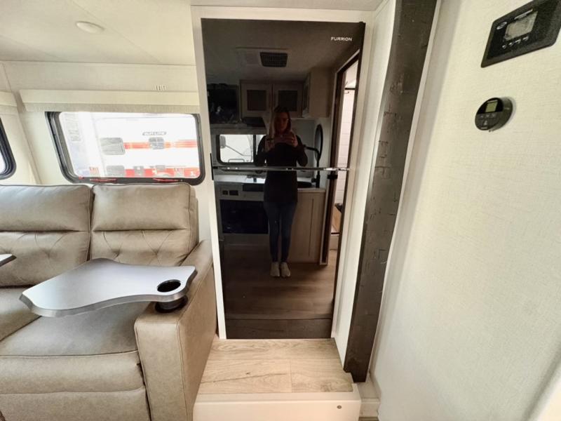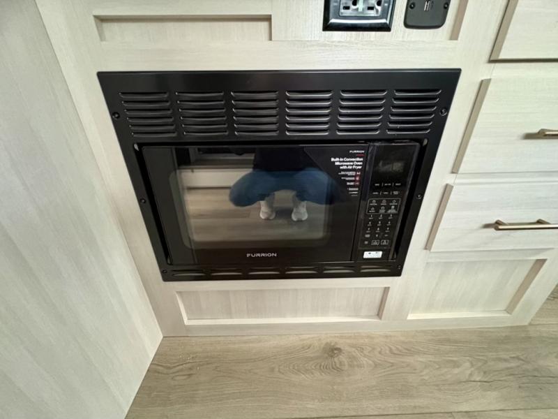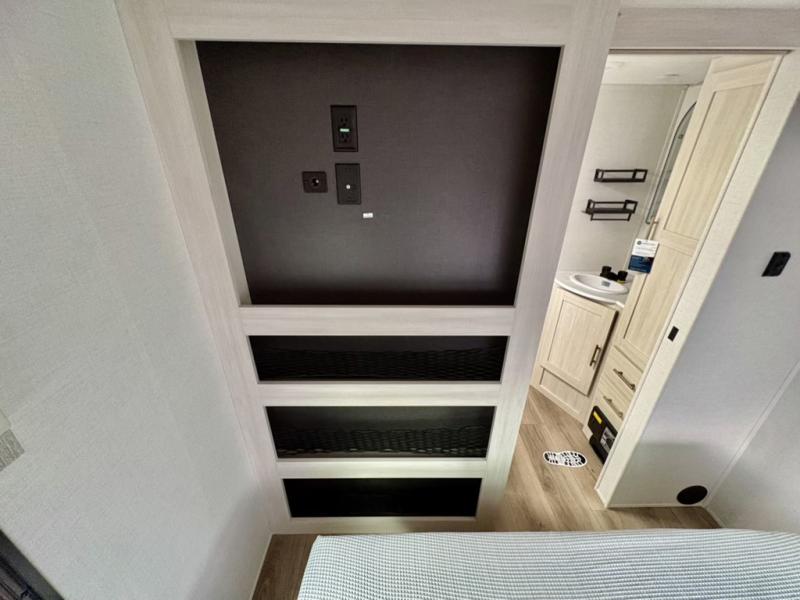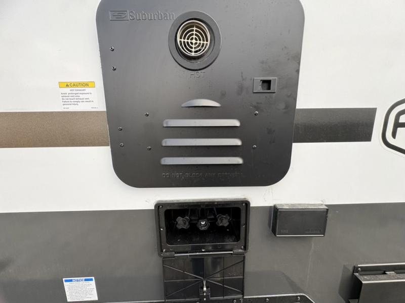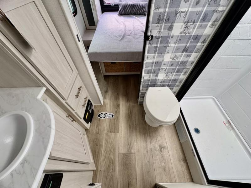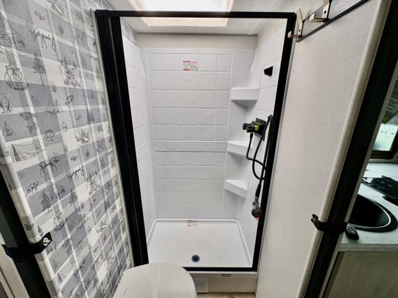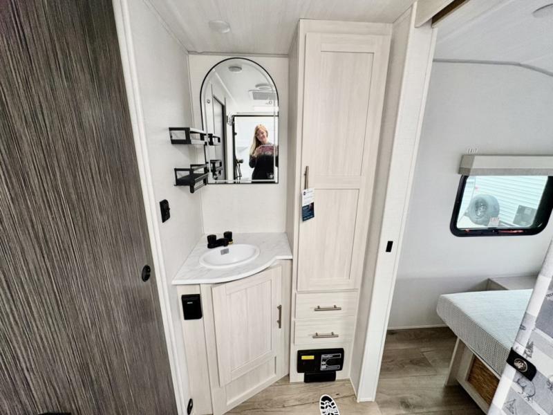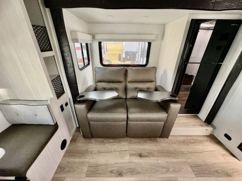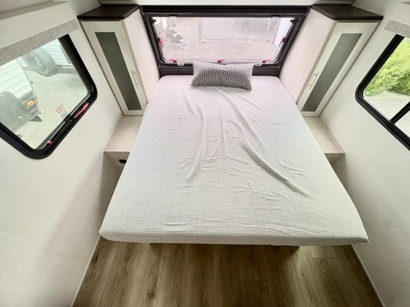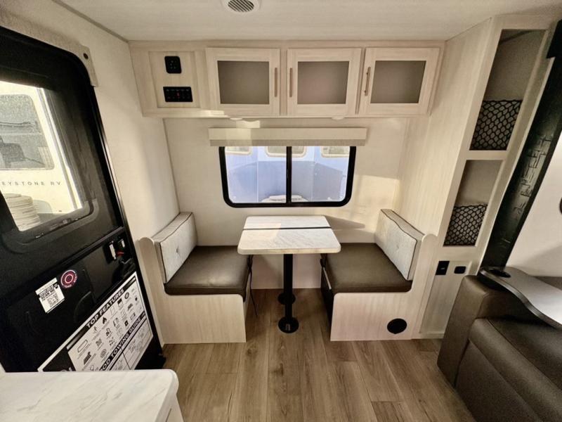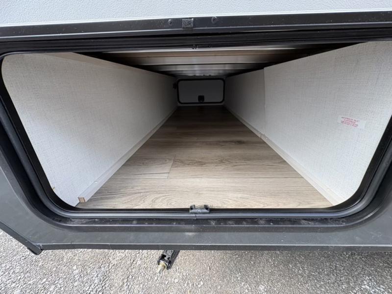 Whether you spend your days at the lake or in the woods, you'll be met with comfort in this spacious travel trailer. There is a rear dinette where you can enjoy your meals together, a 56" theater seat across from a 12V TV, and a slide out for added space. The walk-through bath includes a night light for easy nighttime use, and the front master bedroom includes a queen bed just like at home. There are also dual wardrobes and end tables plus an entertainment center if you want to add a TV. Outside, you'll find a rear accessory hitch, upgraded tires with TPMS, a 14' awning, and a slam latch cargo doors to keep your gear secure.