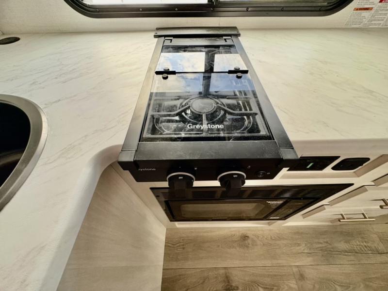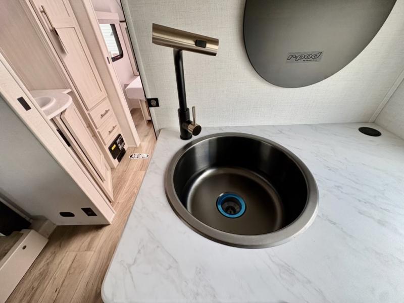 With any R-Pod travel trailer by Forest River, you will enjoy affordable luxury at the lowest tow weight in its class! There is a sealed underbelly with forced heat, a curved dual-pane acrylic front window with a bug screen and night shade, plus a large roof mounted solar panel for off-grid capabilities. The 15K A/C unit will keep you comfortable during the summer camping months, and the tankless water heater will provide endless hot showers after hiking, biking, swimming and more! Each model also includes a black glass friction hinge entrance door, roof ladder prep, exterior motion lighting, plus a hot and cold exterior spray port to wash off sand from the beach. Inside, you'll enjoy seamless Surf-X kitchen countertops, blackout roller shades, and a central vacuum system for hassle-free cleaning!