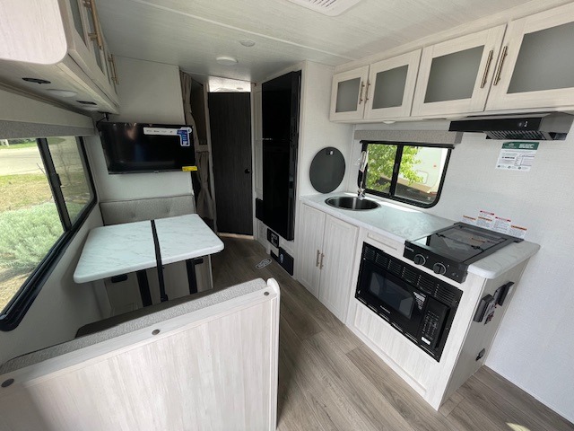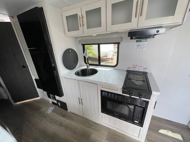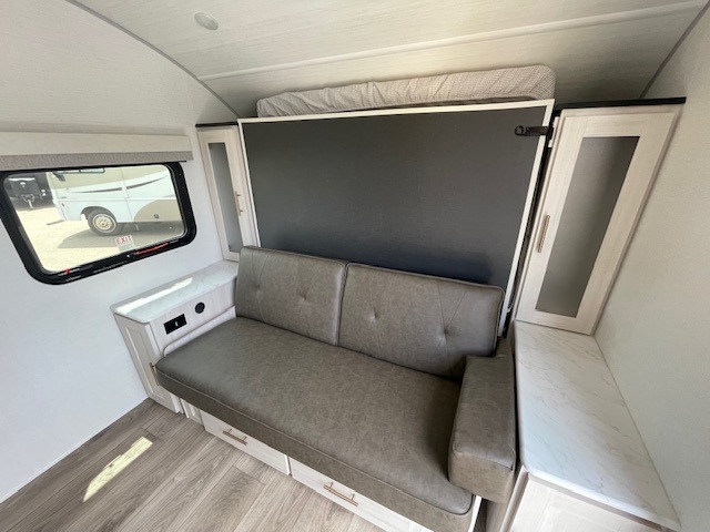 This travel trailer offers a great flexible floorplan. The living area sofa hides a queen-size Murphy bed which can be folded down at night, giving you full use of the room during the day. At the rear is a pair of double-size bunks which provide a spacious private sleeping area for children or guests. The booth dinette can also be used for an additional bed as needed. An efficient kitchen includes a convection microwave and cooktop to cook meals each day, along with a 12V black glass refrigerator and pantry for food storage.