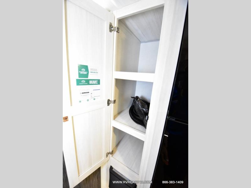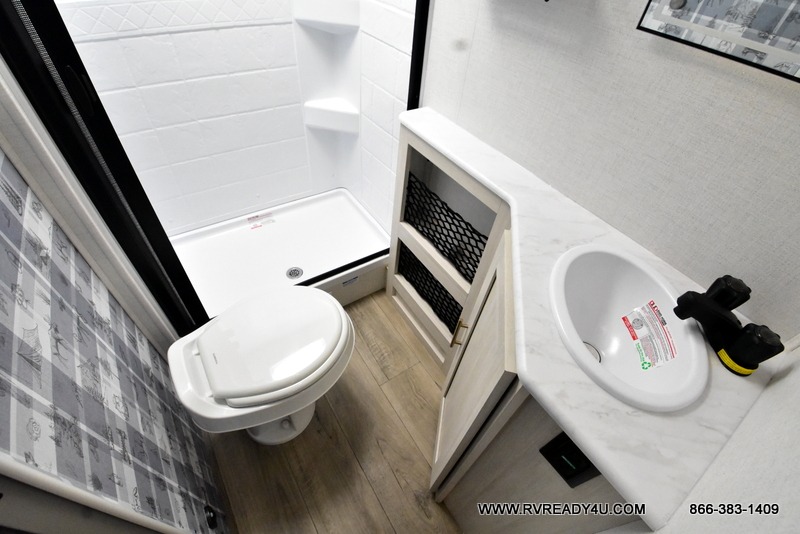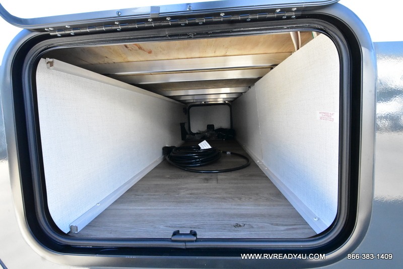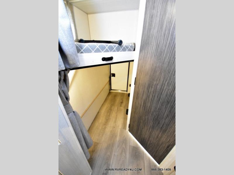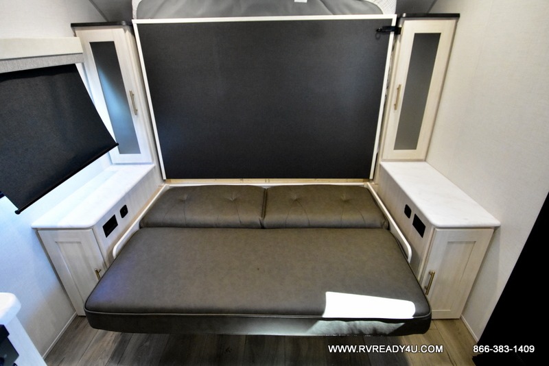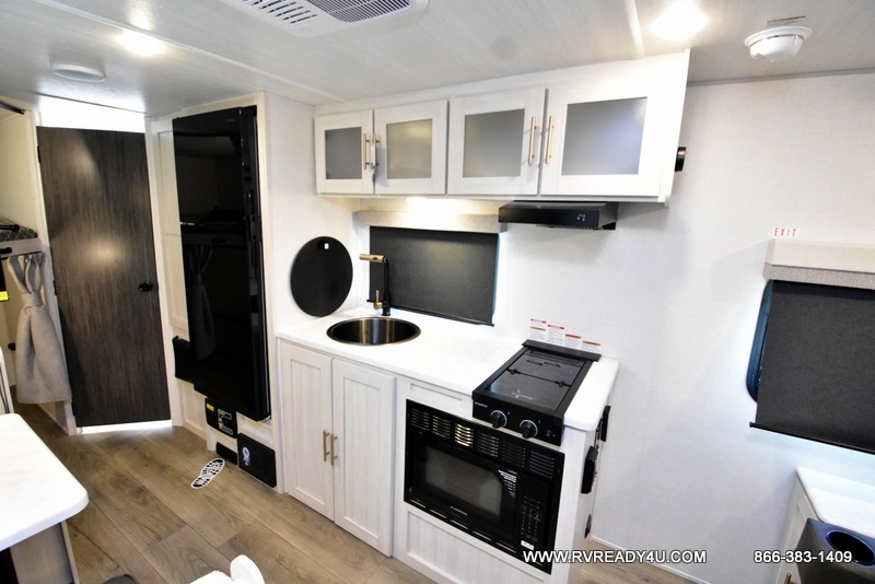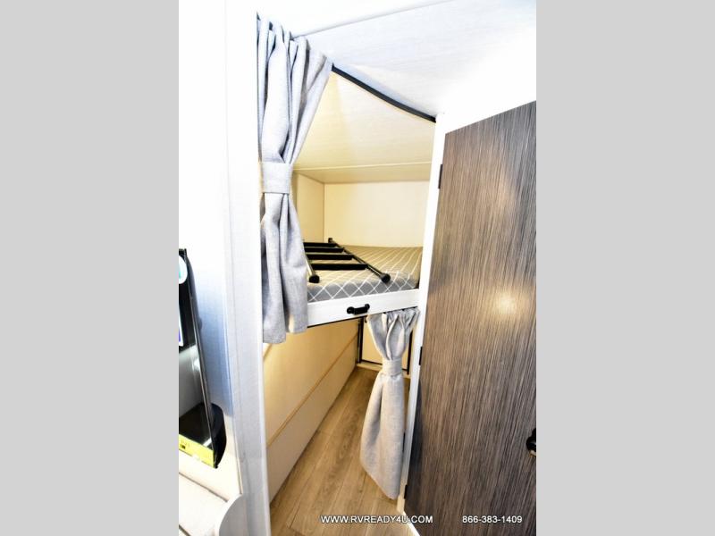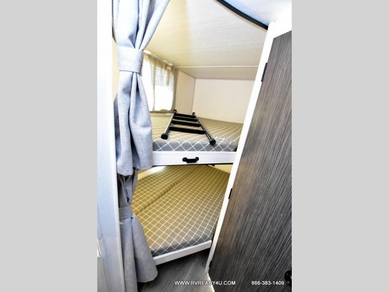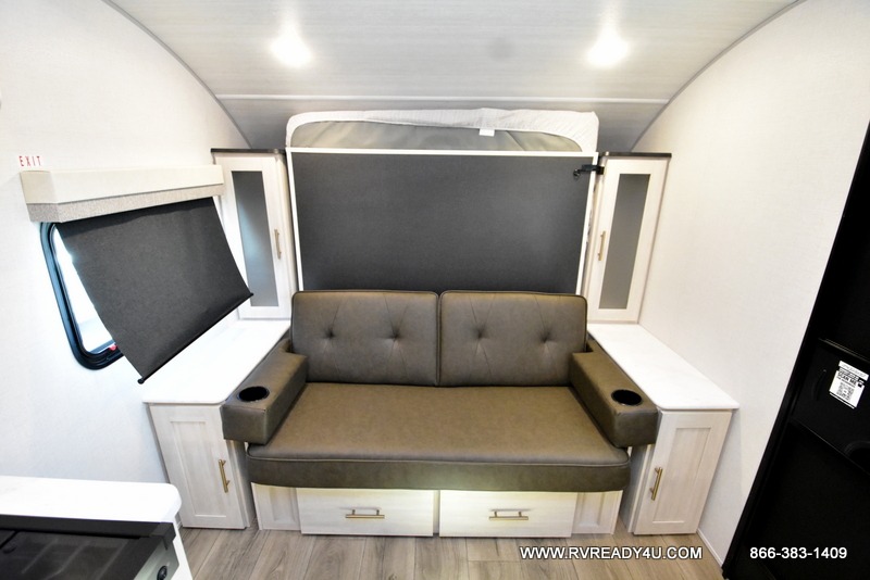 This travel trailer offers a great flexible floorplan. The living area sofa hides a queen-size Murphy bed which can be folded down at night, giving you full use of the room during the day. At the rear is a pair of double-size bunks which provide a spacious private sleeping area for children or guests. The booth dinette can also be used for an additional bed as needed. An efficient kitchen includes a convection microwave and cooktop to cook meals each day, along with a 12V black glass refrigerator and pantry for food storage.