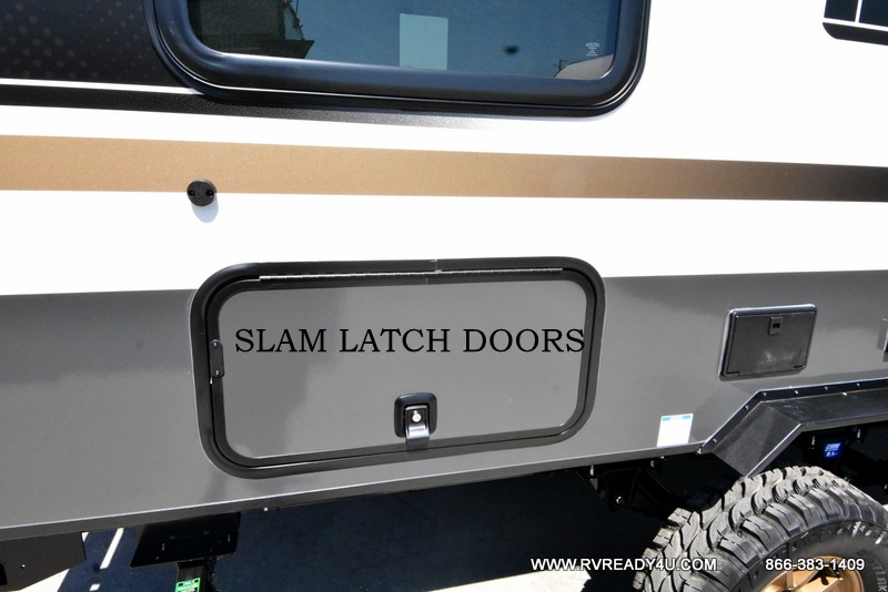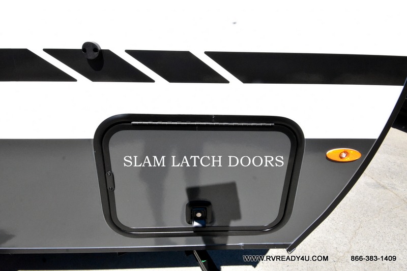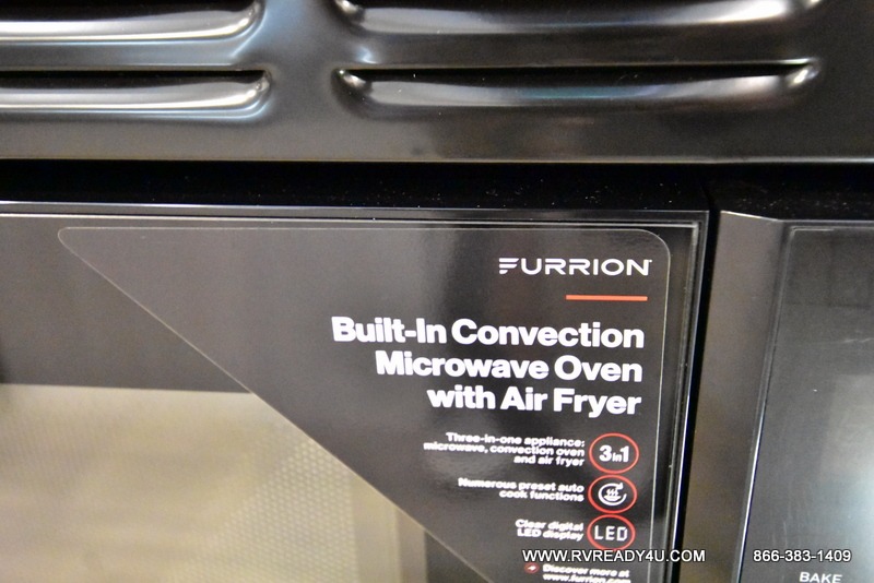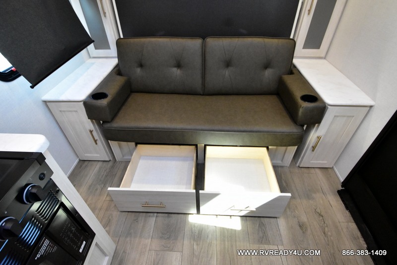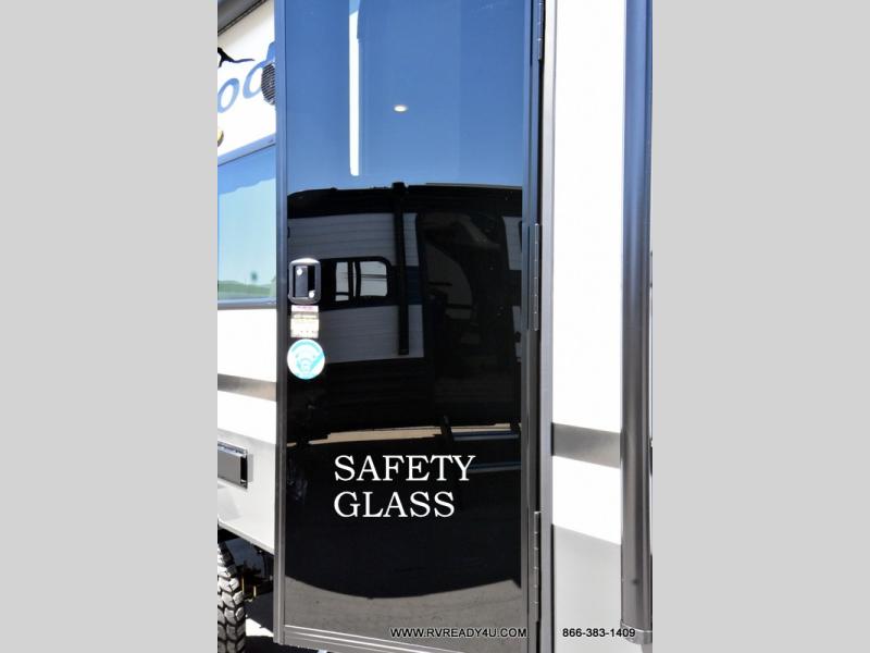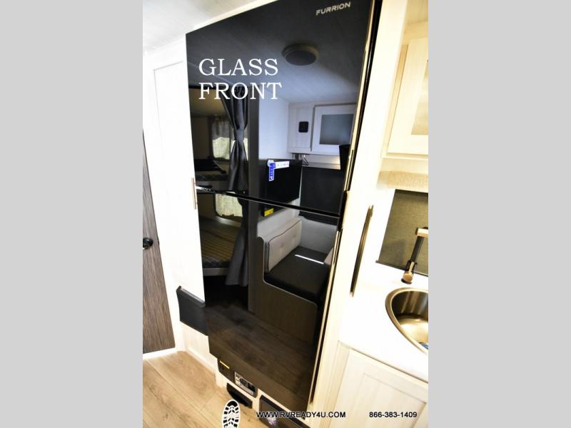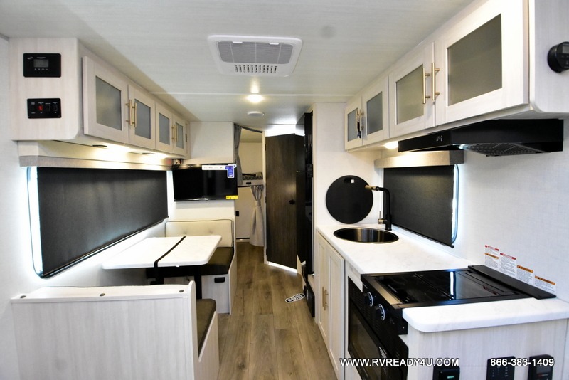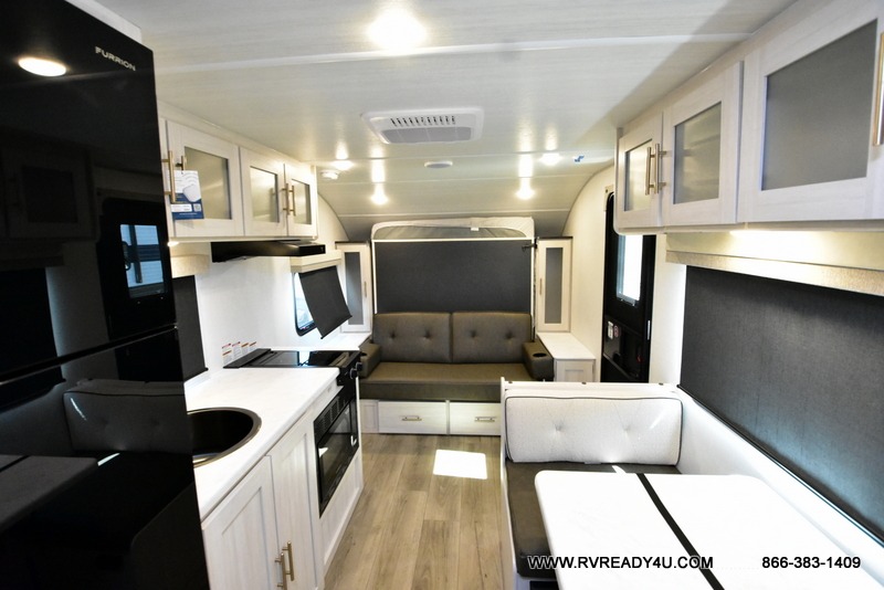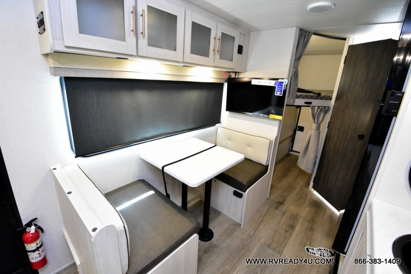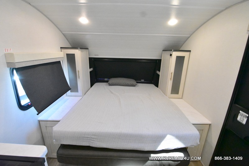 This travel trailer offers a great flexible floorplan. The living area sofa hides a queen-size Murphy bed which can be folded down at night, giving you full use of the room during the day. At the rear is a pair of double-size bunks which provide a spacious private sleeping area for children or guests. The booth dinette can also be used for an additional bed as needed. An efficient kitchen includes a convection microwave and cooktop to cook meals each day, along with a 12V black glass refrigerator and pantry for food storage.