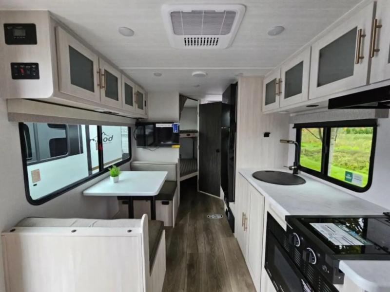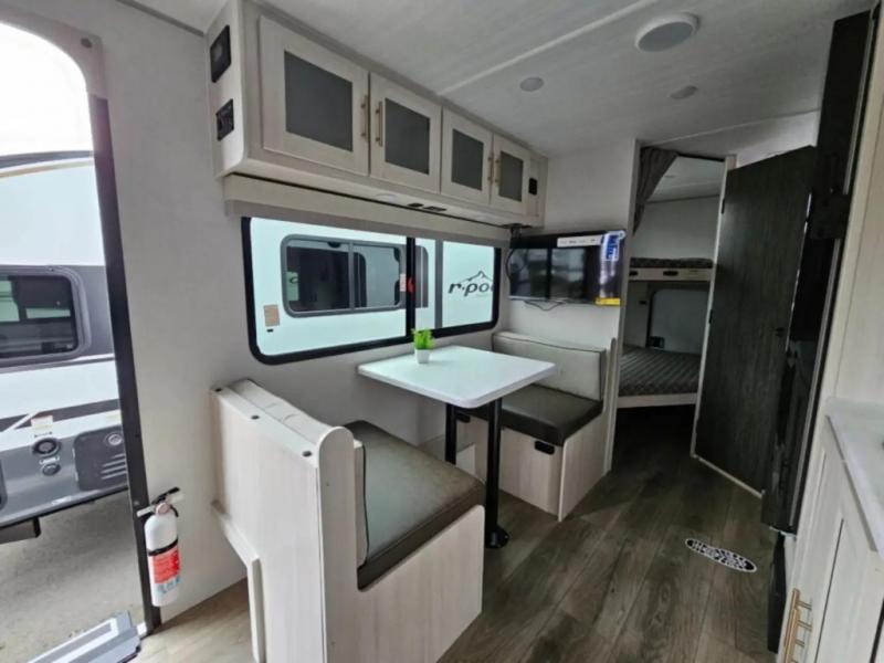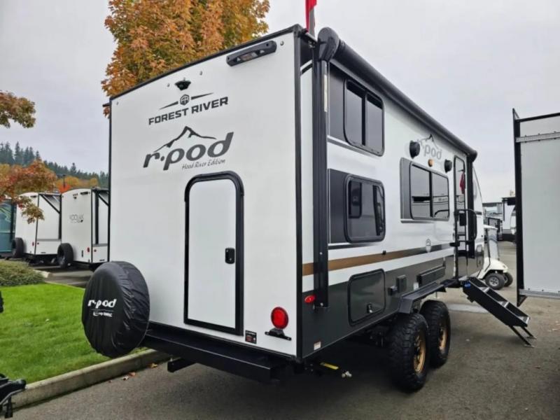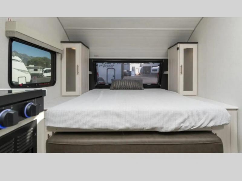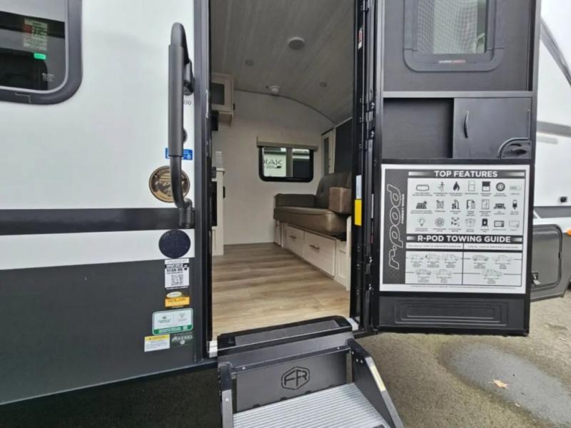 With any R-Pod travel trailer by Forest River, you will enjoy affordable luxury at the lowest tow weight in its class! There is a sealed underbelly with forced heat, a curved dual-pane acrylic front window with a bug screen and night shade, plus a large roof mounted solar panel for off-grid capabilities. The 15K A/C unit will keep you comfortable during the summer camping months, and the tankless water heater will provide endless hot showers after hiking, biking, swimming and more! Each model also includes a black glass friction hinge entrance door, roof ladder prep, exterior motion lighting, plus a hot and cold exterior spray port to wash off sand from the beach. Inside, you'll enjoy seamless Surf-X kitchen countertops, blackout roller shades, and a central vacuum system for hassle-free cleaning!