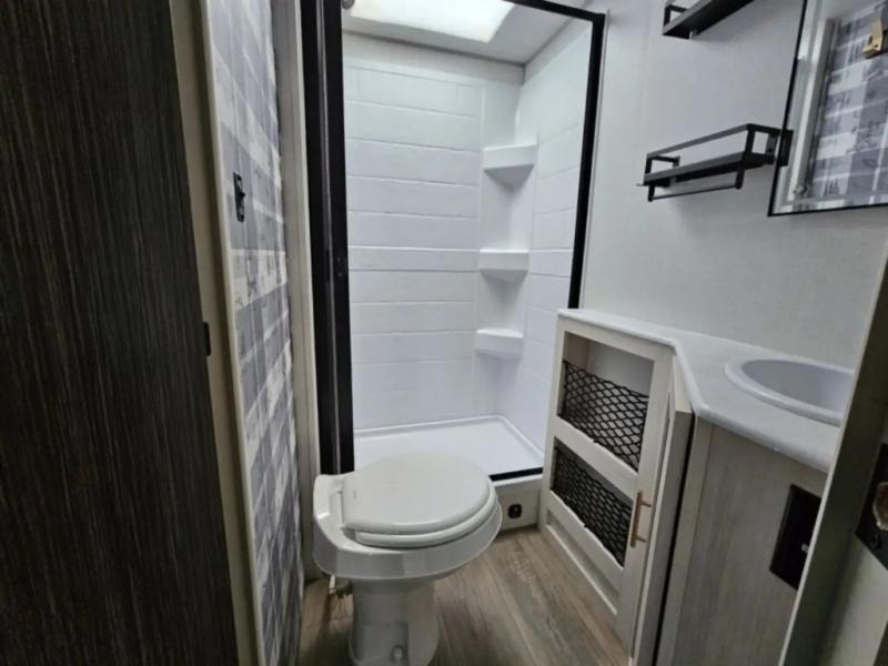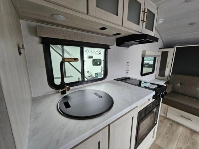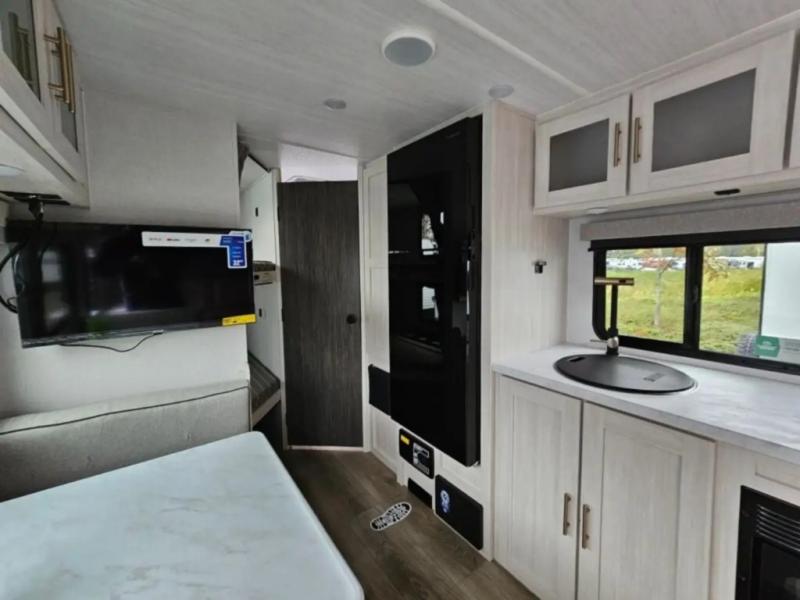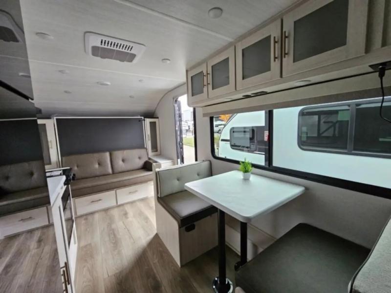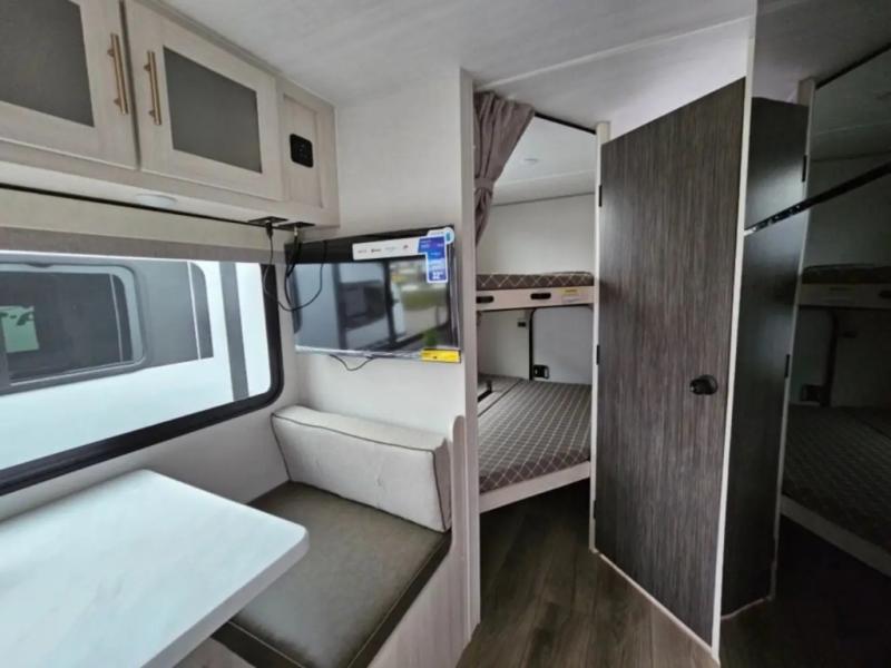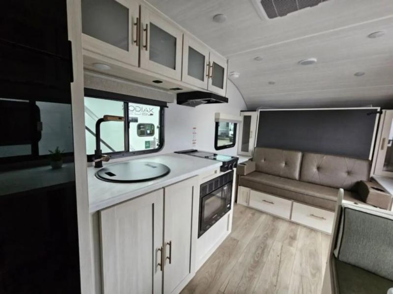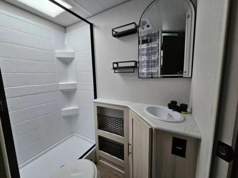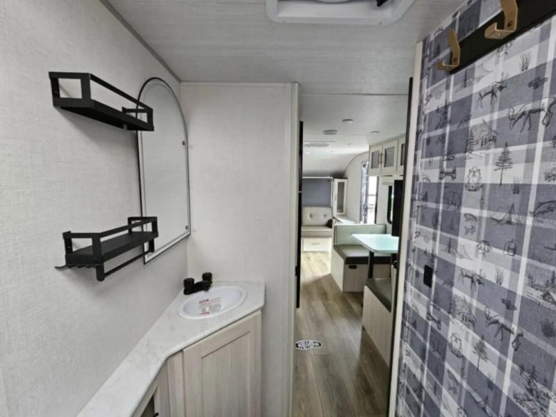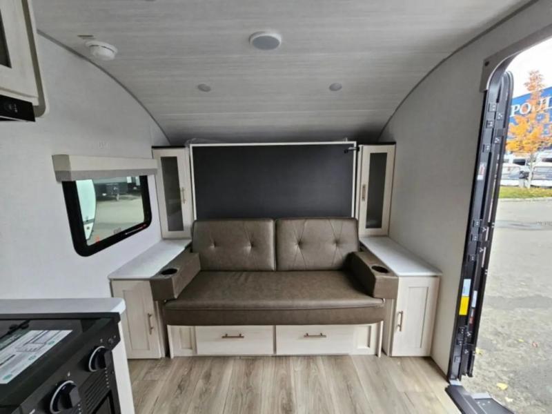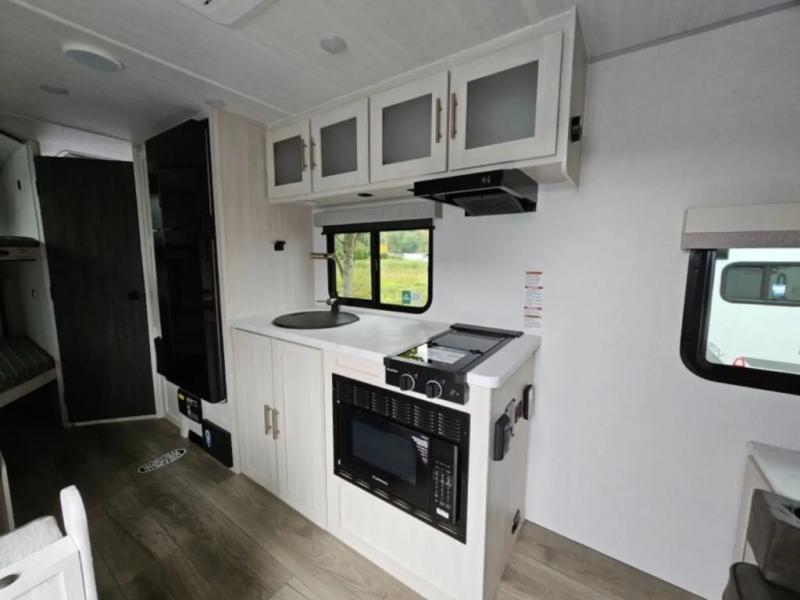 This travel trailer offers a great flexible floorplan. The living area sofa hides a queen-size Murphy bed which can be folded down at night, giving you full use of the room during the day. At the rear is a pair of double-size bunks which provide a spacious private sleeping area for children or guests. The booth dinette can also be used for an additional bed as needed. An efficient kitchen includes a convection microwave and cooktop to cook meals each day, along with a 12V black glass refrigerator and pantry for food storage.