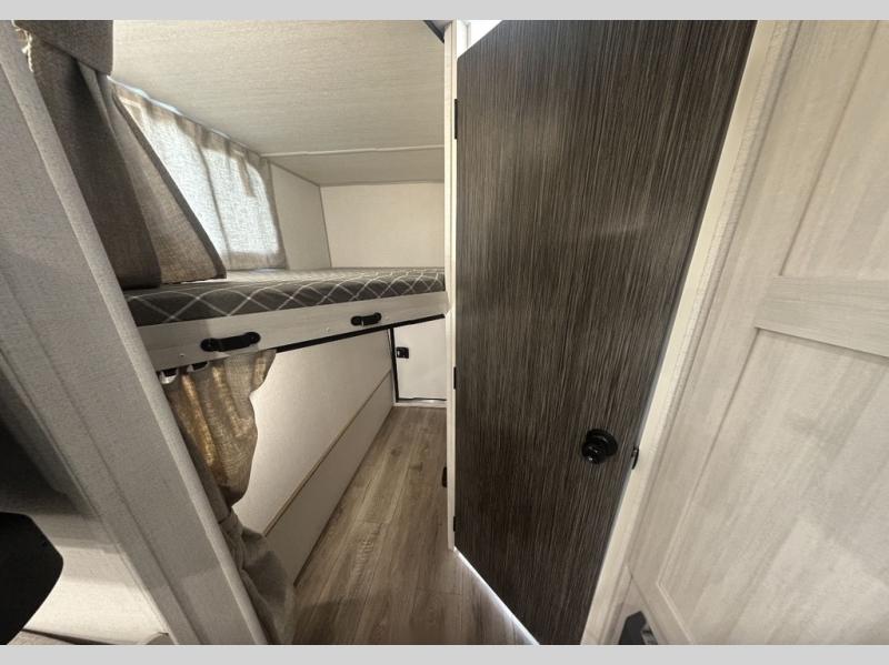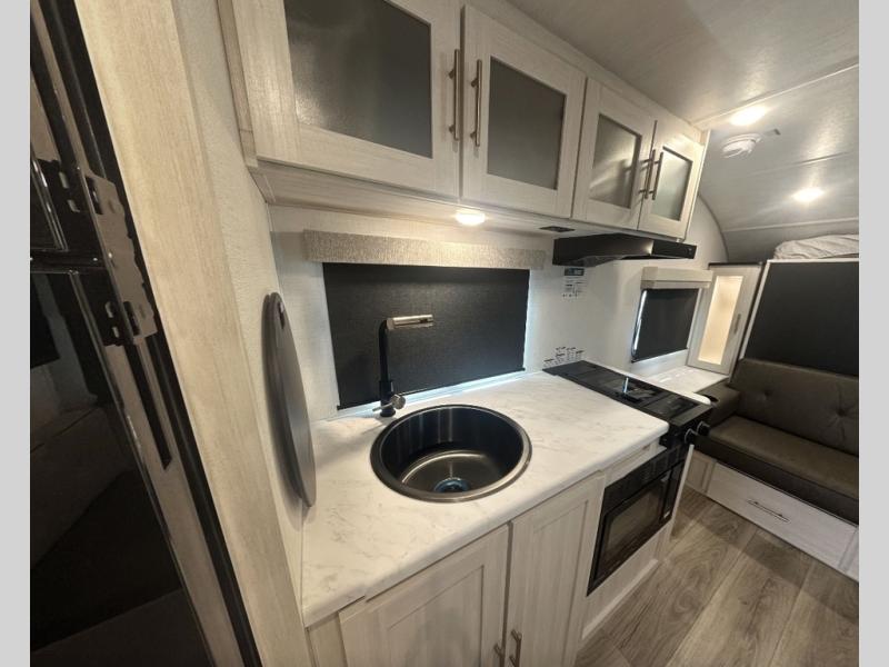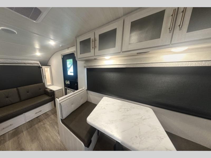 This travel trailer offers a great flexible floorplan. The living area sofa hides a queen-size Murphy bed which can be folded down at night, giving you full use of the room during the day. At the rear is a pair of double-size bunks which provide a spacious private sleeping area for children or guests. The booth dinette can also be used for an additional bed as needed. An efficient kitchen includes a convection microwave and cooktop to cook meals each day, along with a 12V black glass refrigerator and pantry for food storage.