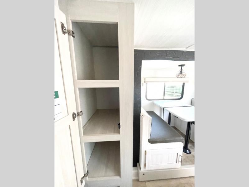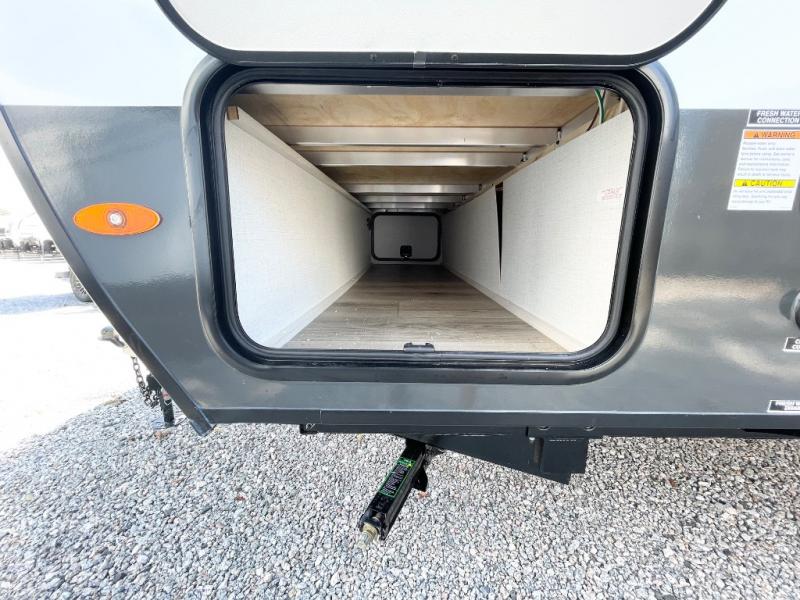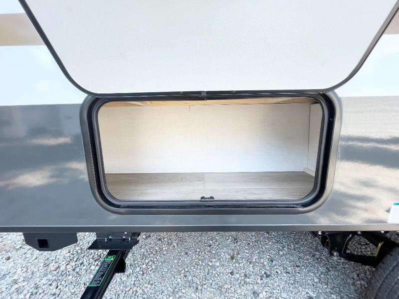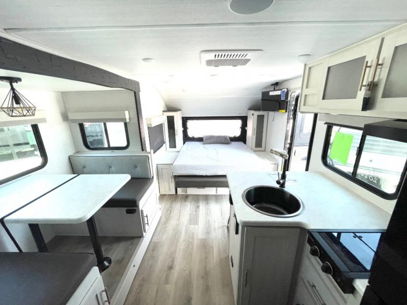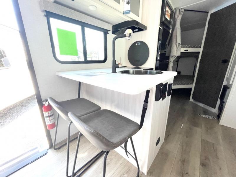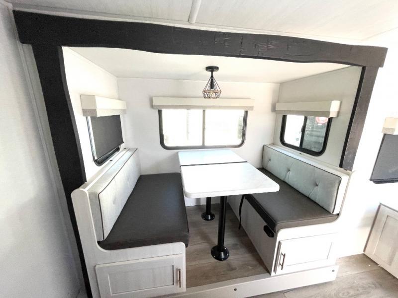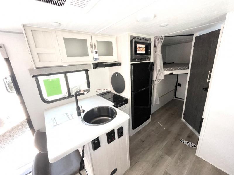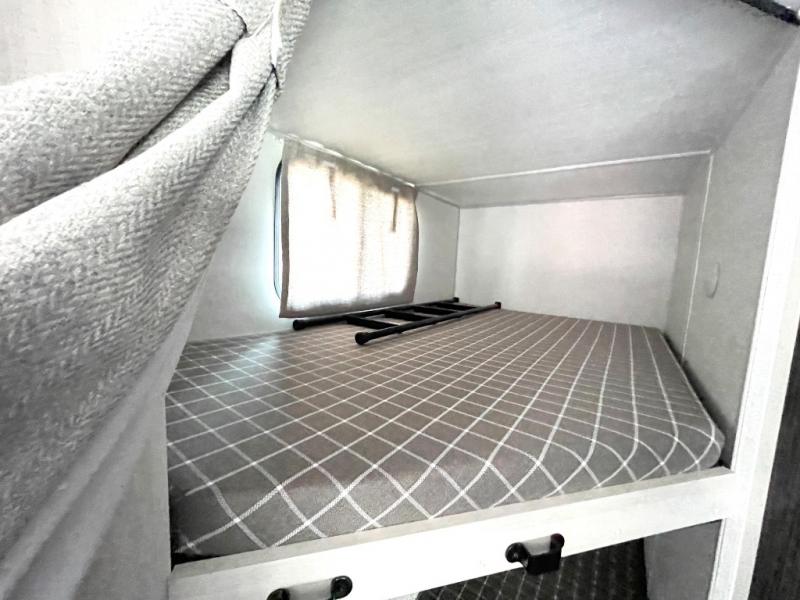 This travel trailer offers a great flexible floorplan. The living area sofa hides a queen-size Murphy bed which can be folded down at night, giving you full use of the room during the day. At the rear is a pair of double-size bunks which provide a spacious private sleeping area for children or guests. The booth dinette can also be used for an additional bed as needed. An efficient kitchen includes a bar top with high chairs plus a convection microwave and cooktop to cook meals each day.