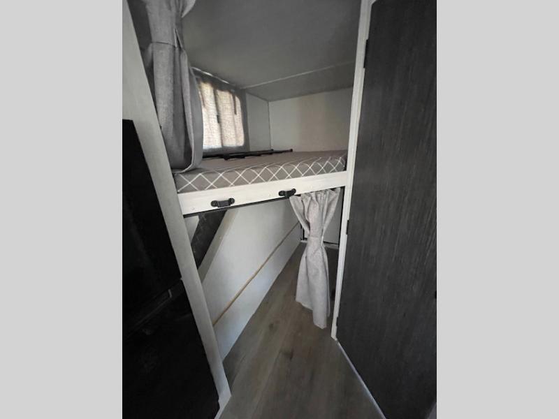 This travel trailer offers a great flexible floorplan. The living area sofa hides a queen-size Murphy bed which can be folded down at night, giving you full use of the room during the day. At the rear is a pair of double-size bunks which provide a spacious private sleeping area for children or guests. The booth dinette can also be used for an additional bed as needed. An efficient kitchen includes a bar top with high chairs plus a convection microwave and cooktop to cook meals each day.