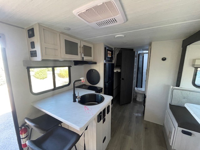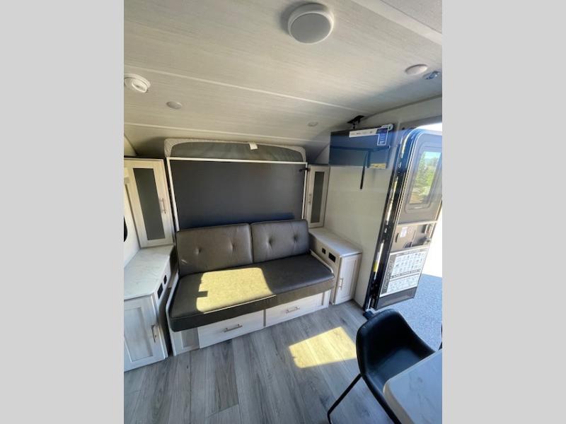 This travel trailer offers a great flexible floorplan. The living area sofa hides a queen-size Murphy bed which can be folded down at night, giving you full use of the room during the day. At the rear is a pair of double-size bunks which provide a spacious private sleeping area for children or guests. The booth dinette can also be used for an additional bed as needed. An efficient kitchen includes a bar top with high chairs plus a convection microwave and cooktop to cook meals each day.