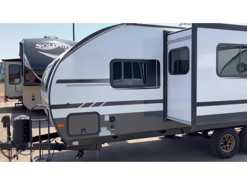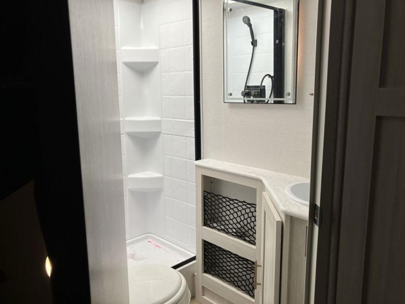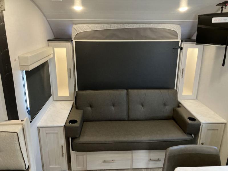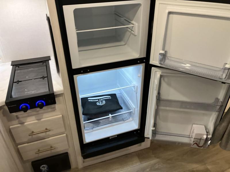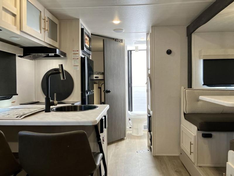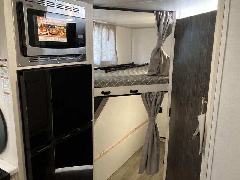 This travel trailer offers a great flexible floorplan. The living area sofa hides a Murphy bed which can be folded down at night, giving you full use of the room during the day. At the rear is a pair of double-size bunks which provide a spacious private sleeping area for children or guests. The booth dinette can also be used for an additional bed as needed. An efficient kitchen includes a bar top with high chairs plus a convection microwave and cooktop to cook meals each day. This model also includes the Hood River Edition that comes with Mud Legend all terrain tires with TPMS, advanced ground clearance, a MaxxAir vent cover, and 12V tank heaters!