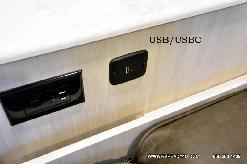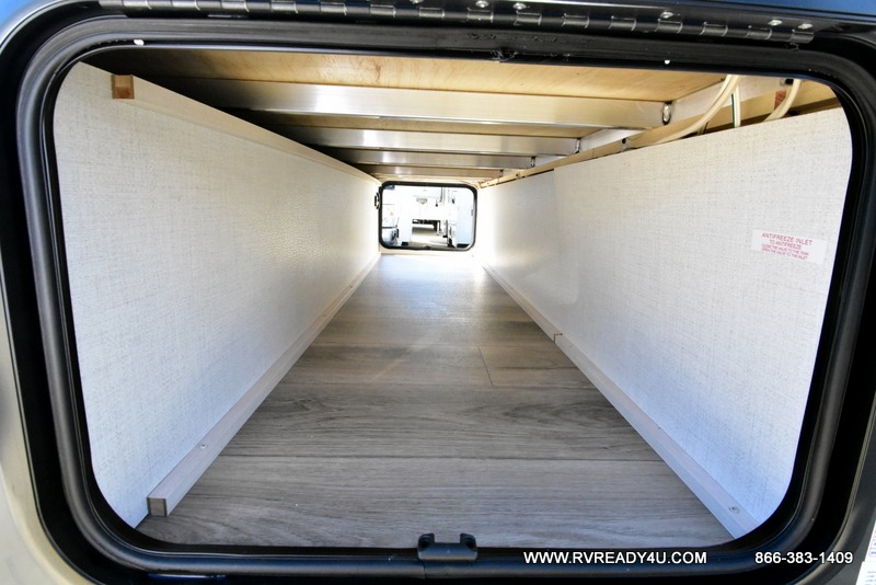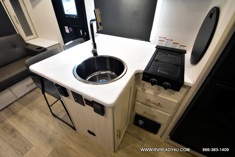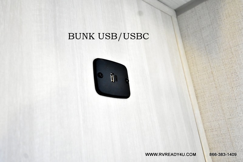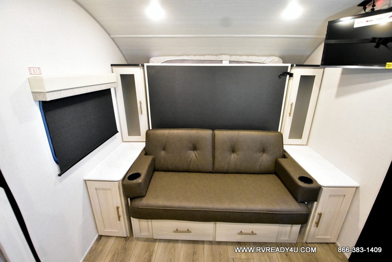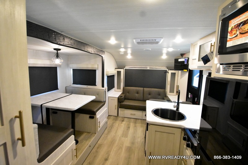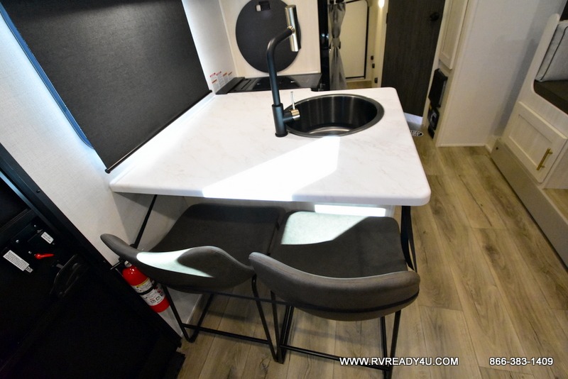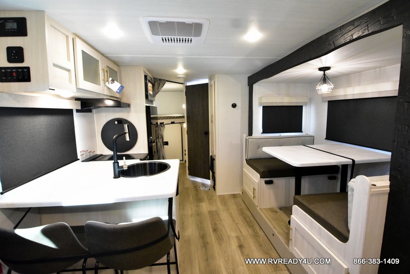 This travel trailer offers a great flexible floorplan. The living area sofa hides a queen-size Murphy bed which can be folded down at night, giving you full use of the room during the day. At the rear is a pair of double-size bunks which provide a spacious private sleeping area for children or guests. The booth dinette can also be used for an additional bed as needed. An efficient kitchen includes a bar top with high chairs plus a convection microwave and cooktop to cook meals each day.