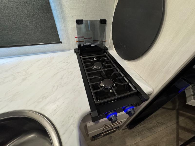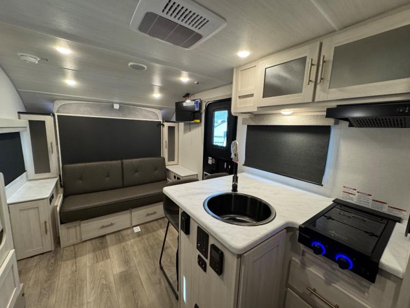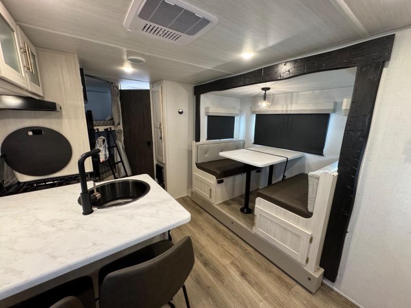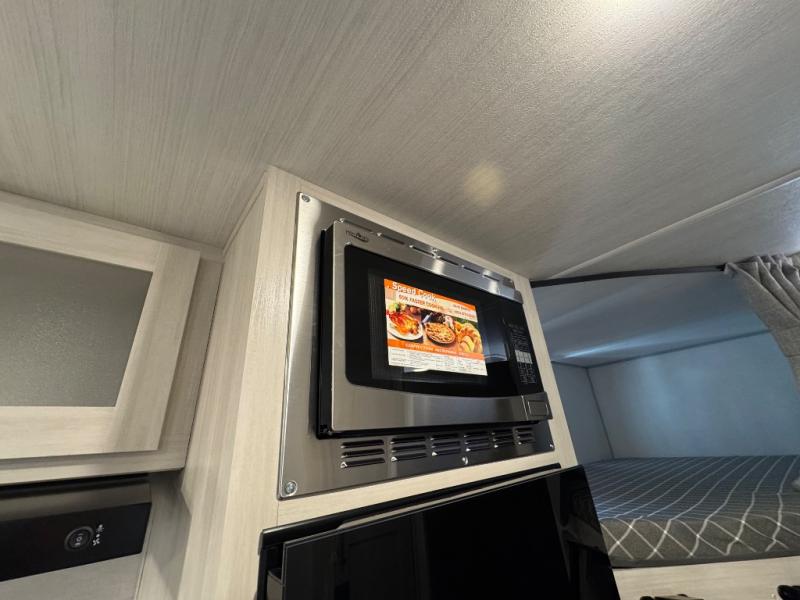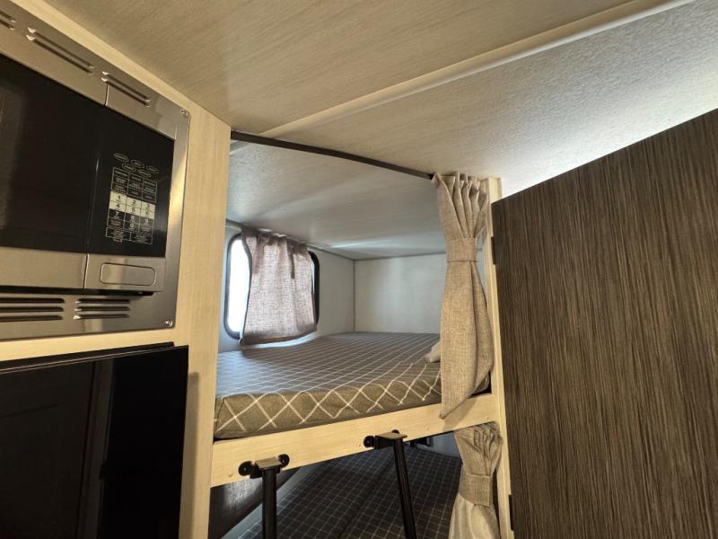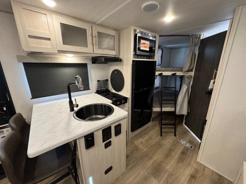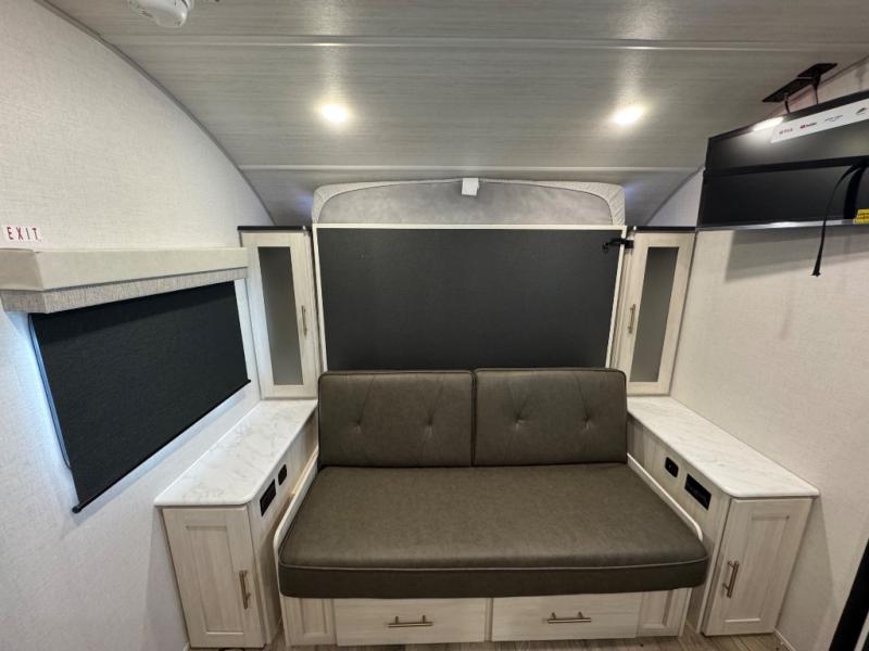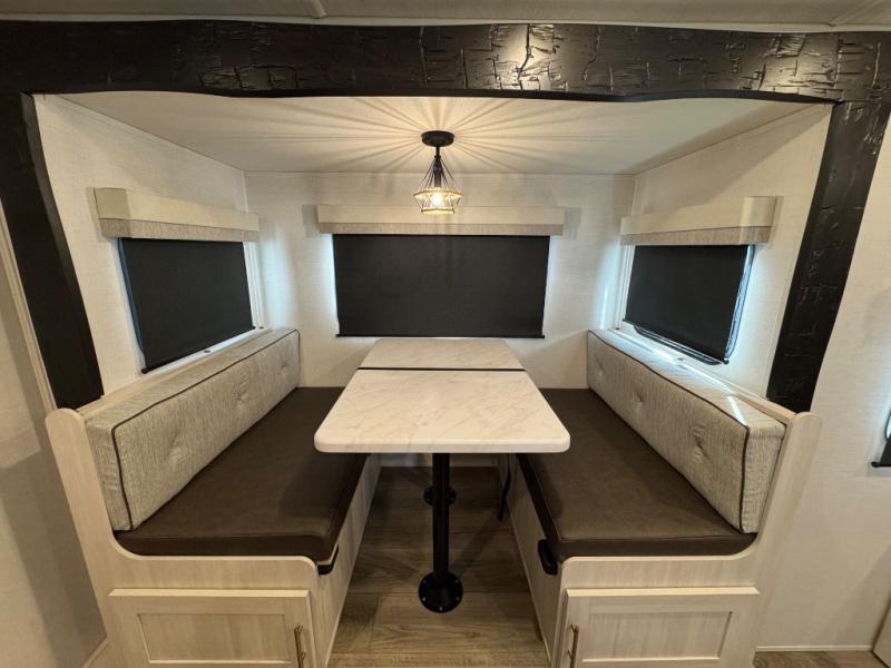 This travel trailer offers a great flexible floorplan. The living area sofa hides a queen-size Murphy bed which can be folded down at night, giving you full use of the room during the day. At the rear is a pair of double-size bunks which provide a spacious private sleeping area for children or guests. The booth dinette can also be used for an additional bed as needed. An efficient kitchen includes a bar top with high chairs plus a convection microwave and cooktop to cook meals each day.
