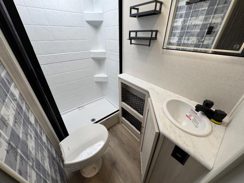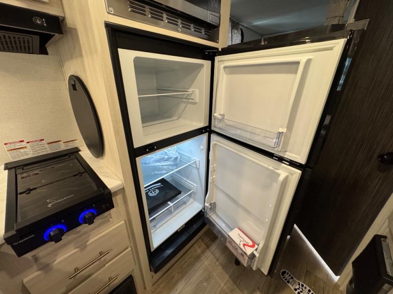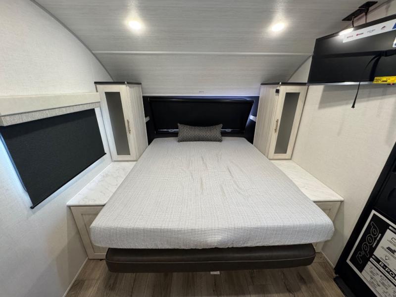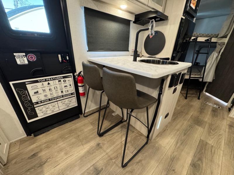 With any R-Pod travel trailer by Forest River, you will enjoy affordable luxury at the lowest tow weight in its class! There is a sealed underbelly with forced heat, a curved dual-pane acrylic front window with a bug screen and night shade, plus a large roof mounted solar panel for off-grid capabilities. The 15K A/C unit will keep you comfortable during the summer camping months, and the tankless water heater will provide endless hot showers after hiking, biking, swimming and more! Each model also includes a black glass friction hinge entrance door, roof ladder prep, exterior motion lighting, plus a hot and cold exterior spray port to wash off sand from the beach. Inside, you'll enjoy seamless Surf-X kitchen countertops, blackout roller shades, and a central vacuum system for hassle-free cleaning!