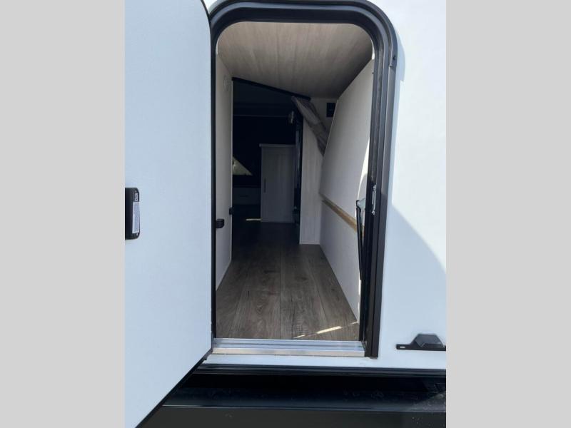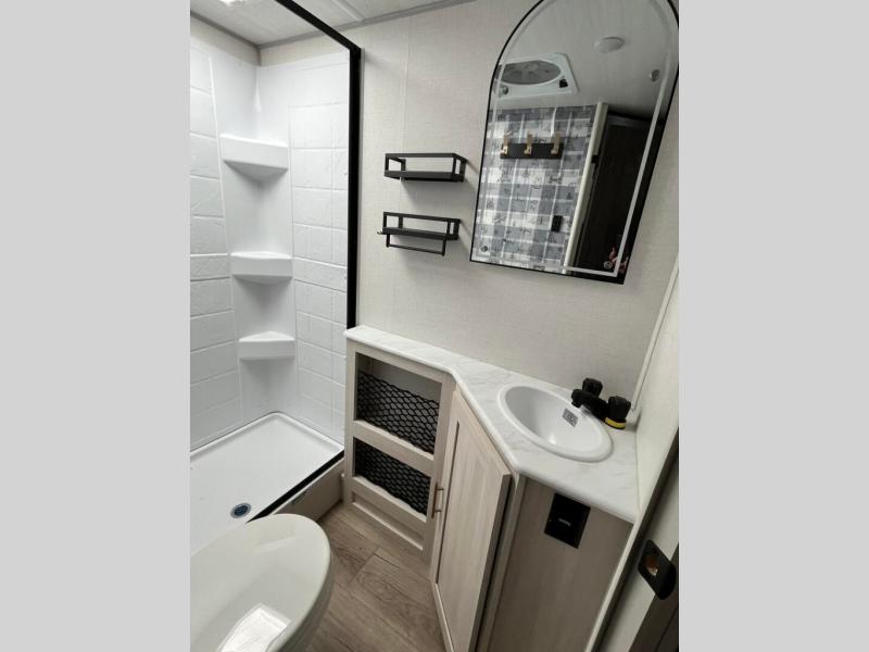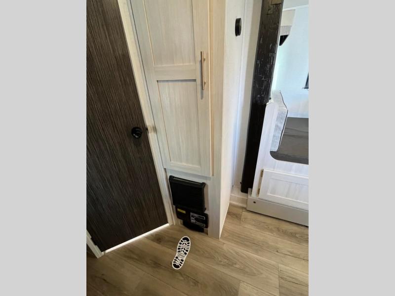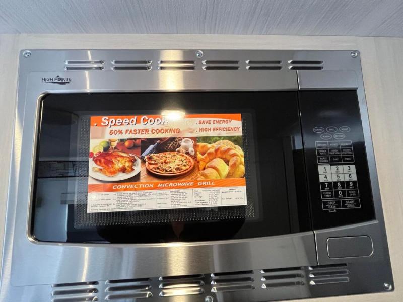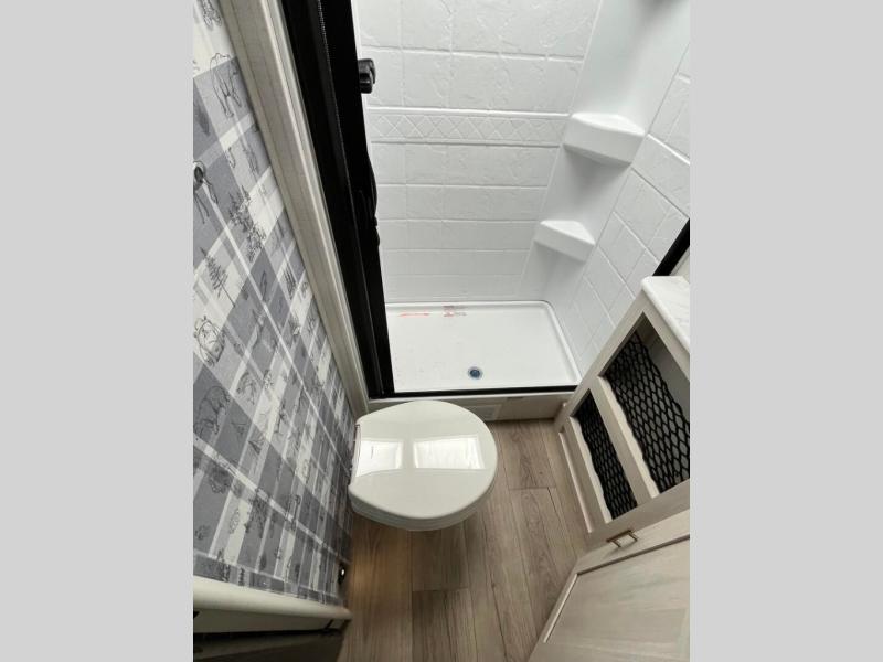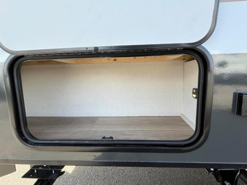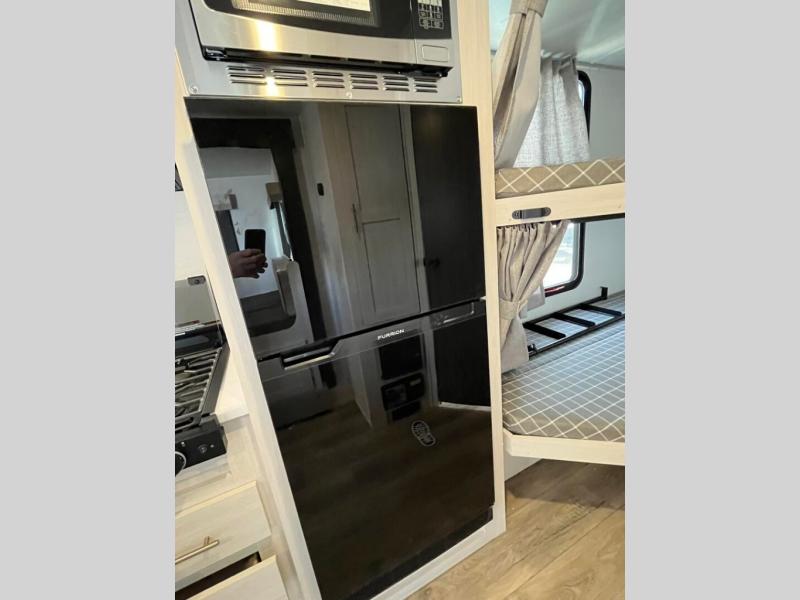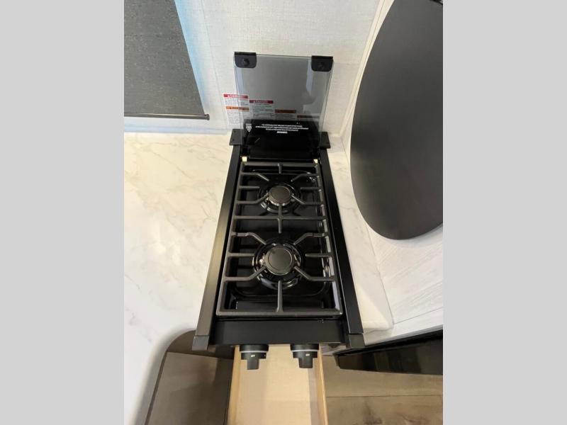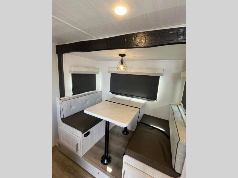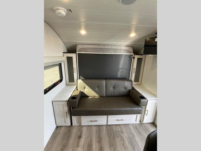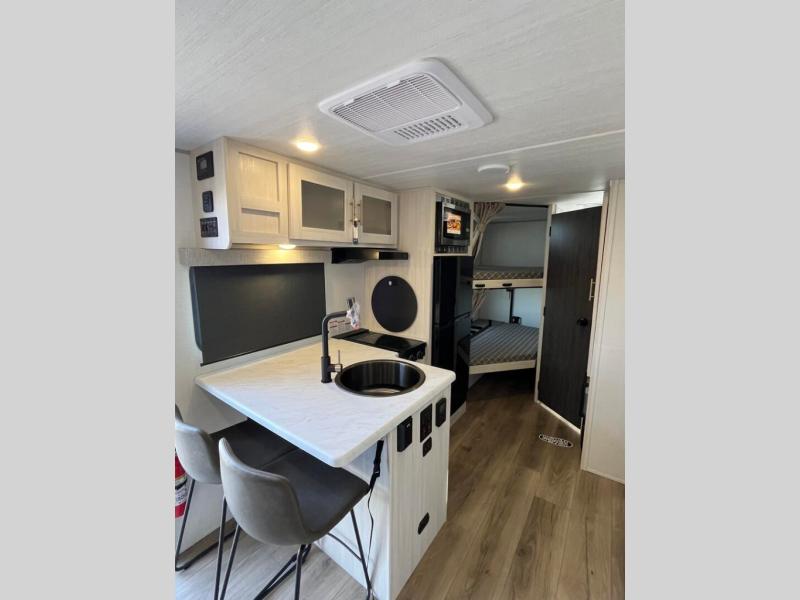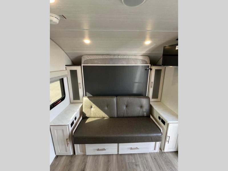 This travel trailer offers a great flexible floorplan. The living area sofa hides a queen-size Murphy bed which can be folded down at night, giving you full use of the room during the day. At the rear is a pair of double-size bunks which provide a spacious private sleeping area for children or guests. The booth dinette can also be used for an additional bed as needed. An efficient kitchen includes a bar top with chairs plus an air fryer microwave and cooktop to cook meals each day.
