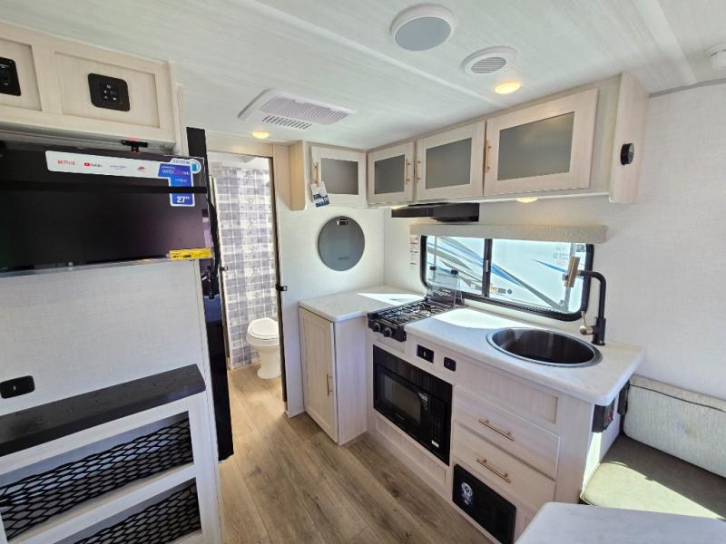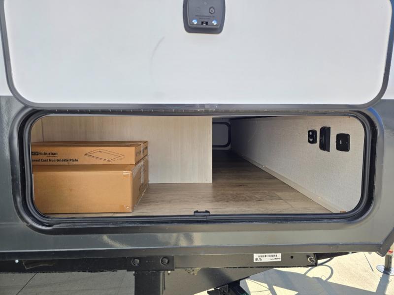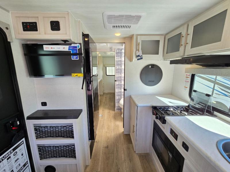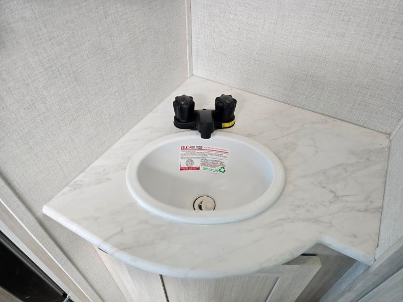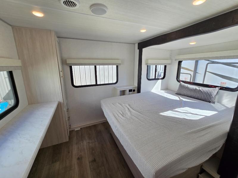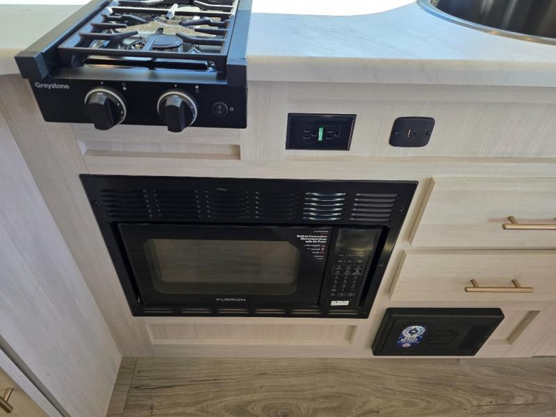 Time spent in this travel trailer will be time well spent! You will have all the comforts of home, including a private bedroom with two wardrobes, a queen bed, and a desk/dresser that will allow you to get some work done if needed. The front U-shaped dinette with a swivel dinette table will double as dining and sleeping space, and the walk-through bath will be easily accessible for everyone to use. You can prepare meals on the two burner cooktop, or use the convection microwave. There is also a 12V black glass 12V refrigerator for food storage and plenty of counter space to prep meals.