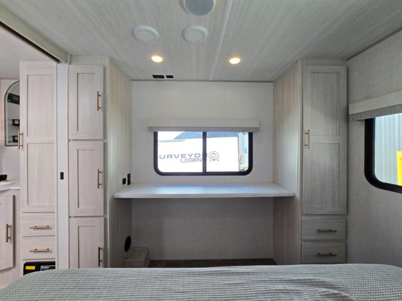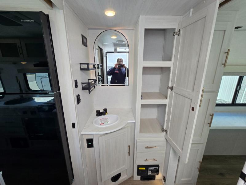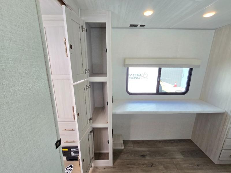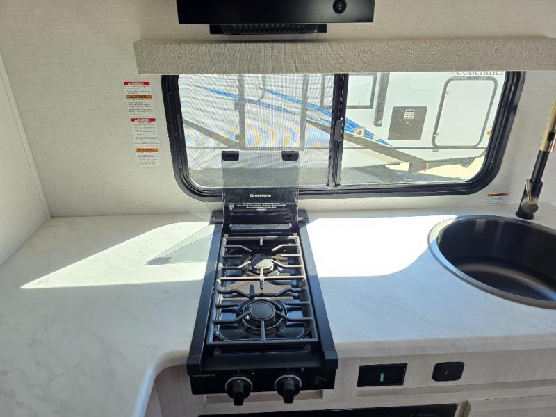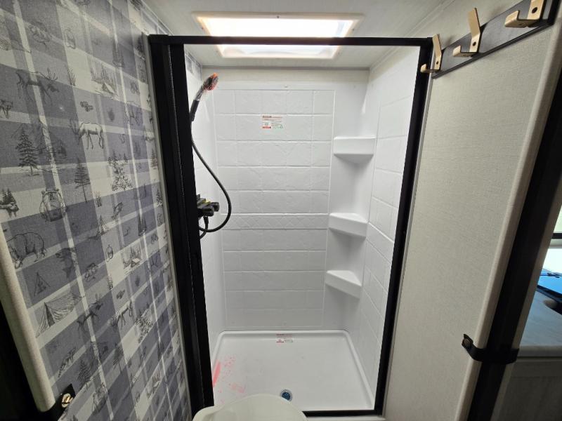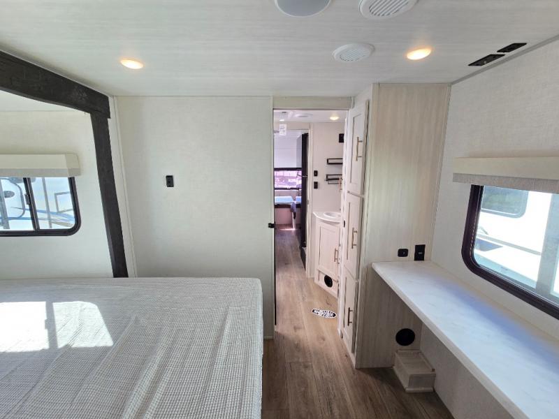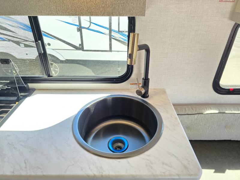 Time spent in this travel trailer will be time well spent! You will have all the comforts of home, including a private bedroom with two wardrobes, a queen bed, and a desk/dresser that will allow you to get some work done if needed. The front U-shaped dinette with a swivel dinette table will double as dining and sleeping space, and the walk-through bath will be easily accessible for everyone to use. You can prepare meals on the two burner cooktop, or use the convection microwave. There is also a 12V black glass 12V refrigerator for food storage and plenty of counter space to prep meals.