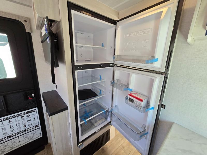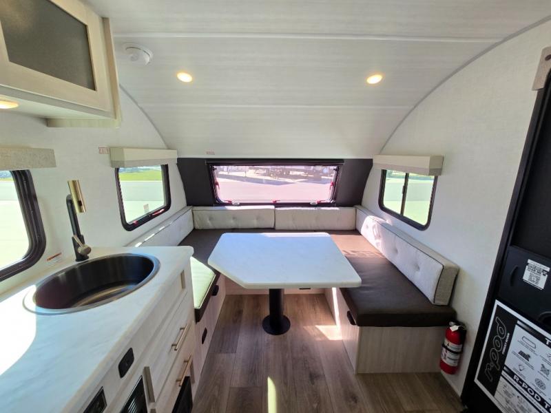 With any R-Pod travel trailer by Forest River, you will enjoy affordable luxury at the lowest tow weight in its class! There is a sealed underbelly with forced heat, a curved dual-pane acrylic front window with a bug screen and night shade, plus a large roof mounted solar panel for off-grid capabilities. The 15K A/C unit will keep you comfortable during the summer camping months, and the tankless water heater will provide endless hot showers after hiking, biking, swimming and more! Each model also includes a black glass friction hinge entrance door, roof ladder prep, exterior motion lighting, plus a hot and cold exterior spray port to wash off sand from the beach. Inside, you'll enjoy seamless Surf-X kitchen countertops, blackout roller shades, and a central vacuum system for hassle-free cleaning!
