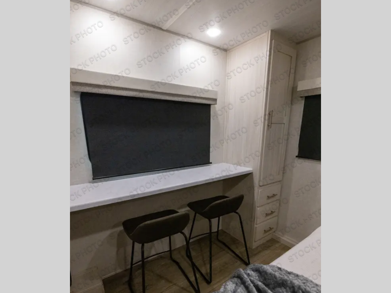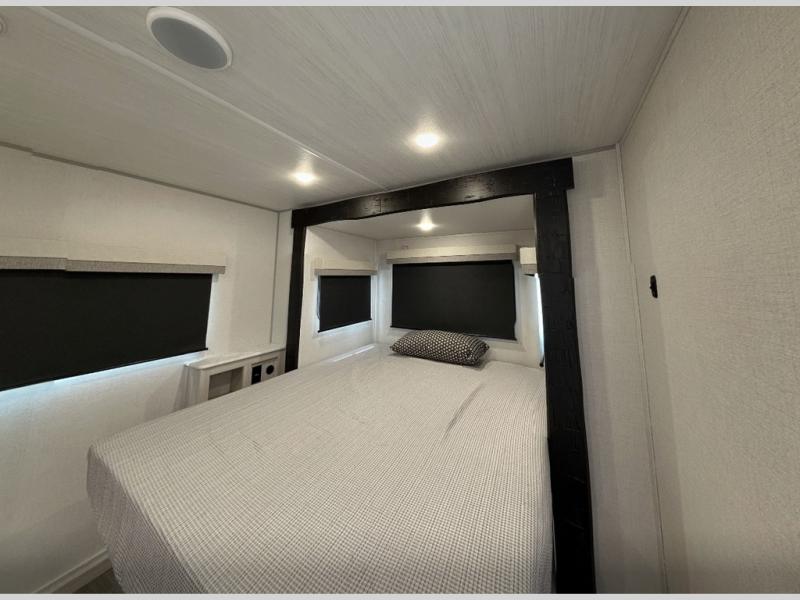 Time spent in this travel trailer will be time well spent! You will have all the comforts of home, including a private bedroom with two wardrobes, a queen bed, and a desk/dresser that will allow you to get some work done if needed. The front U-shaped dinette with a swivel dinette table will double as dining and sleeping space, and the walk-through bath will be easily accessible for everyone to use. You can prepare meals on the two burner cooktop, or use the convection microwave. There is also a 12V black glass 12V refrigerator for food storage and plenty of counter space to prep meals.