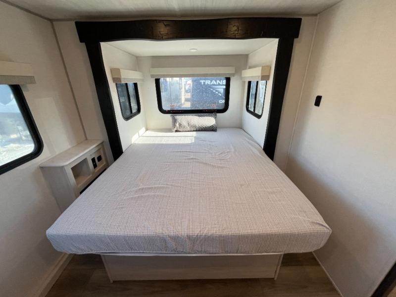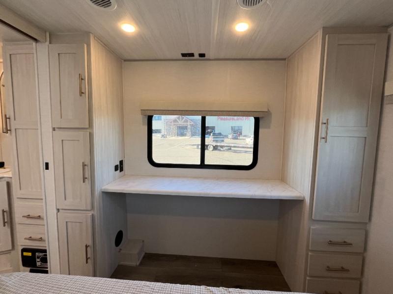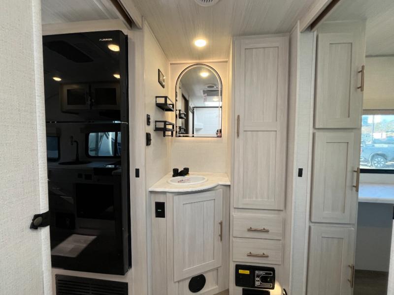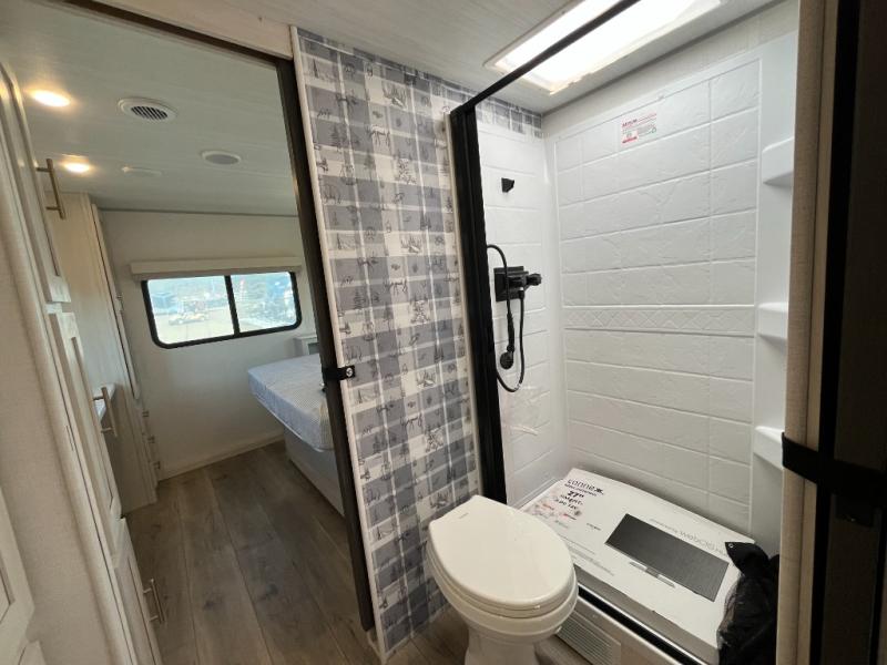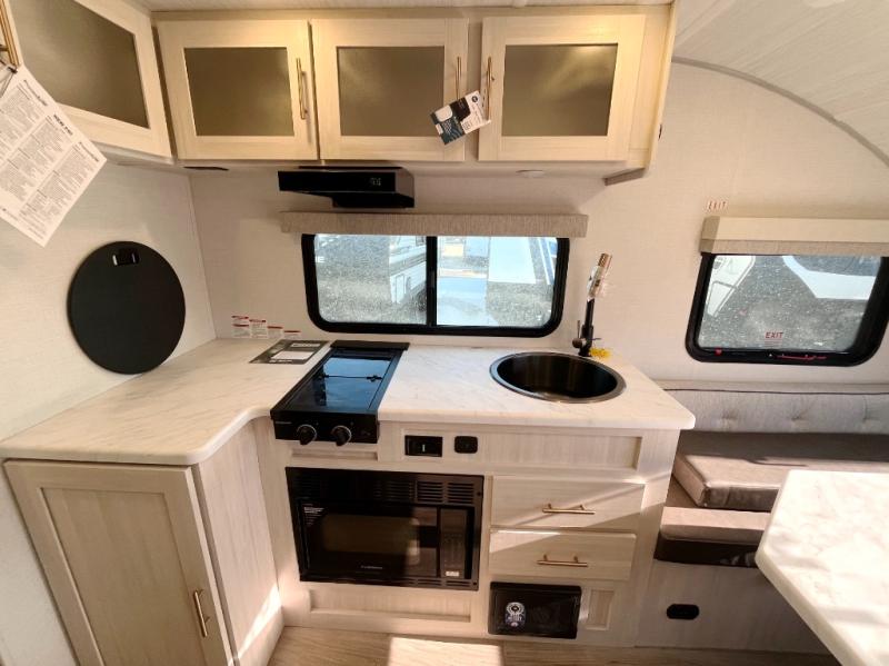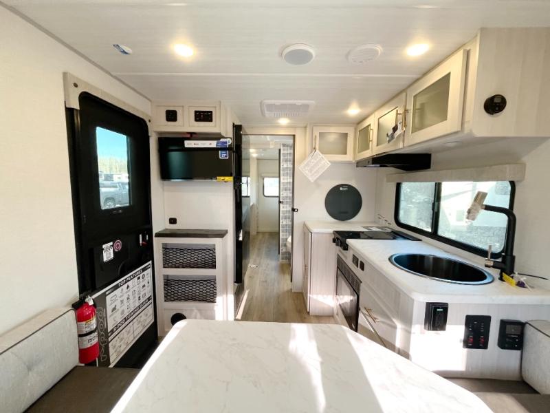 Time spent in this travel trailer will be time well spent! You will have all the comforts of home, including a private bedroom with two wardrobes, a queen bed, and a desk/dresser that will allow you to get some work done if needed. The front U-shaped dinette with a swivel dinette table will double as dining and sleeping space, and the walk-through bath will be easily accessible for everyone to use. You can prepare meals on the two-burner cooktop or use the air fryer microwave. There is also a 12V black glass 12V refrigerator for food storage and plenty of counter space to prep meals.