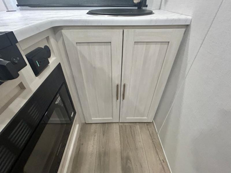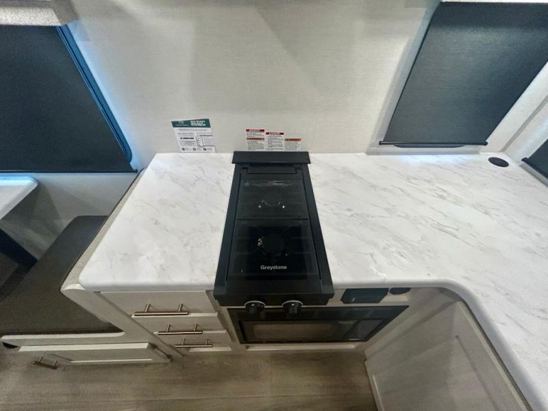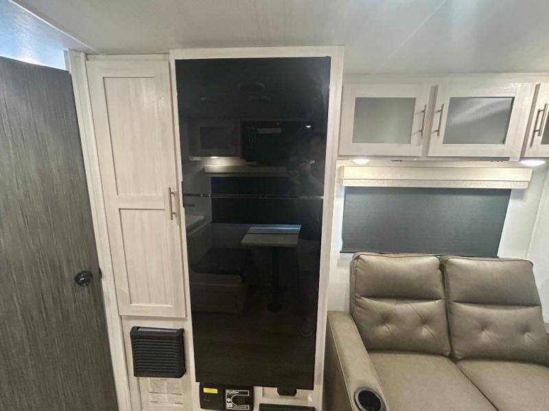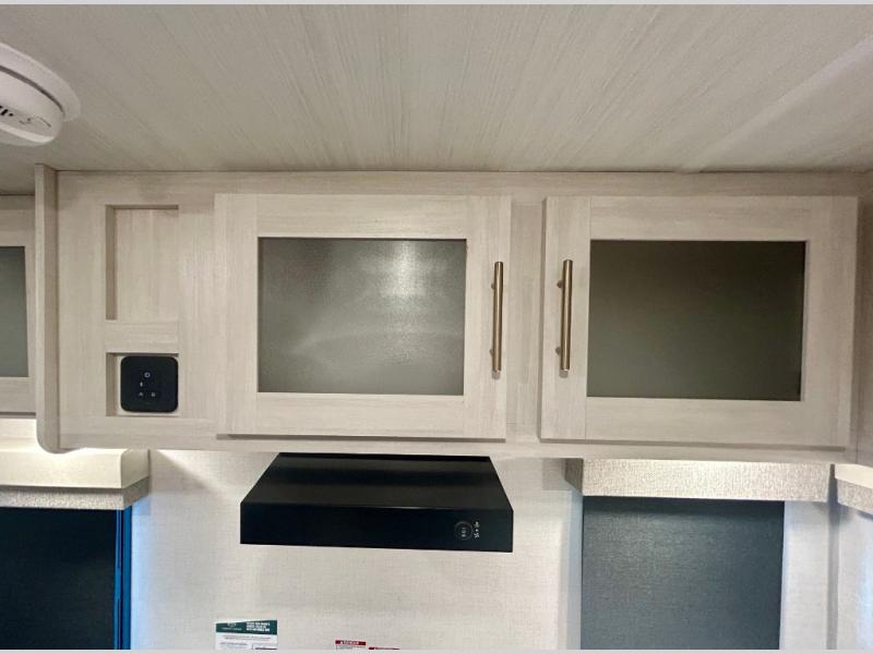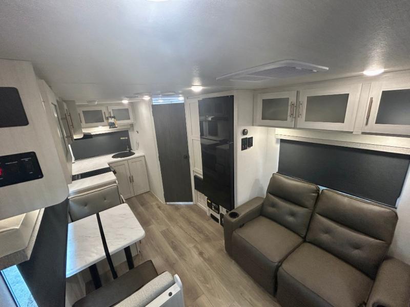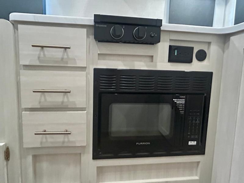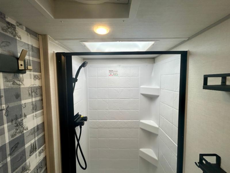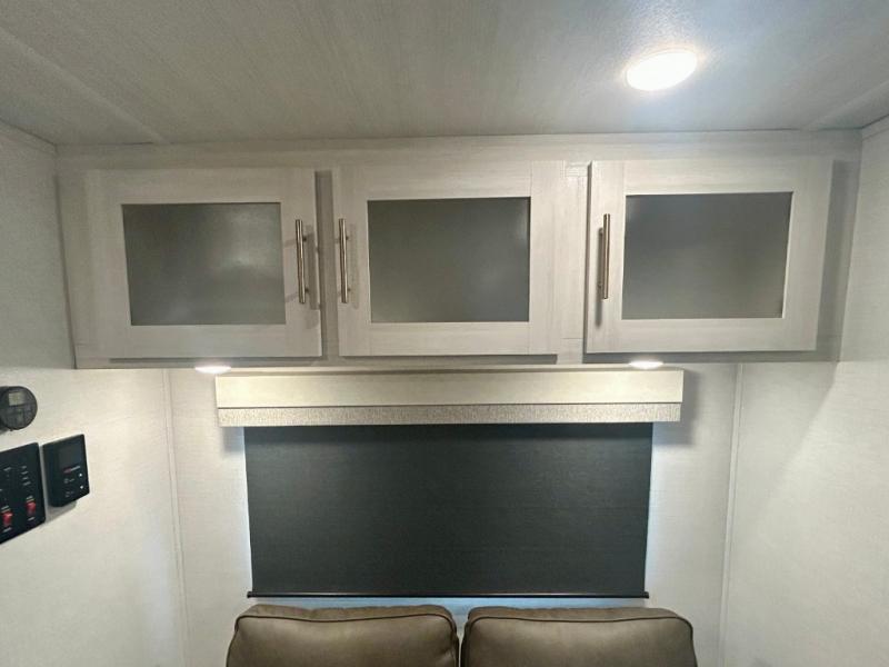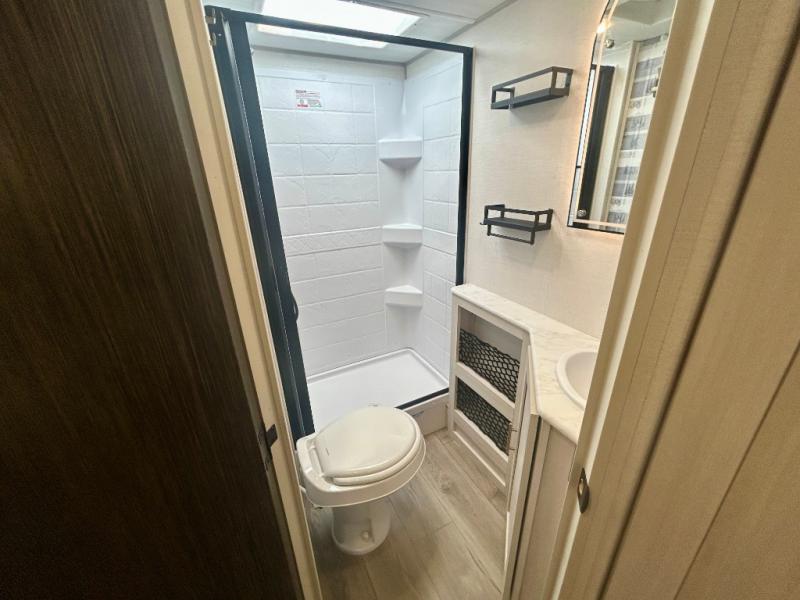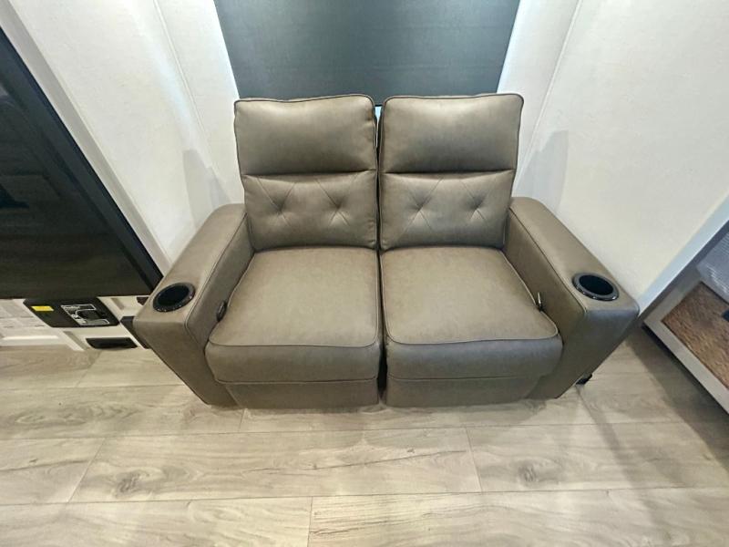 A private bedroom with a walk-around queen bed, a full bath, and sleeping space for guests are a few of the features that you are sure to want in your next RV! You can rest comfortably each night, plus all your clothing can be stored in the dual wardrobes to keep everything tidy. The chef of your group can make meals on the two burner cooktop or in the convection microwave, and there is a 12V black glass refrigerator for perishables. You can relax on the theater seat each evening, and if you're needing additional sleeping space, just choose the optional tri-fold sofa!