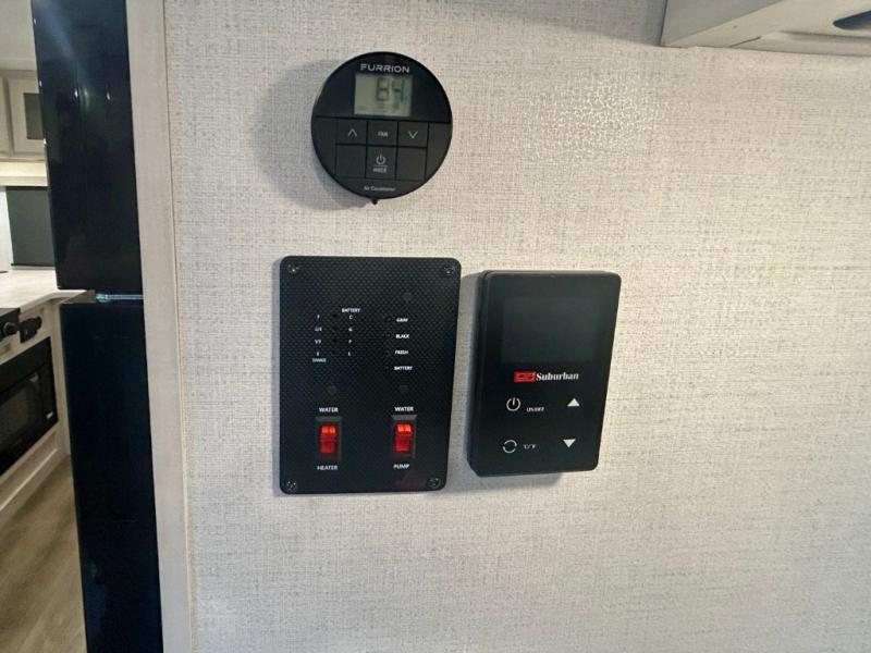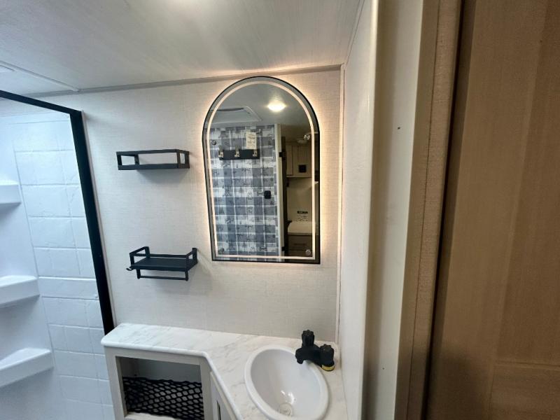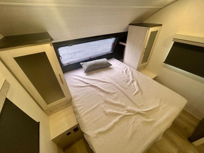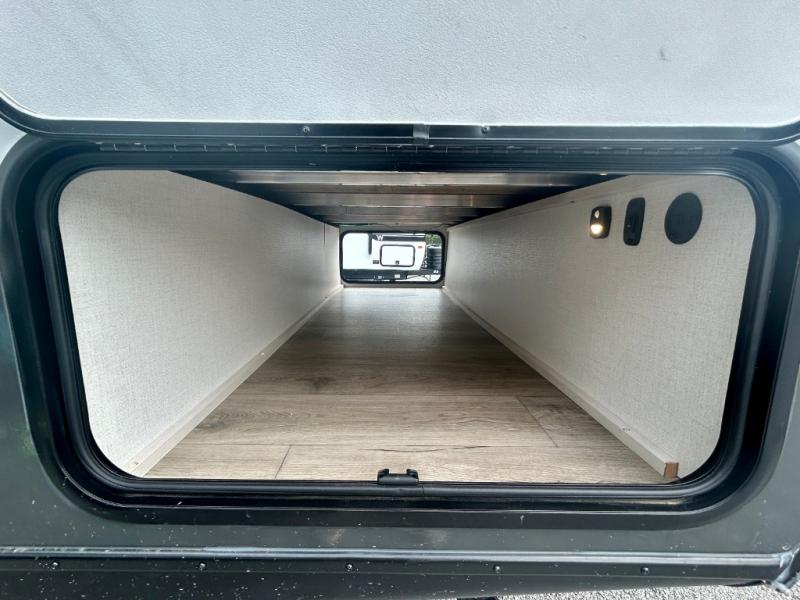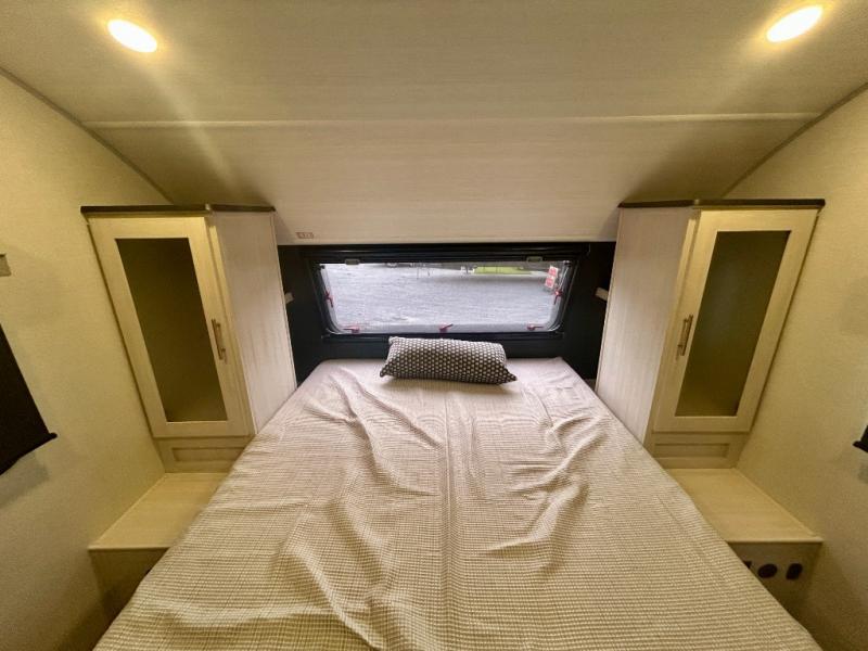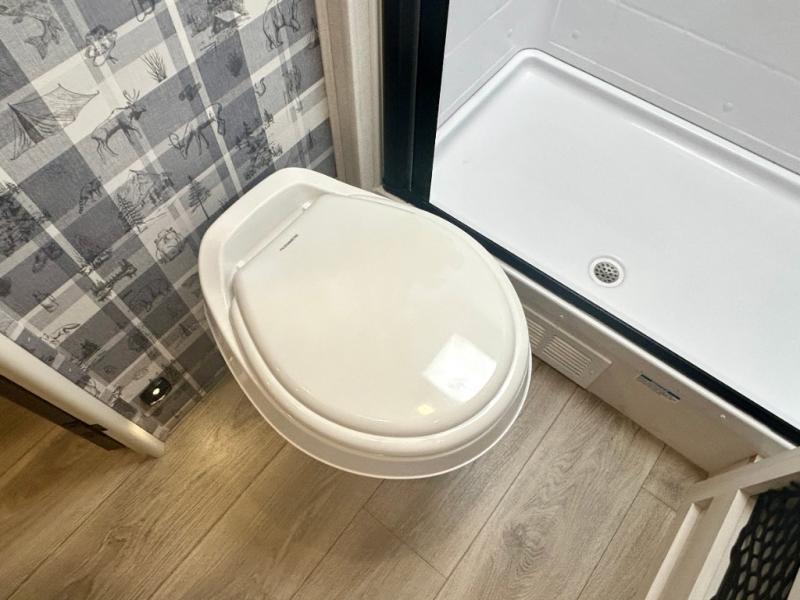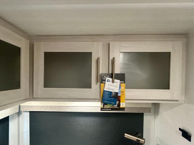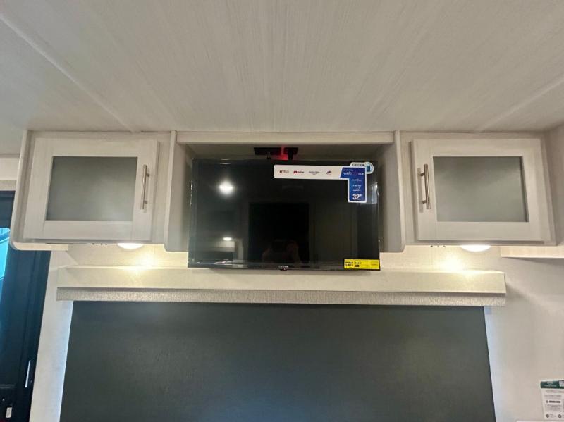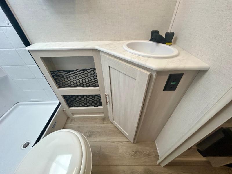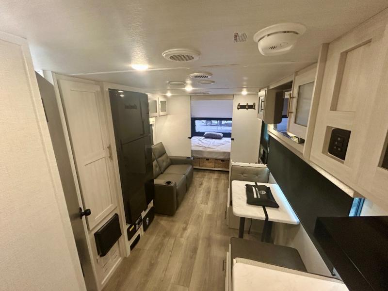 A private bedroom with a walk-around queen bed, a full bath, and sleeping space for guests are a few of the features that you are sure to want in your next RV! You can rest comfortably each night, plus all your clothing can be stored in the dual wardrobes to keep everything tidy. The chef of your group can make meals on the two burner cooktop or in the convection microwave, and there is a 12V black glass refrigerator for perishables. You can relax on the theater seat each evening, and if you're needing additional sleeping space, just choose the optional tri-fold sofa!