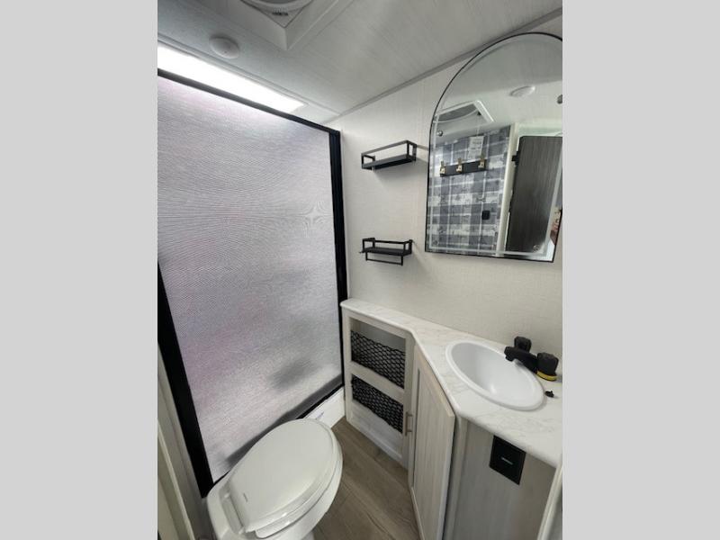 A private bedroom with a walk-around queen bed, a full bath, and sleeping space for guests are a few of the features that you are sure to want in your next RV! You can rest comfortably each night, plus all your clothing can be stored in the dual wardrobes to keep everything tidy. The chef of your group can make meals on the two burner cooktop or in the convection microwave, and there is a 12V black glass refrigerator for perishables. You can relax on the theater seat each evening, and if you're needing additional sleeping space, just choose the optional tri-fold sofa!