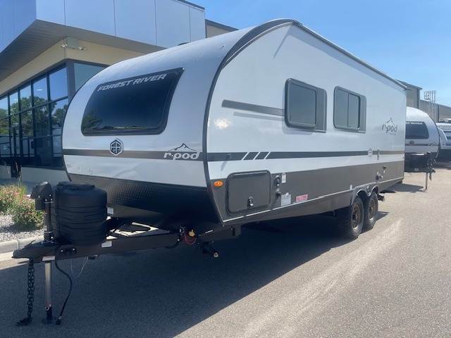 With any R-Pod travel trailer by Forest River, you will enjoy affordable luxury at the lowest tow weight in its class! There is a sealed underbelly with forced heat, a curved dual-pane acrylic front window with a bug screen and night shade, plus a large roof mounted solar panel for off-grid capabilities. The 15K A/C unit will keep you comfortable during the summer camping months, and the tankless water heater will provide endless hot showers after hiking, biking, swimming and more! Each model also includes a black glass friction hinge entrance door, roof ladder prep, exterior motion lighting, plus a hot and cold exterior spray port to wash off sand from the beach. Inside, you'll enjoy seamless Surf-X kitchen countertops, blackout roller shades, and a central vacuum system for hassle-free cleaning!