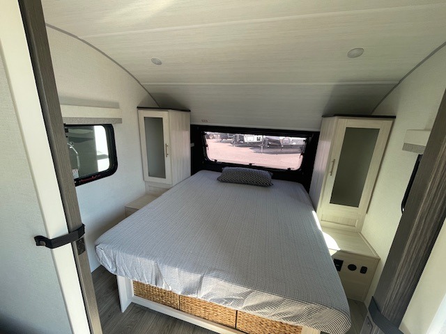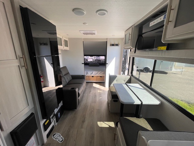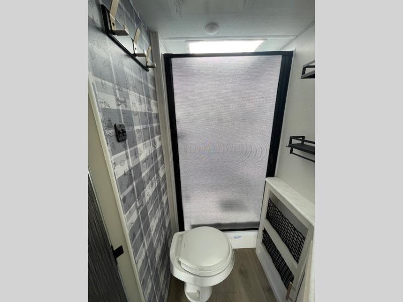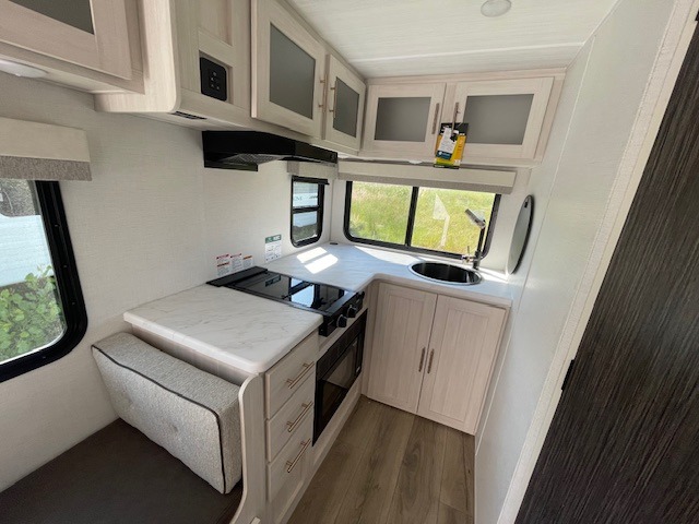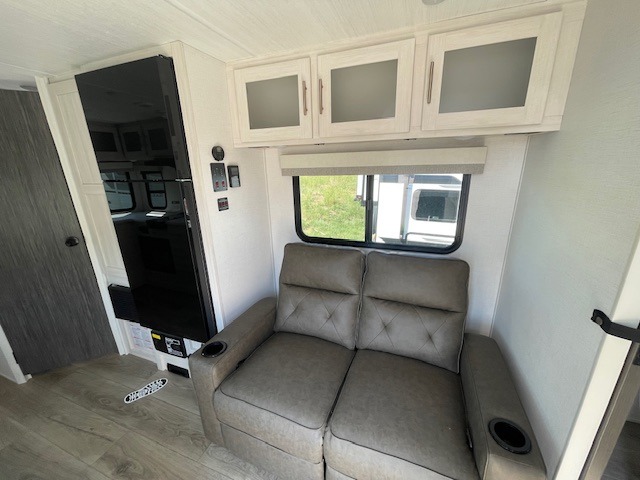 A private bedroom with a walk-around queen bed, a full bath, and sleeping space for guests are a few of the features that you are sure to want in your next RV! You can rest comfortably each night, plus all your clothing can be stored in the dual wardrobes to keep everything tidy. The chef of your group can make meals on the two burner cooktop or in the convection microwave, and there is a 12V black glass refrigerator for perishables. You can relax on the theater seat each evening, and if you're needing additional sleeping space, just choose the optional tri-fold sofa!