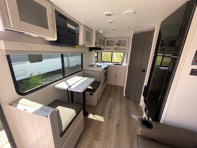 With any R-Pod travel trailer by Forest River, you will enjoy affordable luxury at the lowest tow weight in its class! There is a sealed underbelly with forced heat, a curved dual-pane acrylic front window with a bug screen and night shade, plus a large roof mounted solar panel for off-grid capabilities. The 15K A/C unit will keep you comfortable during the summer camping months, and the tankless water heater will provide endless hot showers after hiking, biking, swimming and more! Each model also includes a black glass friction hinge entrance door, roof ladder prep, exterior motion lighting, plus a hot and cold exterior spray port to wash off sand from the beach. Inside, you'll enjoy seamless Surf-X kitchen countertops, blackout roller shades, and a central vacuum system for hassle-free cleaning!