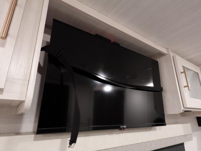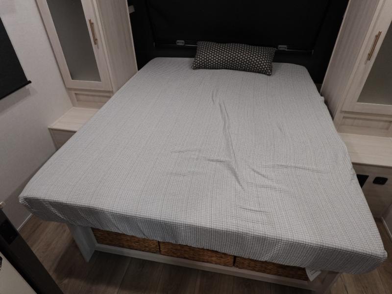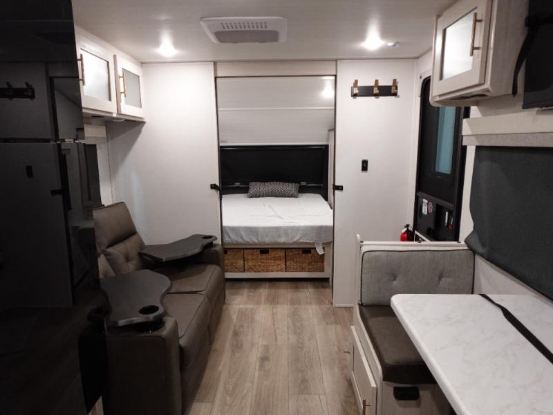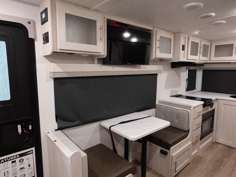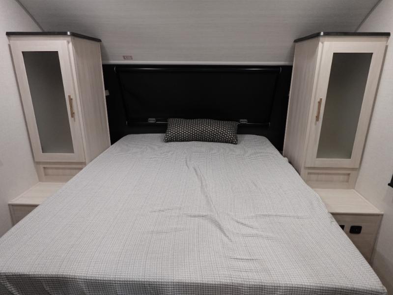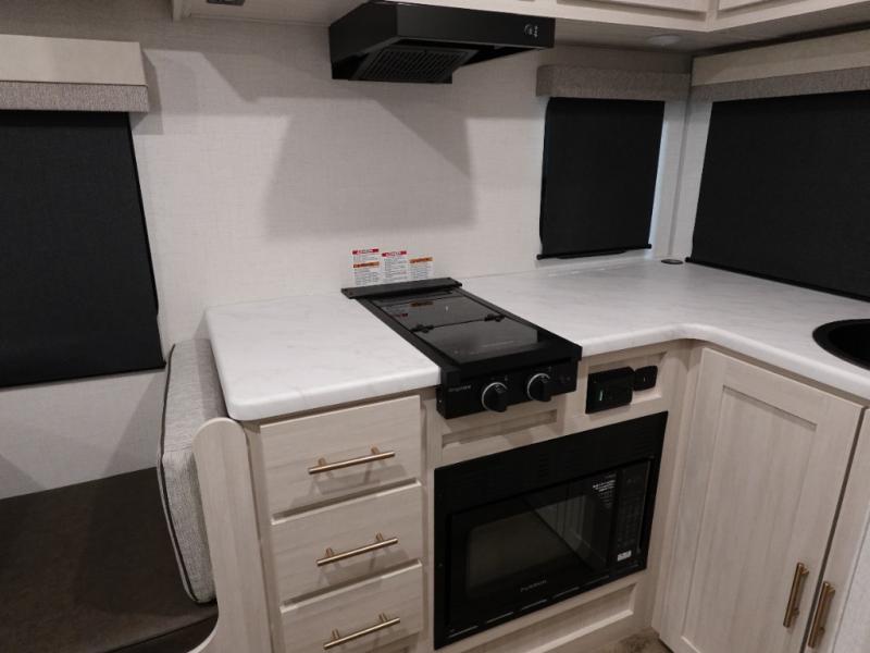 A private bedroom with a walk-around queen bed, a full bath, and sleeping space for guests are a few of the features that you are sure to want in your next RV! You can rest comfortably each night, plus all your clothing can be stored in the dual wardrobes to keep everything tidy. The chef of your group can make meals on the two burner cooktop or in the convection microwave, and there is a 12V black glass refrigerator for perishables.