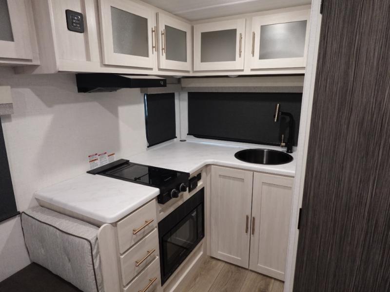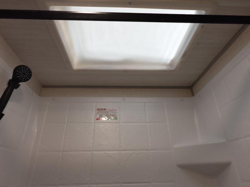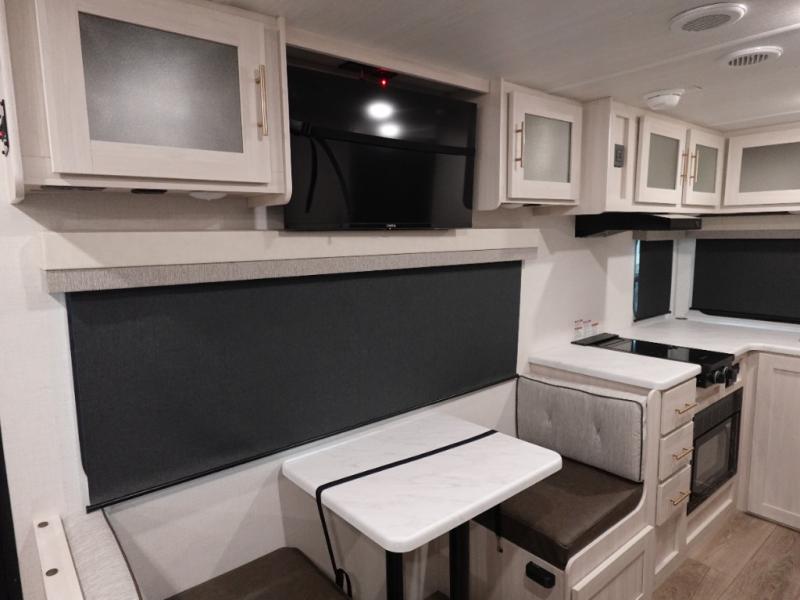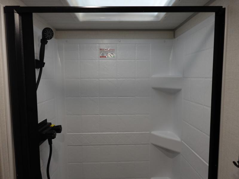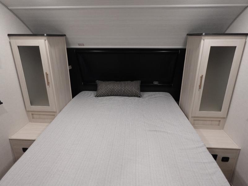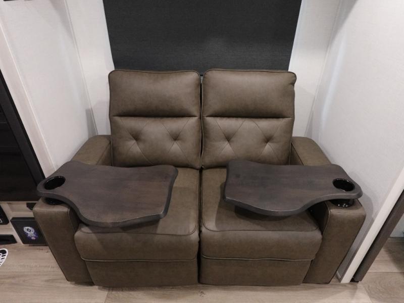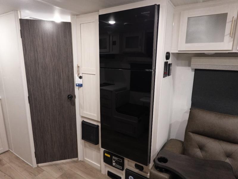 A private bedroom with a walk-around queen bed, a full bath, and sleeping space for guests are a few of the features that you are sure to want in your next RV! You can rest comfortably each night, plus all your clothing can be stored in the dual wardrobes to keep everything tidy. The chef of your group can make meals on the two burner cooktop or in the convection microwave, and there is a 12V black glass refrigerator for perishables. You can relax on the theater seat each evening.