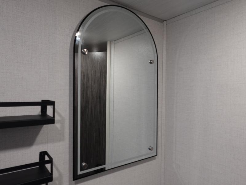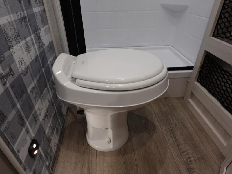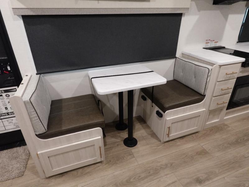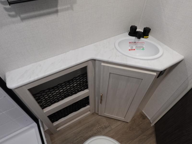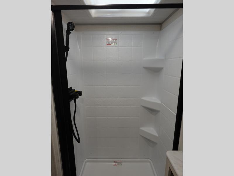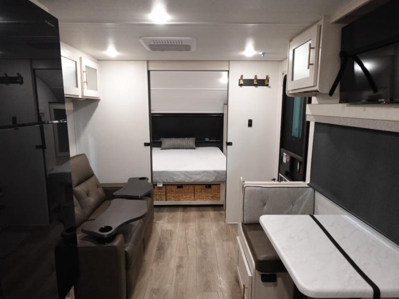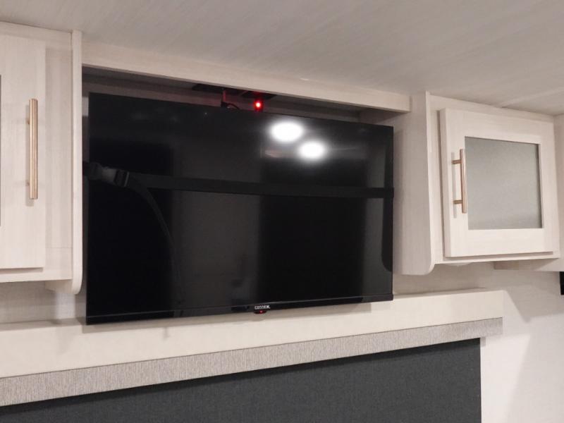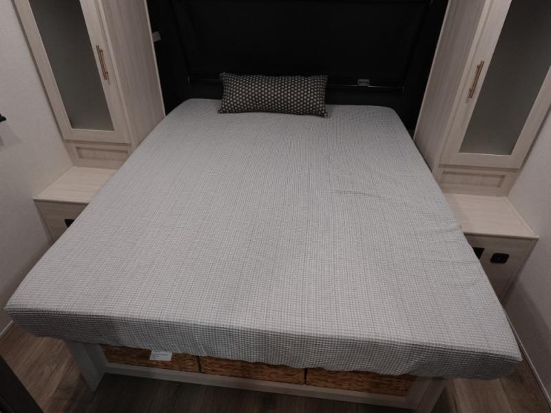 A private bedroom with a walk-around queen bed, a full bath, and sleeping space for guests are a few of the features that you are sure to want in your next RV! You can rest comfortably each night, plus all your clothing can be stored in the dual wardrobes to keep everything tidy. The chef of your group can make meals on the two burner cooktop or in the convection microwave, and there is a 12V black glass refrigerator for perishables. You can relax on the theater seat each evening.