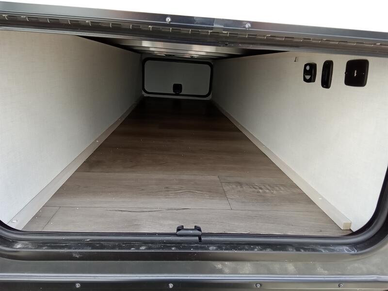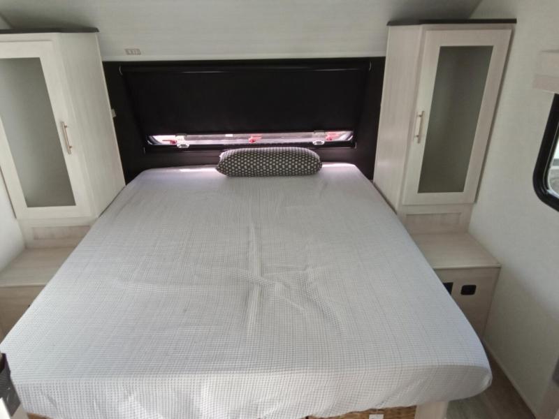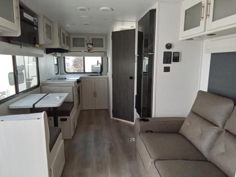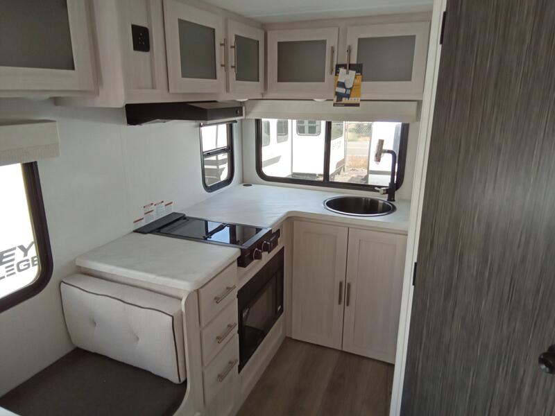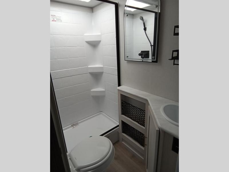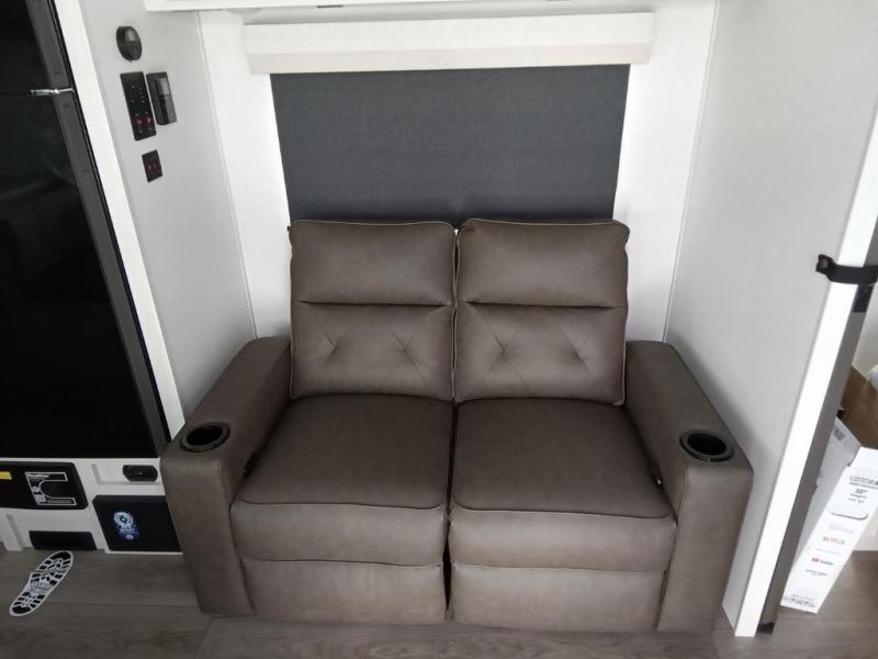 A private bedroom with a walk-around queen bed, a full bath, and sleeping space for guests are a few of the features that you are sure to want in your next RV! You can rest comfortably each night, plus all your clothing can be stored in the dual wardrobes to keep everything tidy. The chef of your group can make meals on the two burner cooktop or in the convection microwave, and there is a 12V black glass refrigerator for perishables. You can relax on the theater seat each evening, and if you're needing additional sleeping space, just choose the optional tri-fold sofa!