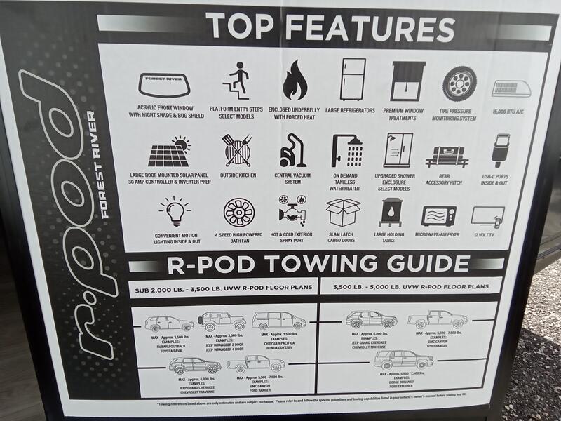 With any R-Pod travel trailer by Forest River, you will enjoy affordable luxury at the lowest tow weight in its class! There is a sealed underbelly with forced heat, a curved dual-pane acrylic front window with a bug screen and night shade, plus a large roof mounted solar panel for off-grid capabilities. The 15K A/C unit will keep you comfortable during the summer camping months, and the tankless water heater will provide endless hot showers after hiking, biking, swimming and more! Each model also includes a black glass friction hinge entrance door, roof ladder prep, exterior motion lighting, plus a hot and cold exterior spray port to wash off sand from the beach. Inside, you'll enjoy seamless Surf-X kitchen countertops, blackout roller shades, and a central vacuum system for hassle-free cleaning!