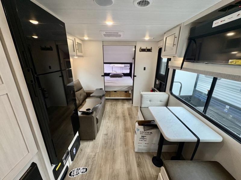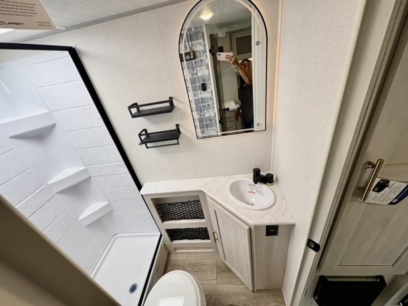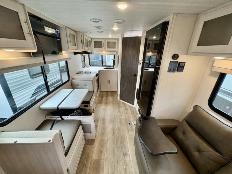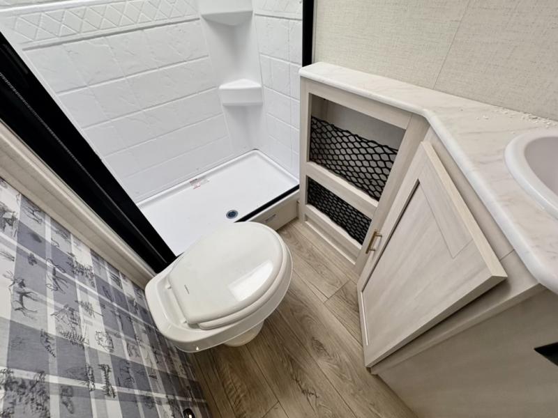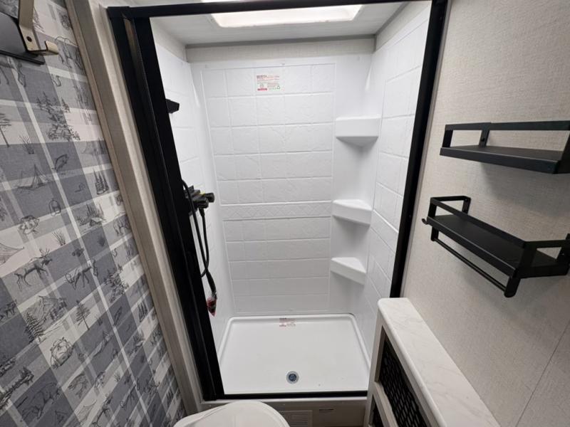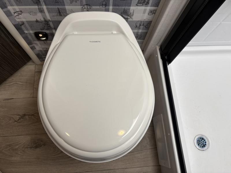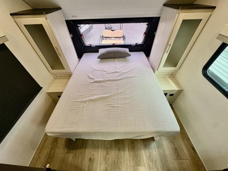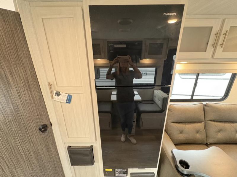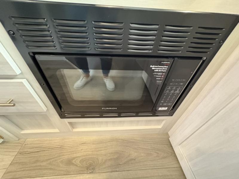 A private bedroom with a walk-around queen bed, a full bath, and sleeping space for guests are a few of the features that you are sure to want in your next RV! You can rest comfortably each night, plus all your clothing can be stored in the dual wardrobes to keep everything tidy. The chef of your group can make meals on the two burner cooktop or in the convection microwave, and there is a 12V black glass refrigerator for perishables. You can relax on the theater seat each evening, and if you're needing additional sleeping space, just choose the optional tri-fold sofa!