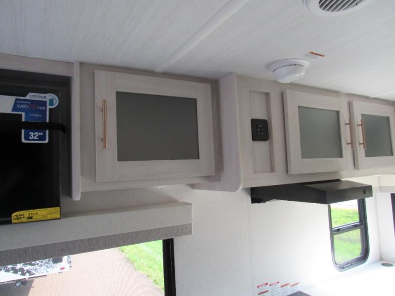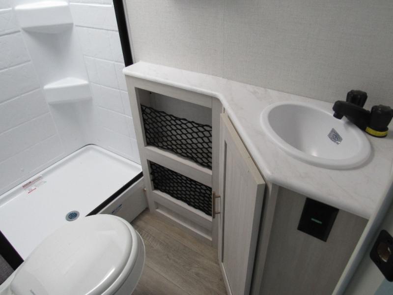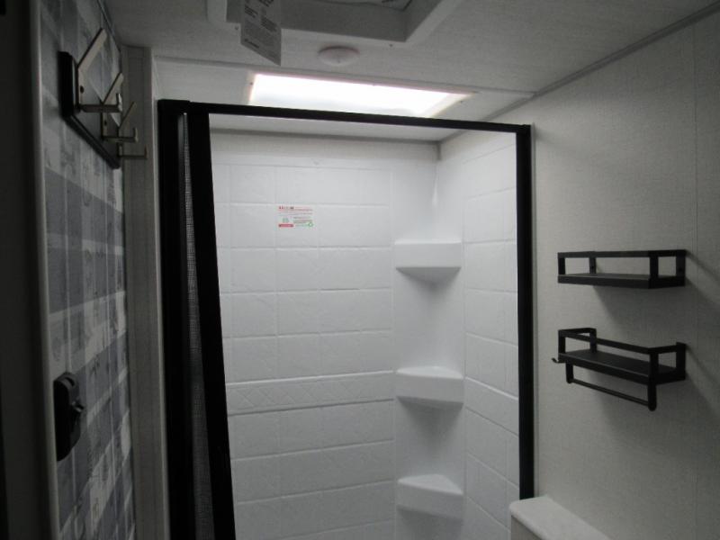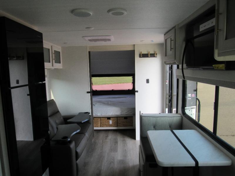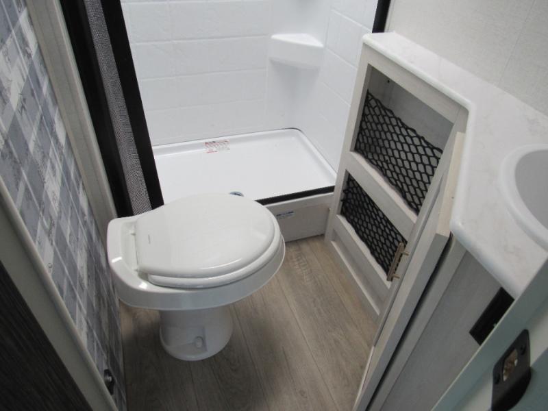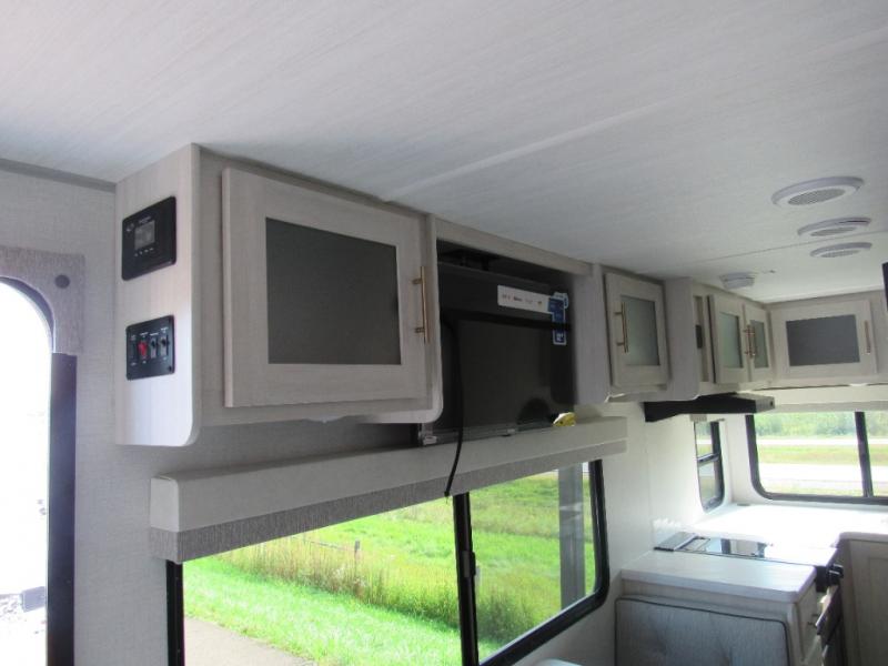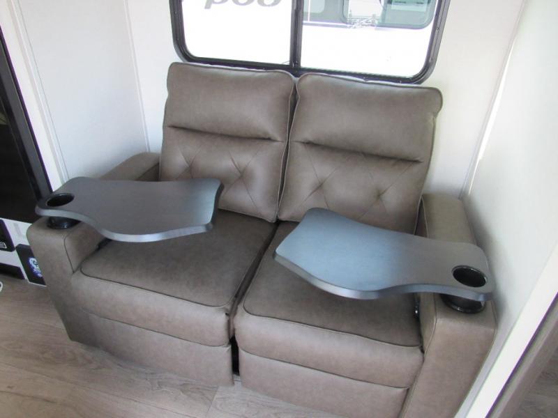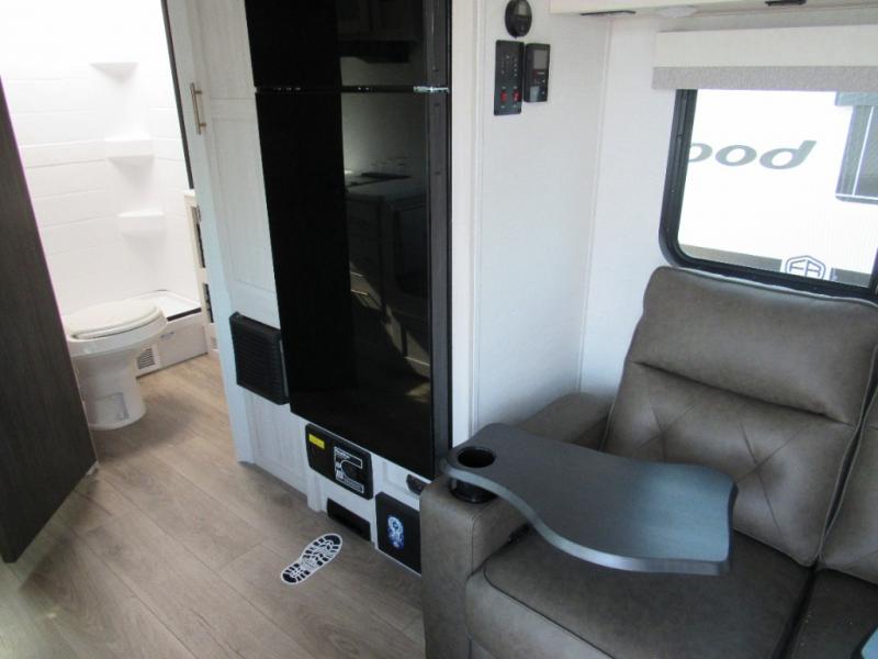 A private bedroom with a walk-around queen bed, a full bath, and sleeping space for guests are a few of the features that you are sure to want in your next RV! You can rest comfortably each night, plus all your clothing can be stored in the dual wardrobes to keep everything tidy. The chef of your group can make meals on the two burner cooktop or in the convection microwave, and there is a 12V black glass refrigerator for perishables. You can relax on the theater seat each evening, and if you're needing additional sleeping space, just choose the optional tri-fold sofa!