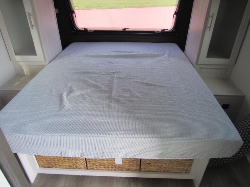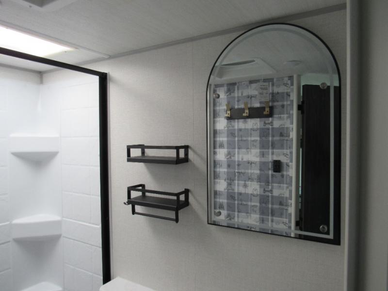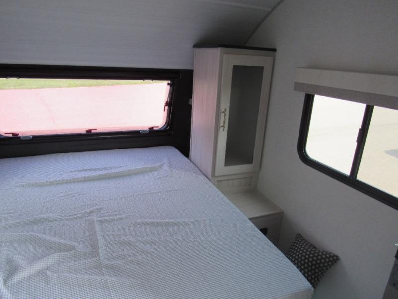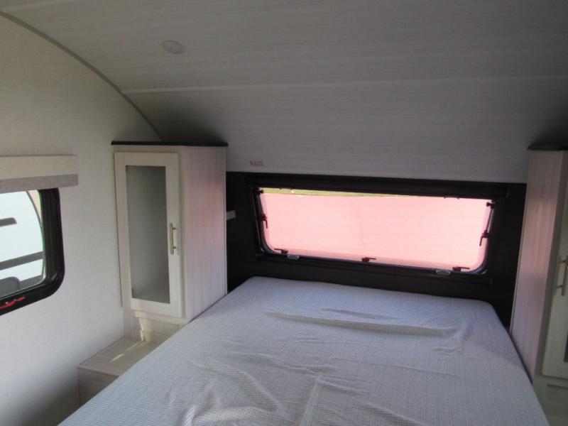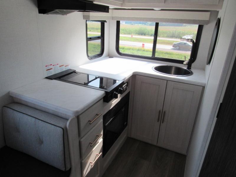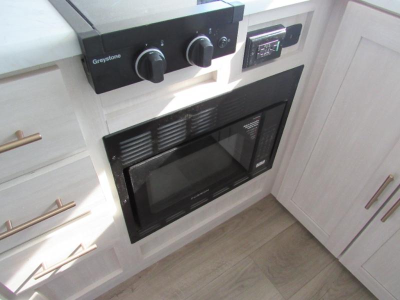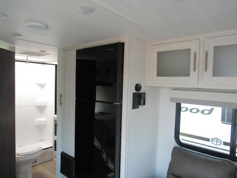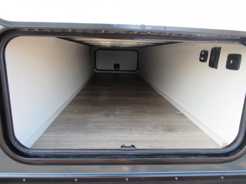 A private bedroom with a walk-around queen bed, a full bath, and sleeping space for guests are a few of the features that you are sure to want in your next RV! You can rest comfortably each night, plus all your clothing can be stored in the dual wardrobes to keep everything tidy. The chef of your group can make meals on the two burner cooktop or in the convection microwave, and there is a 12V black glass refrigerator for perishables. You can relax on the theater seat each evening, and if you're needing additional sleeping space, just choose the optional tri-fold sofa!