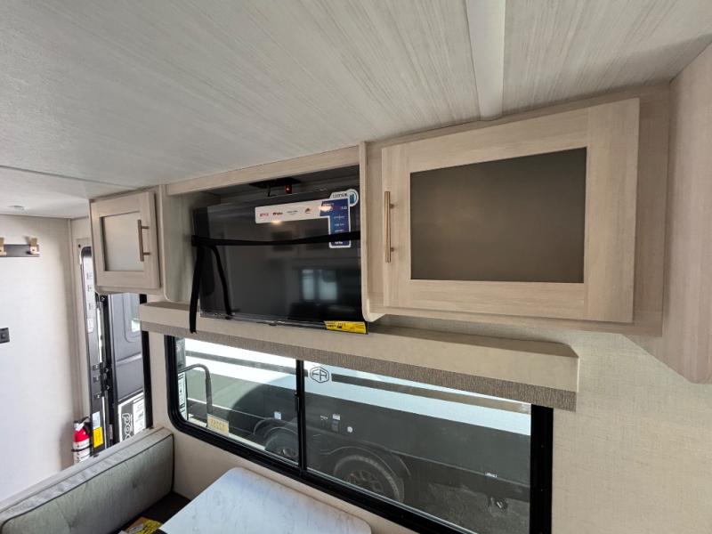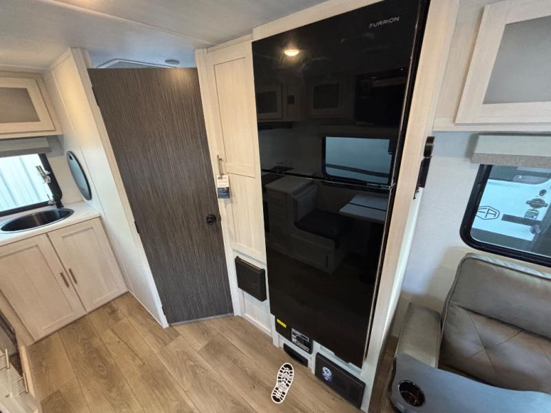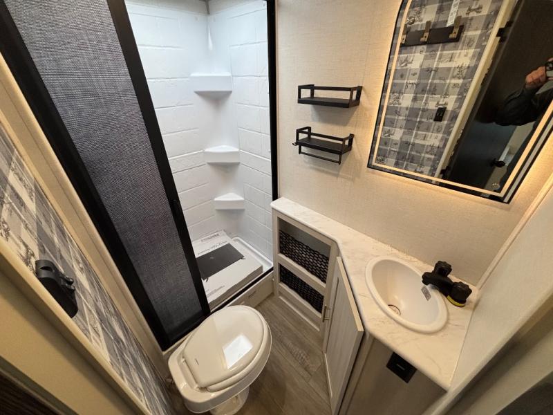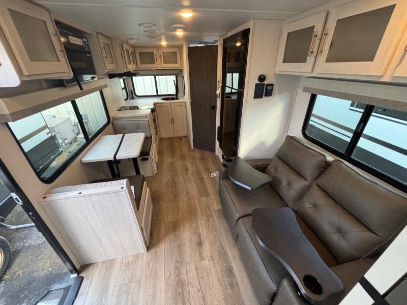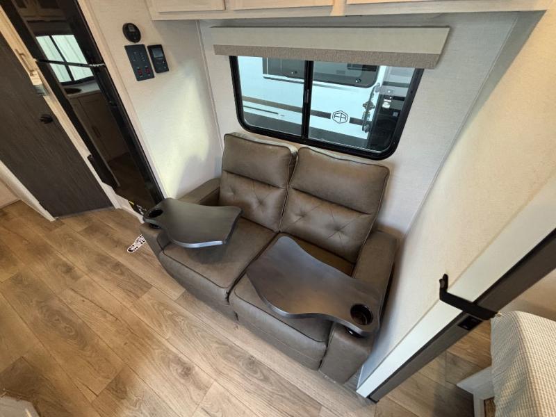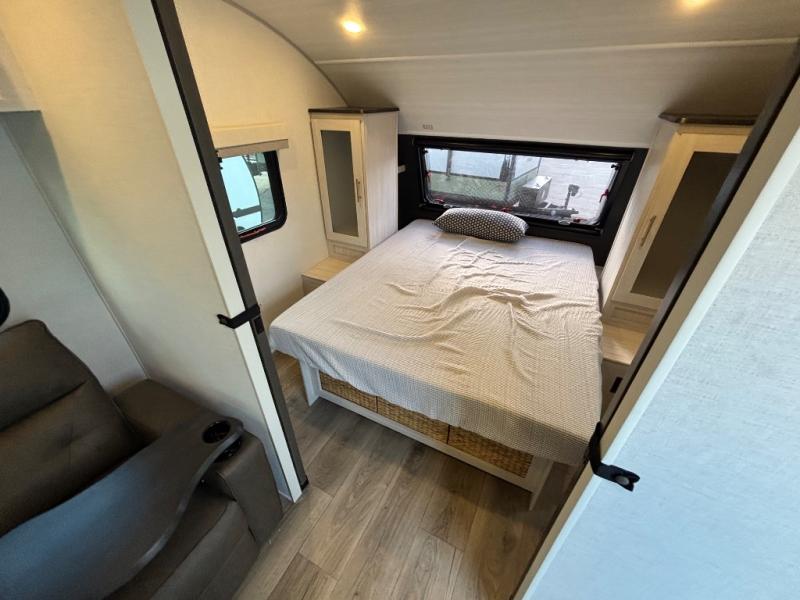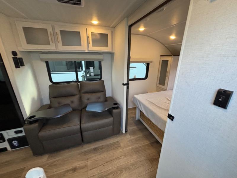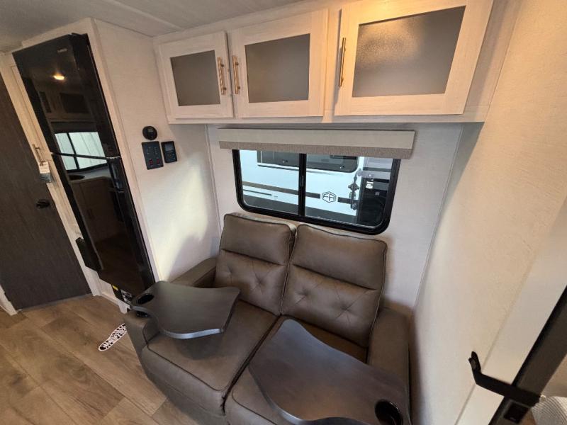 A private bedroom with a walk-around queen bed, a full bath, and sleeping space for guests are a few of the features that you are sure to want in your next RV! You can rest comfortably each night, plus all your clothing can be stored in the dual wardrobes to keep everything tidy. The chef of your group can make meals on the two burner cooktop or in the convection microwave, and there is a 12V black glass refrigerator for perishables. You can relax on the theater seat each evening, and if you're needing additional sleeping space, just choose the optional tri-fold sofa!