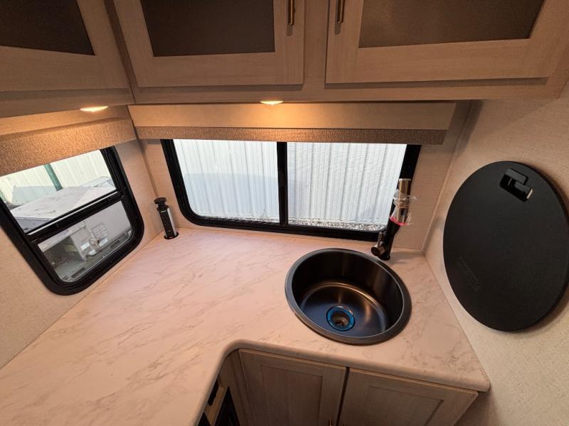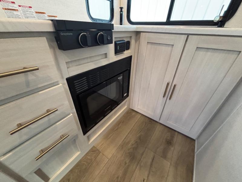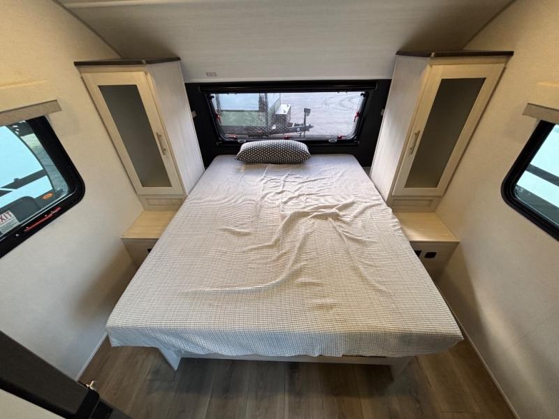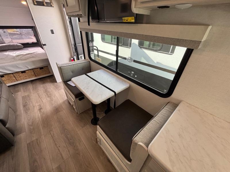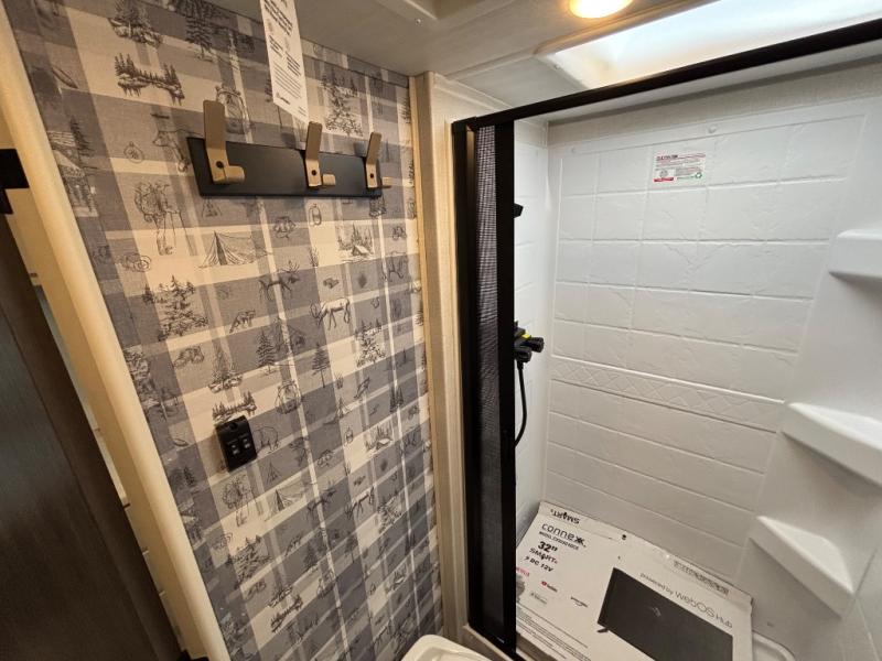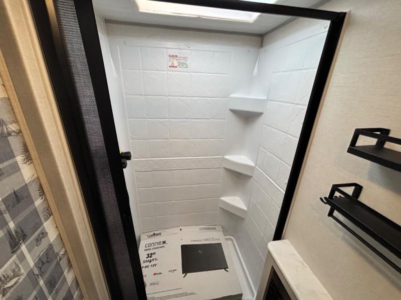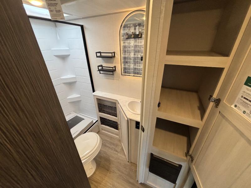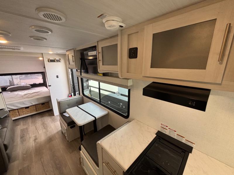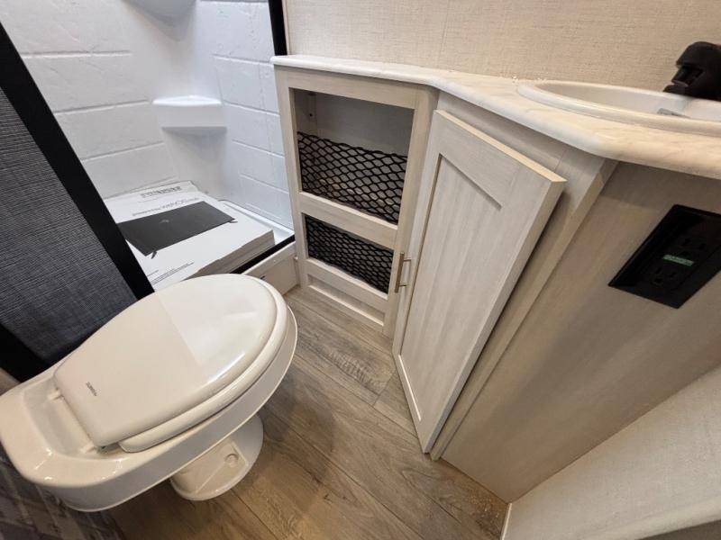 A private bedroom with a walk-around queen bed, a full bath, and sleeping space for guests are a few of the features that you are sure to want in your next RV! You can rest comfortably each night, plus all your clothing can be stored in the dual wardrobes to keep everything tidy. The chef of your group can make meals on the two burner cooktop or in the convection microwave, and there is a 12V black glass refrigerator for perishables. You can relax on the theater seat each evening, and if you're needing additional sleeping space, just choose the optional tri-fold sofa!