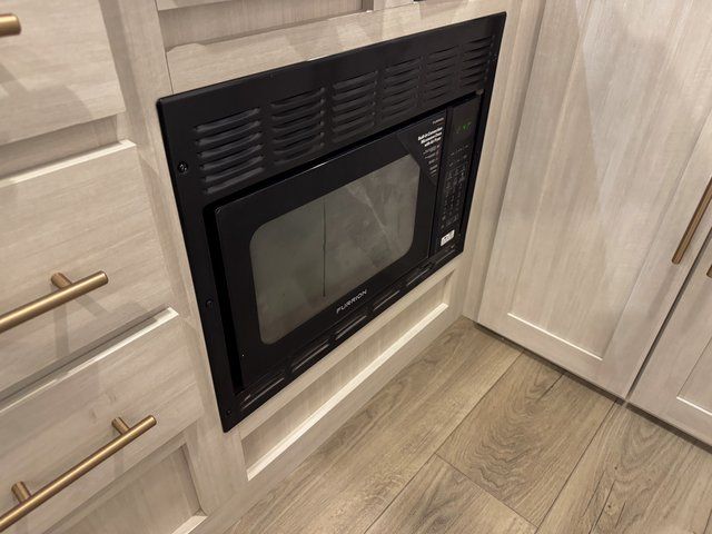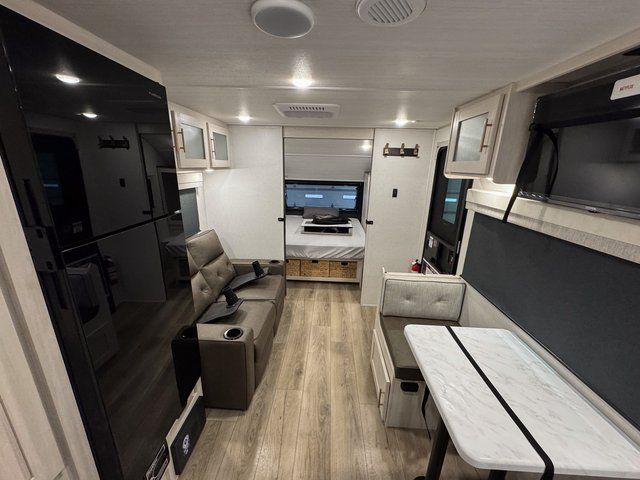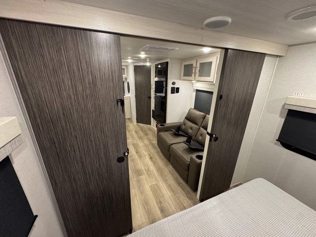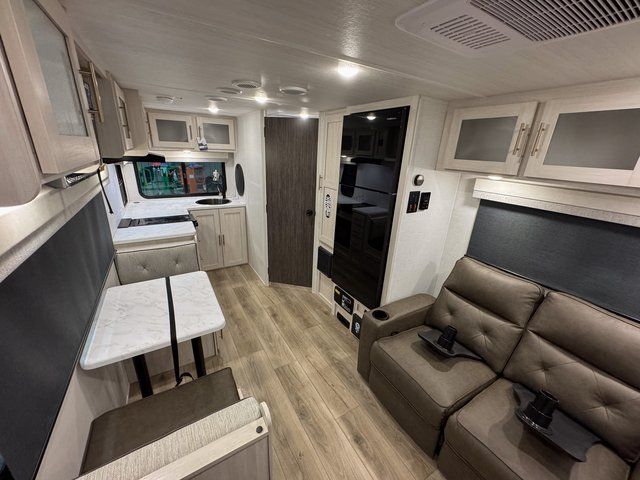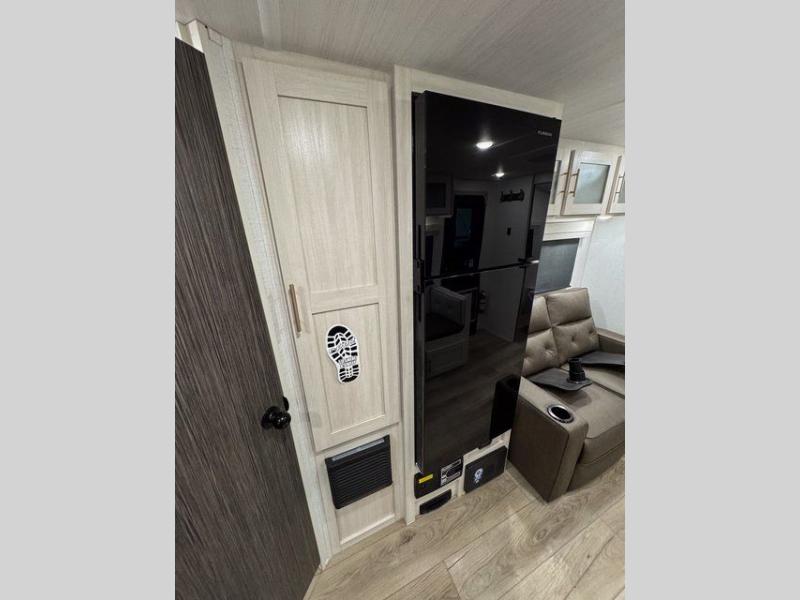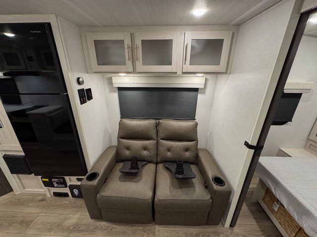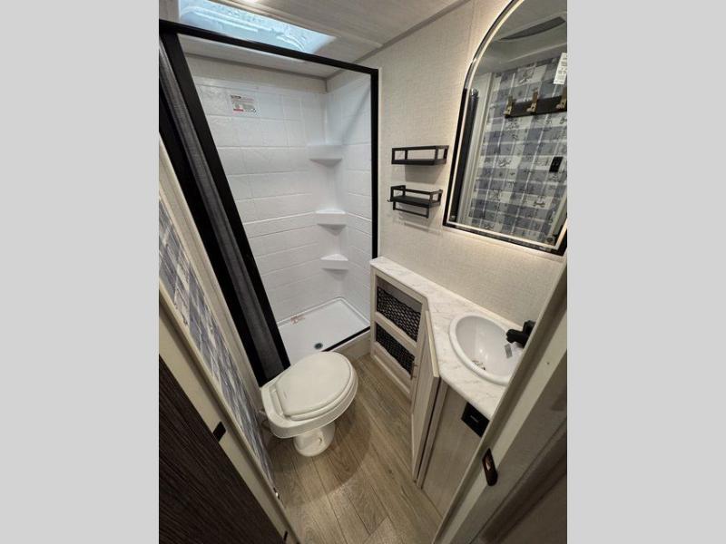 A private bedroom with a walk-around queen bed, a full bath, and sleeping space for guests are a few of the features that you are sure to want in your next RV! You can rest comfortably each night, plus all your clothing can be stored in the dual wardrobes to keep everything tidy. The chef of your group can make meals on the two burner cooktop or in the convection microwave, and there is a 12V black glass refrigerator for perishables. You can relax on the theater seat each evening, and if you're needing additional sleeping space, just choose the optional tri-fold sofa!