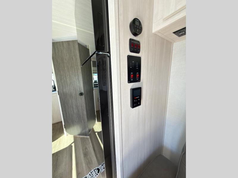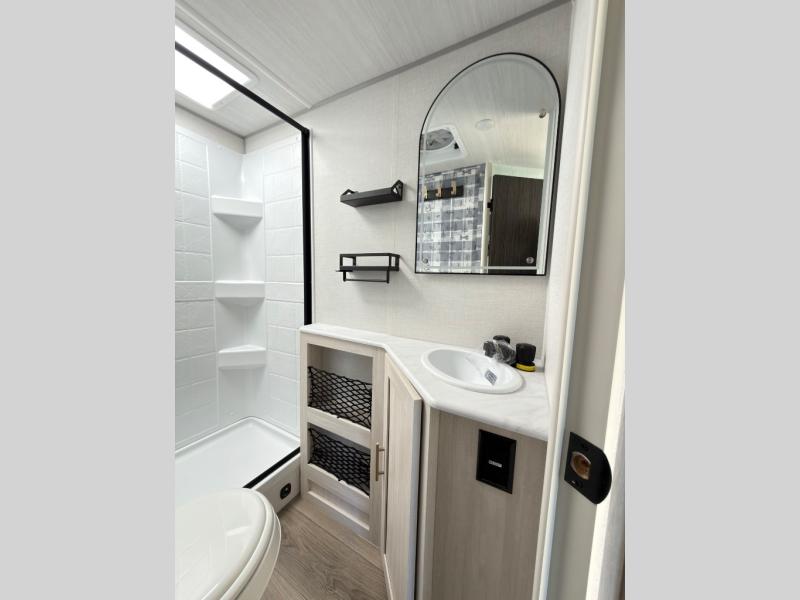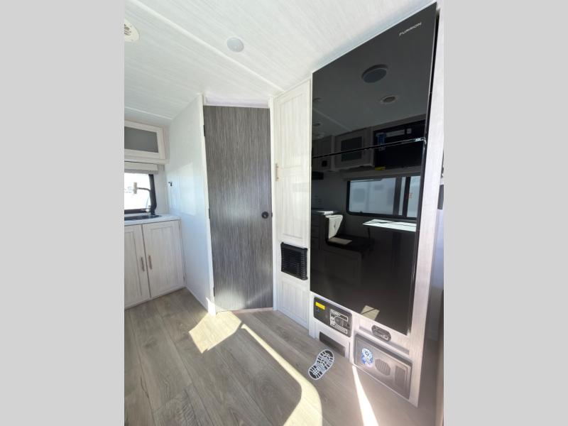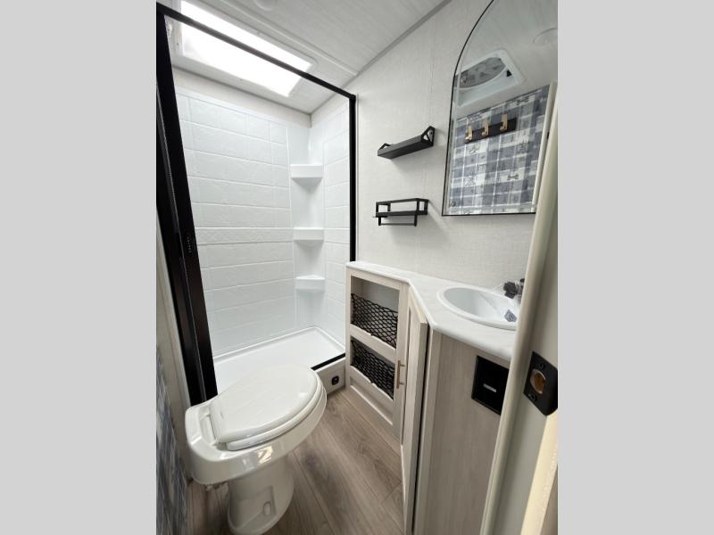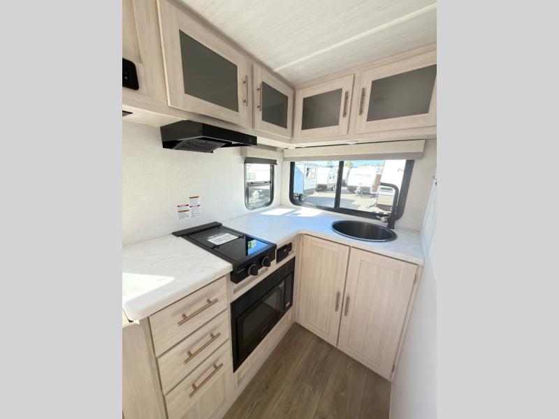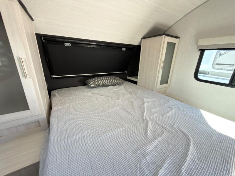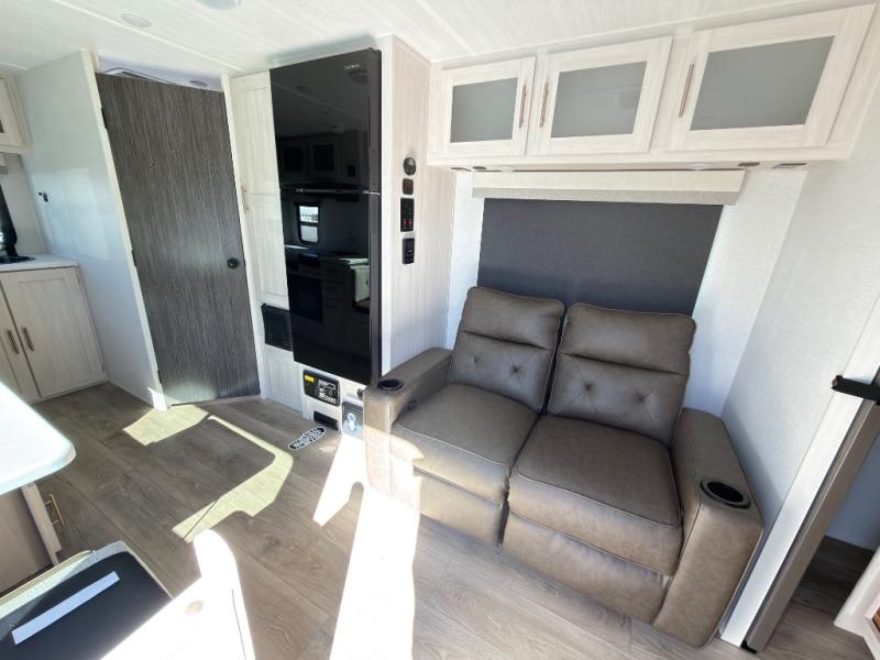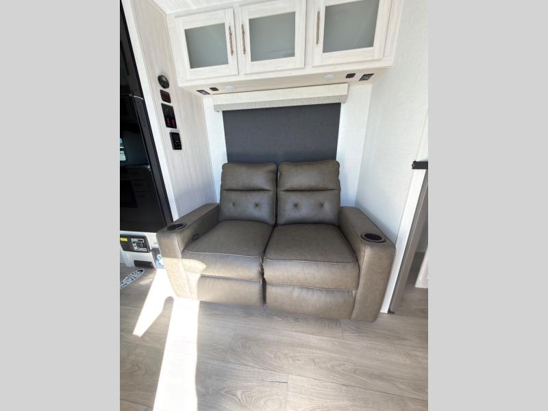 A private bedroom with a walk-around queen bed, a full bath, and sleeping space for guests are a few of the features that you are sure to want in your next RV! You can rest comfortably each night, plus all your clothing can be stored in the dual wardrobes to keep everything tidy. The chef of your group can make meals on the two burner cooktop or in the convection microwave, and there is a 12V black glass refrigerator for perishables. You can relax on the theater seat each evening, or choose the optional tri-fold sofa if you're needing more sleeping space.