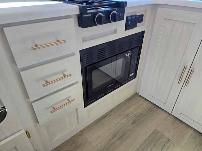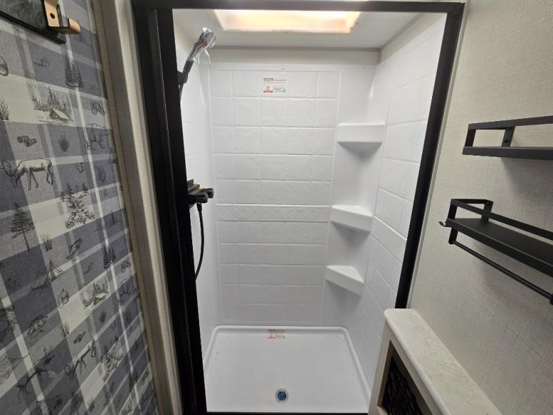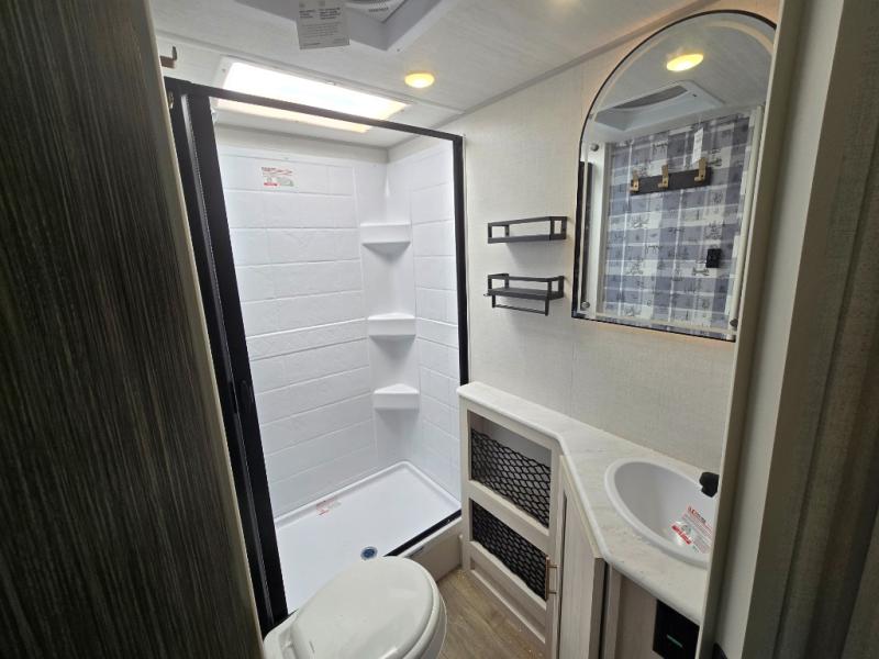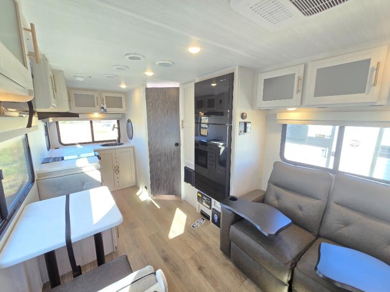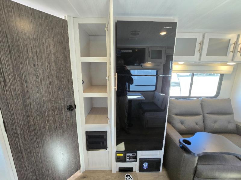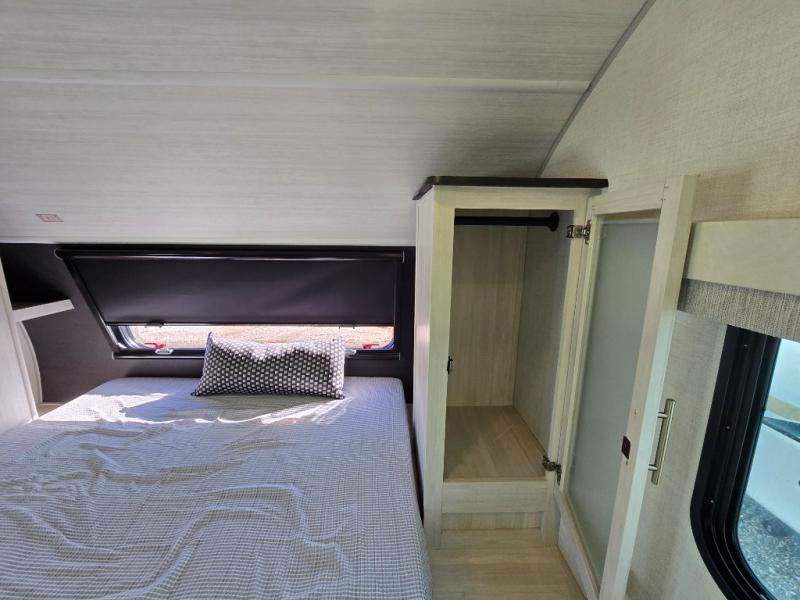 A private bedroom with a walk-around queen bed, a full bath, and sleeping space for guests are a few of the features that you are sure to want in your next RV! You can rest comfortably each night, plus all your clothing can be stored in the dual wardrobes to keep everything tidy. The chef of your group can make meals on the two burner cooktop or in the convection microwave, and there is a 12V black glass refrigerator for perishables. You can relax on the theater seat each evening, and if you're needing additional sleeping space, just choose the optional tri-fold sofa!